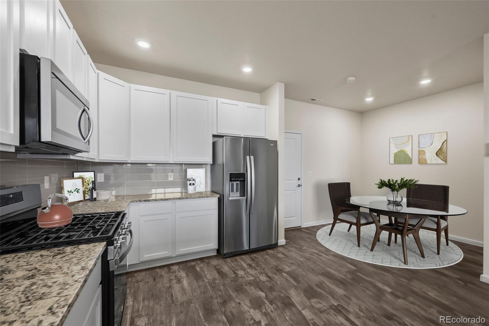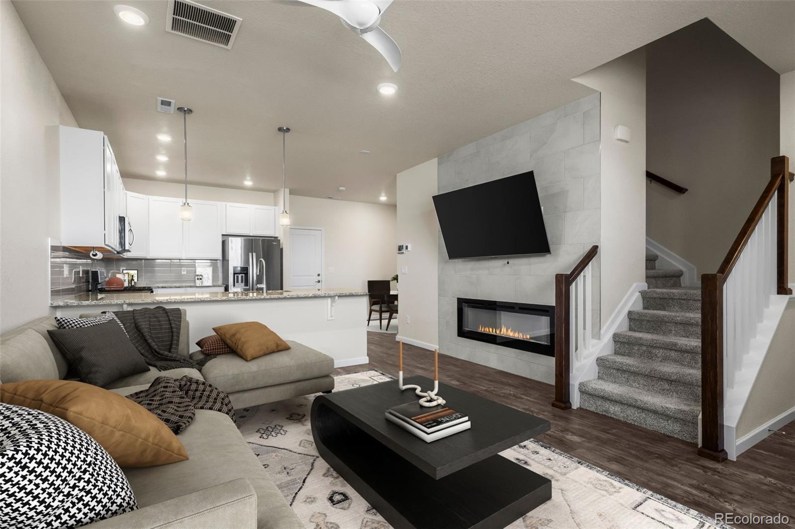 Welcome to this stunning 3-bedroom, 3-bath townhome built in 2022, ideally located within walking distance of charming downtown Erie* Enjoy an open, modern floor plan filled with natural light, perfect for relaxing or entertaining. The home includes a spacious 2-car garage, offering plenty of room for vehicles, bikes and storage* The gourmet kitchen features white 42 inch cabinets, granite countertops, a classic subway tile backsplash, stainless steel appliances, and a spacious bar peninsula. The inviting living area is highlighted by a sleek rectangular fireplace, luxury vinyl flooring, wide baseboards, 2-panel doors, and rich espresso stair railings that add warmth and style throughout* Retreat to the spacious primary suite with a spa-inspired 5-piece bathroom including dual sinks, soaking tub, walk-in shower, and large walk-in closet* Located in a beautifully maintained community offering snow removal, trash service, building maintenance, hazard insurance, a park, playground, trails, and access to a community pool* Commuters will appreciate the easy access to I-25 and E-470, with quick drivability to Boulder, Superior, Louisville, and Denver. Enjoy proximity to popular restaurants and unique shopping spots in downtown Erie — including local favorites such as 24 Carrot Bistro, Birdhouse, and Piripi. Charming boutiques like Charmed 33 Boutique and other locally owned shops add to the small-town appeal* The home and surrounding area boast breathtaking views of the Rocky Mountains, blending modern living with the beauty of Colorado* Don’t miss this opportunity to own a nearly new home in one of Erie’s most desirable locations!
