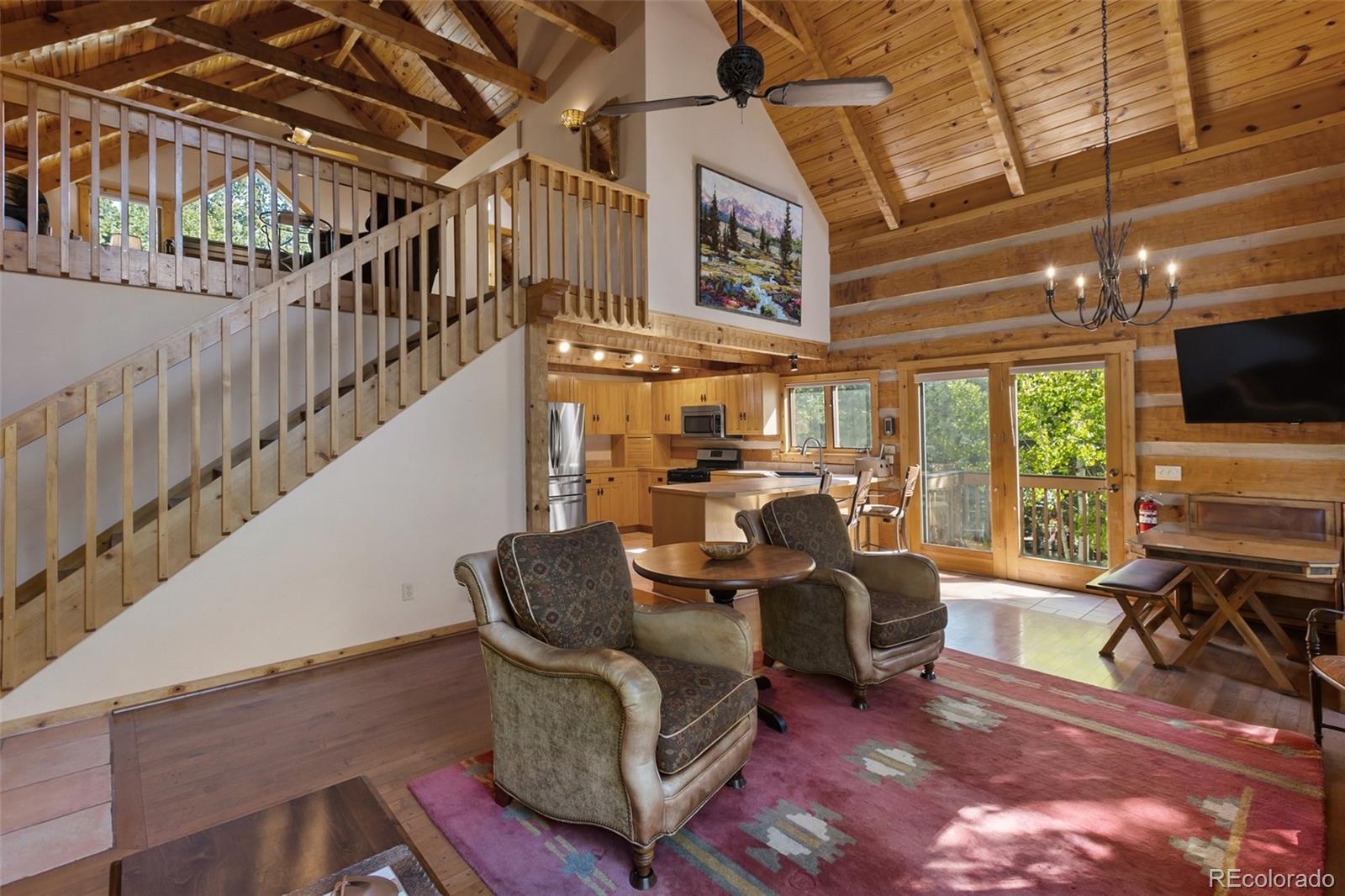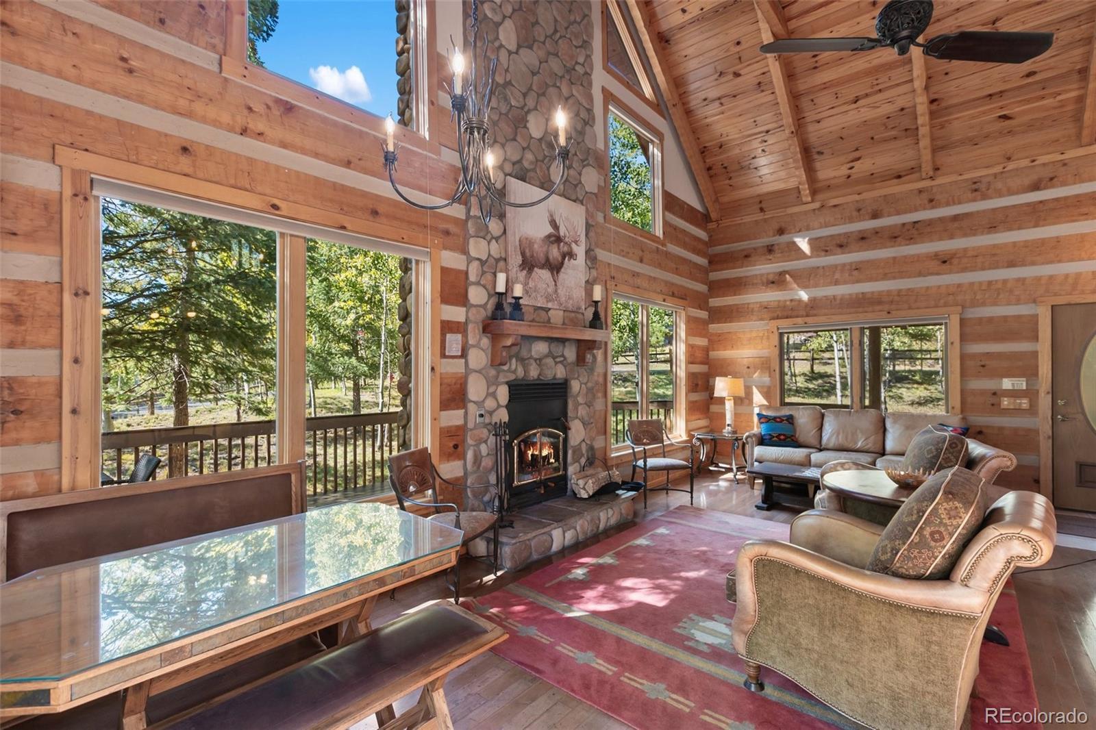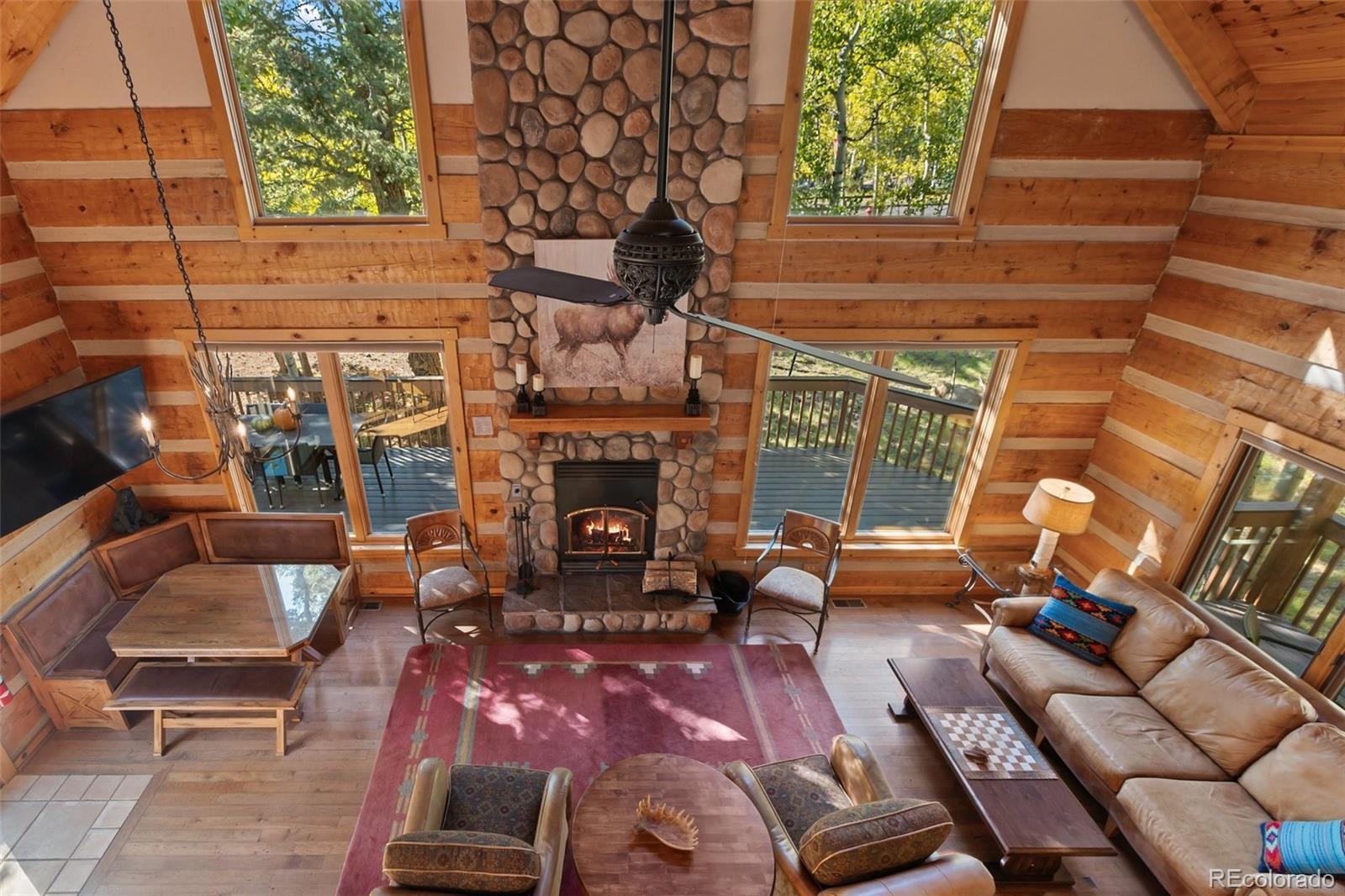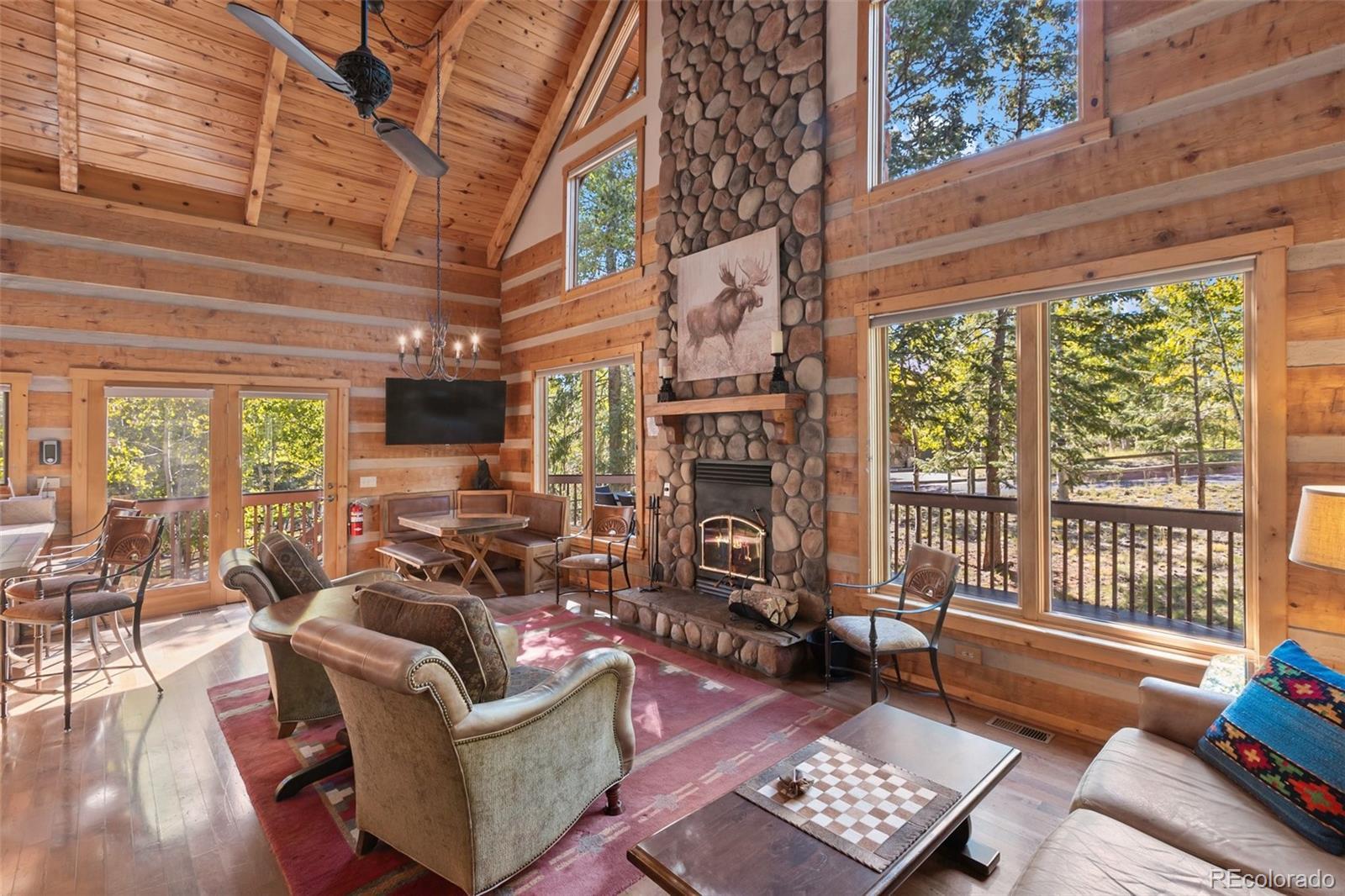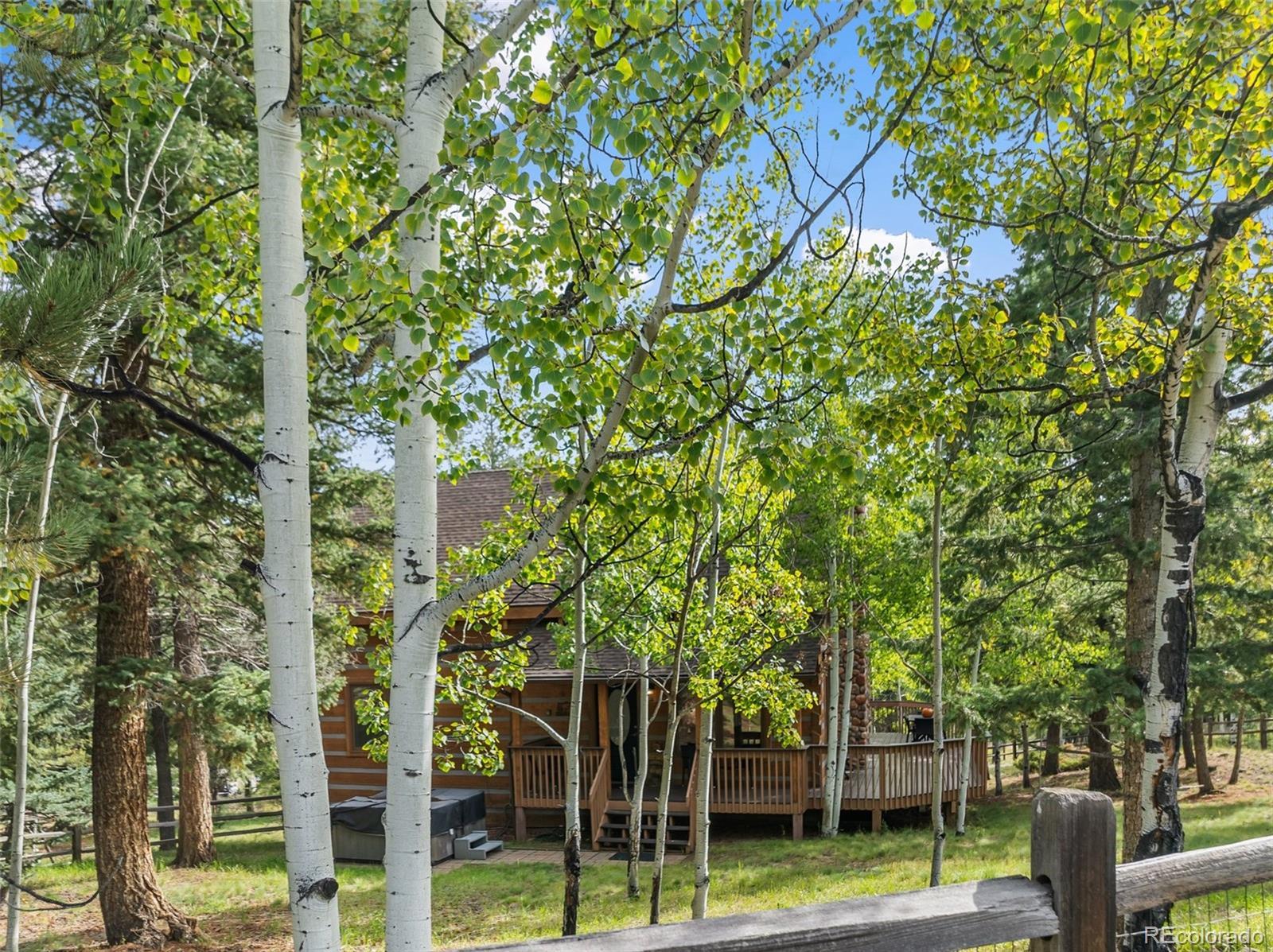 Nestled amongst a mix of Aspens & Pines just minutes from Downtown Woodland Park, you’ll discover a truly unique property—a custom dove tail hand hewn log home that defines mountain living at its finest. This remarkable residence seamlessly marries the charm of a traditional log cabin with the convenience of modern amenities, offering a one-of-a-kind sanctuary for those seeking a convenient mountain escape. The open-concept living space features a magnificent stone fireplace, perfect for cozy evenings by the fire, vaulted tongue and groove ceilings and expansive windows that flood the space with natural light. The interior exudes genuine rustic elegance. This 3-bedroom, 3-bathroom home offers an unparalleled blend of comfort and nature. Outside you’ll enjoy a large wrap around composite deck, hot tub, and a fully fenced in .97-acre lot for pets and family members. Florissant Fossil Beds National Monument, Dome Rock State Park, Mueller State Park, and National Forest are all within a 30-minute drive for your weekend adventures. Fishing at 11 Mile Reservoir, Spinney, and the "Dream Stream" are all within a 45-minute drive. Skiing at Breckenridge is just under 2 hrs. away. Make this your home in the mountains today!
