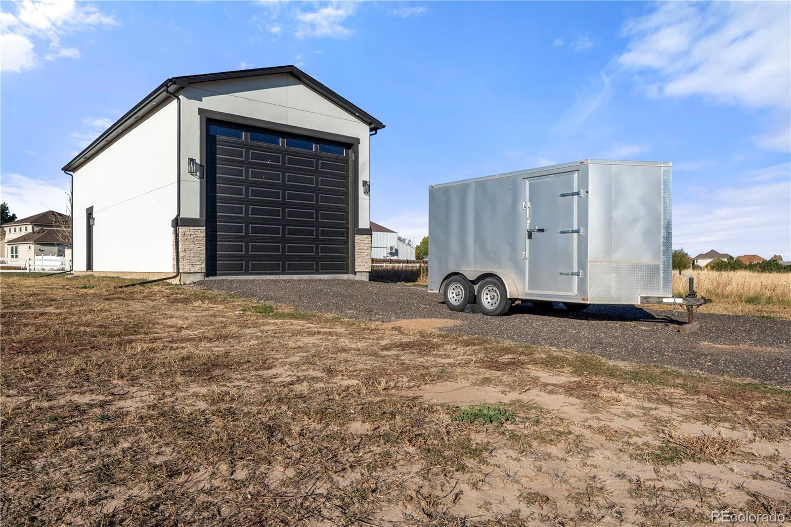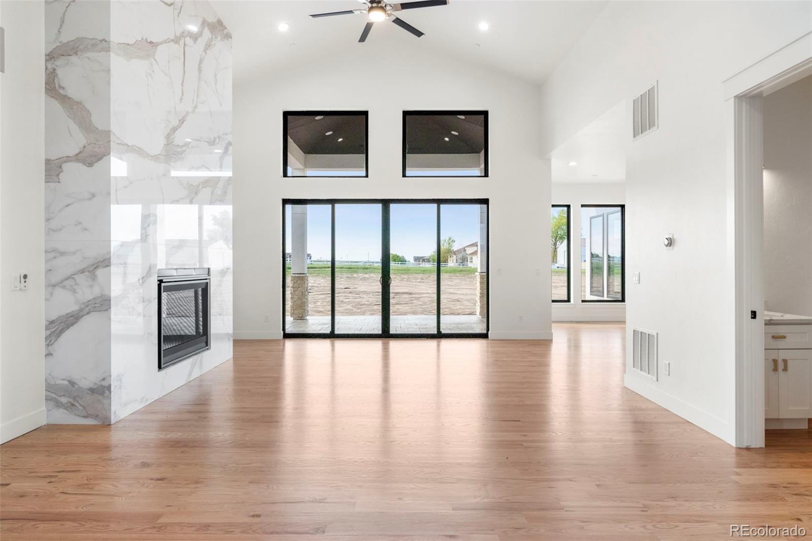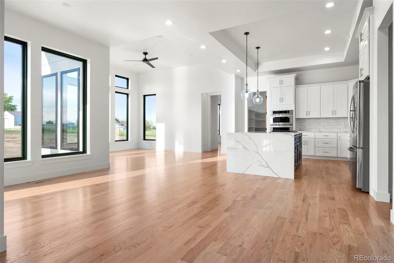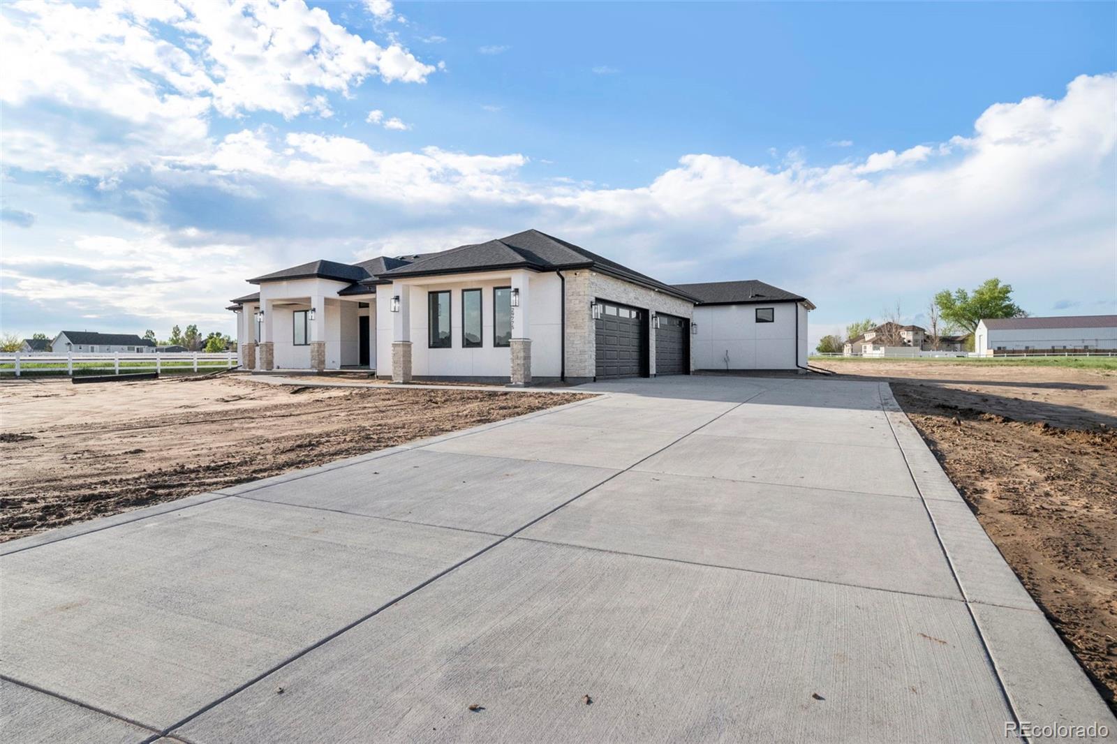 Welcome to Country Club Ranchettes in Brighton, Colorado! This brand-new 2023 custom ranch-style home combines luxurious design, modern comfort, and open-concept living across 6,428 total square feet. Situated on 1.64 acres, this property delivers the perfect blend of elegance and space for Colorado living. Step inside to a grand great room with vaulted ceilings, a floor-to-ceiling marble-style fireplace, and expansive sliding glass doors opening to a covered patio—perfect for entertaining or relaxing while enjoying mountain views. The chef’s kitchen impresses with waterfall-edge quartz counters, soft-close cabinetry, stainless-steel appliances, and a spacious island designed for gatherings. Natural light pours through large windows, highlighting the beautiful hardwood floors and clean architectural lines throughout the home. Featuring 7 bedrooms and 7 bathrooms, each space is thoughtfully designed for privacy and function. The primary suite includes a luxurious ensuite bath with high-end finishes and a walk-in closet. The finished basement offers additional living space ideal for a home theater, gym, or guest quarters. Outside, the detached oversized RV garage with full electrical service provides room for recreational vehicles, workshop space, or extra storage. With no HOA and room for future landscaping, this property offers freedom and potential. Enjoy modern country living at its finest—quiet, spacious, and minutes from Brighton amenities, schools, and major highways. Don’t miss your chance to call this one-of-a-kind new build home!