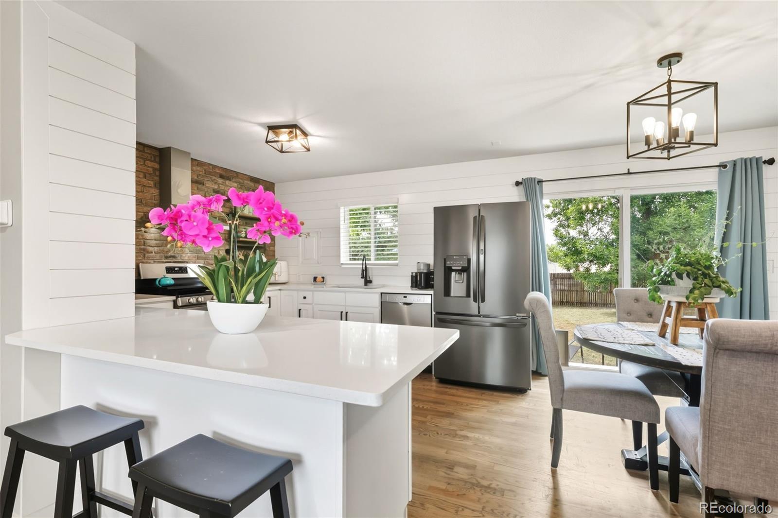 Beautifully Remodeled Home with Stunning Mountain Views! Nestled on a charming, tree-lined street, this wonderfully updated home blends timeless character with modern style! The bright, open main level features a stunning kitchen with white cabinetry, quartz countertops, gas stove, stainless steel appliances—including a new matte black refrigerator —and stylish brick and shiplap accents! Plantation shutters, refinished hardwood floors and neutral, inviting colors create a warm, welcoming feel! From the Kitchen, Dining Room and Backyard, enjoy Breathtaking, Unobstructed Views of Pikes Peak! With no rear neighbors and backing to a school, privacy and views are unmatched! The spacious, fully fenced backyard with rear gate access is perfect for entertaining, summer BBQs, pets or simply soaking in Colorado’s fresh air! Upstairs offers a serene primary bedroom, guest room, and updated full bathroom! The lower level adds versatility with a third bedroom (ideal as a home office, game room, or playroom), a generous second living space, laundry (washer & dryer included) and an updated second bathroom! Major updates include a New Furnace and AC (2024), New Roof (2022), Newer Water Heater (2020), New Windows with built-in doggie door, Gutter Guards and Radon mitigation system! Additional features include Xeriscape front yard, ADT security system with Google doorbell, and front and rear cameras! With its stylish modern finishes, thoughtful upgrades, and Move-In Ready condition, this home has it all! Schedule your showing today—WELCOME HOME