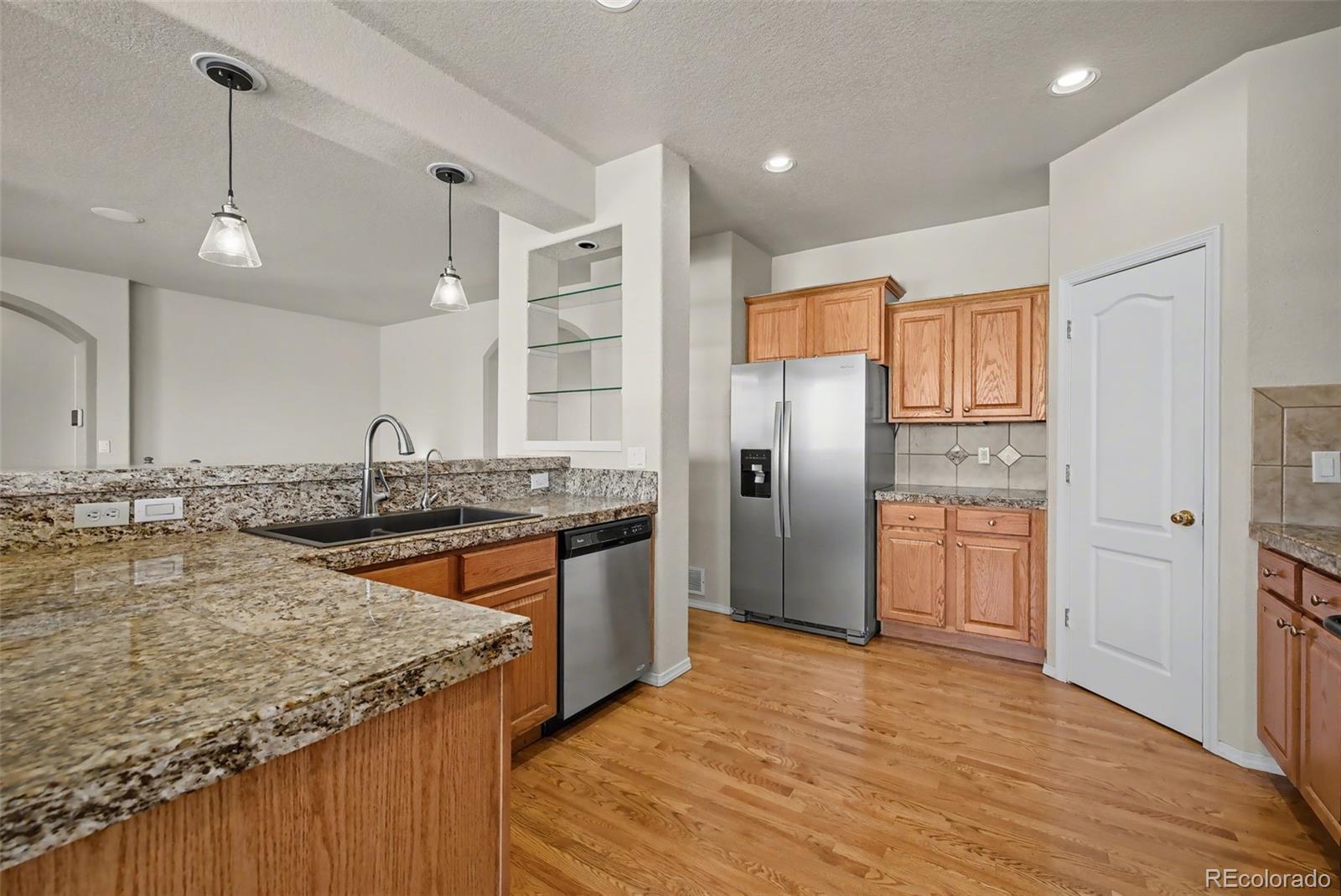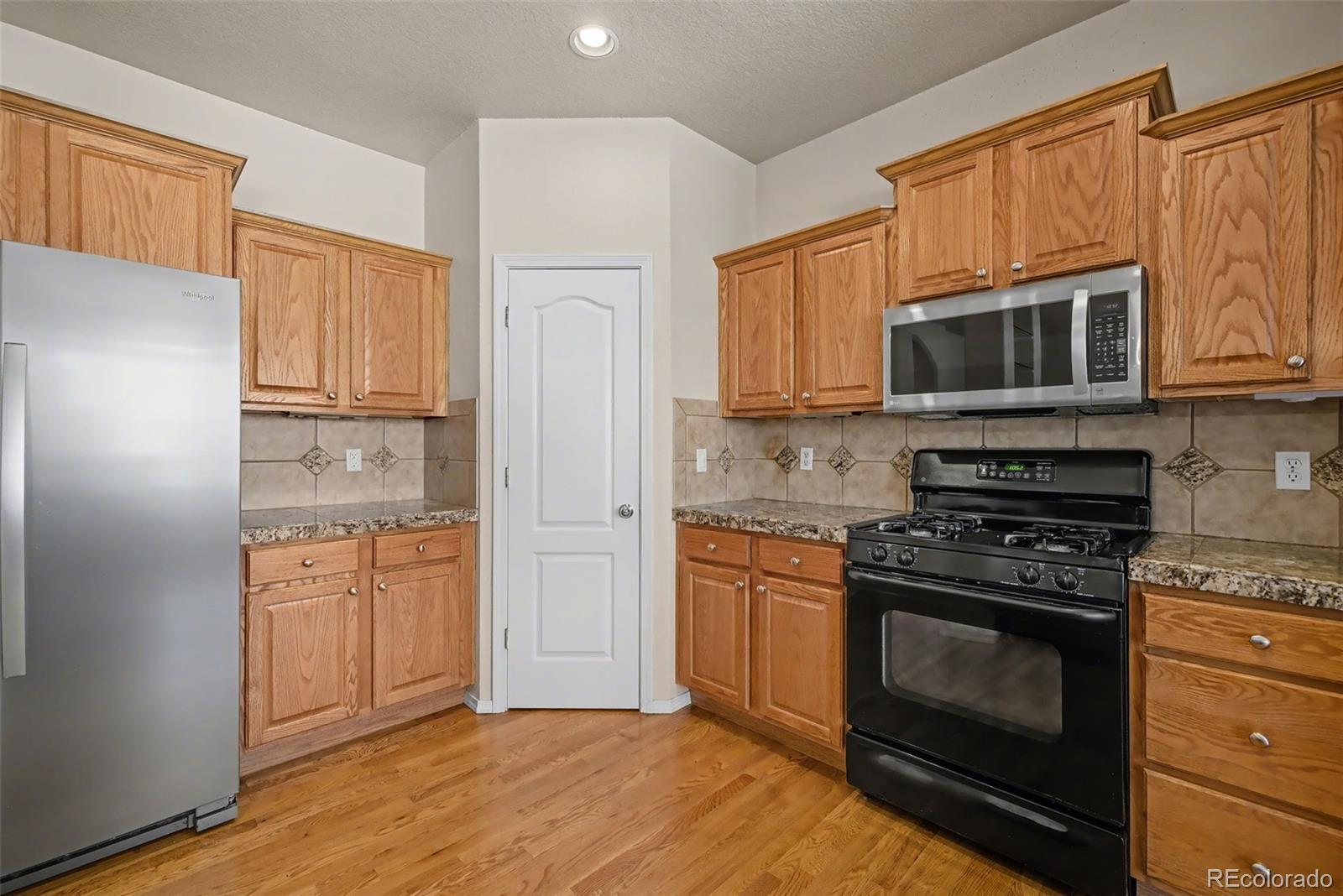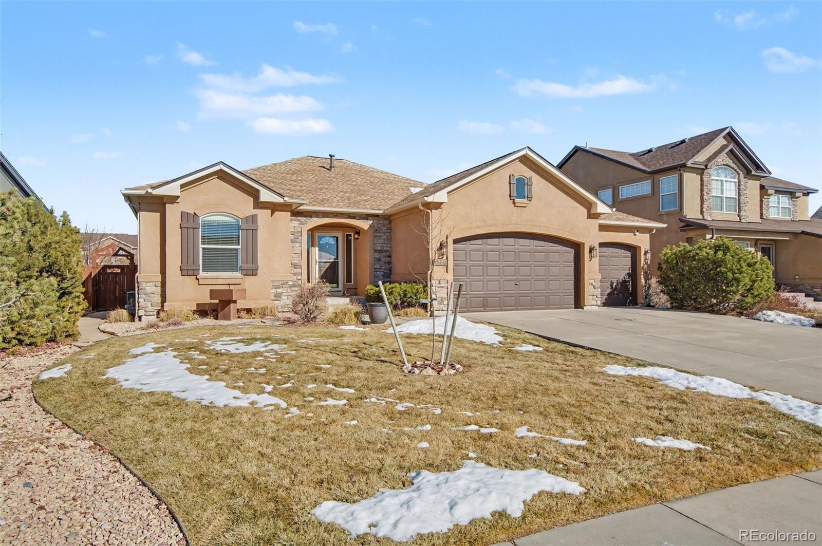 Welcome to this well-appointed ranch-style home with a 3 car garage, ideally located in the desirable Meridian Ranch community in Peyton, Colorado. Offering 5 bedrooms and 3 bathrooms, this home combines thoughtful design, comfortable living, and access to outstanding neighborhood amenities. Hardwood flooring highlights the main level, creating a warm and inviting atmosphere. The main floor features a private owner’s suite, an additional bedroom, and a full bath, perfect for main-level living. The kitchen is designed for both function and style, featuring white cabinets with crown molding, granite tile countertops, a coordinating tile backsplash, stainless steel appliances, and a gas range. The open great room is filled with natural light and opens through a large sliding glass door to a spacious concrete patio, ideal for outdoor entertaining. The owner’s suite offers a generous walk-in closet and an adjoining five-piece bath complete with a resort-style walk-in shower. The finished basement expands the living space with a large recreation room, three additional bedrooms, a bathroom, and a dedicated storage room, perfect for guests, hobbies, or multi-generational living. Additional highlights include air conditioning, a spacious laundry area, neutral interior color selections throughout, full yard landscaping, fencing, and a storage shed. The garage is enhanced with built-in storage cabinets for added organization. Enjoy a lifestyle-focused community just a short walk from Antler Creek Golf Course, with miles of trails, parks, a community recreation center, indoor and outdoor pools, and more. This home offers the perfect blend of space, comfort, and Meridian Ranch living.