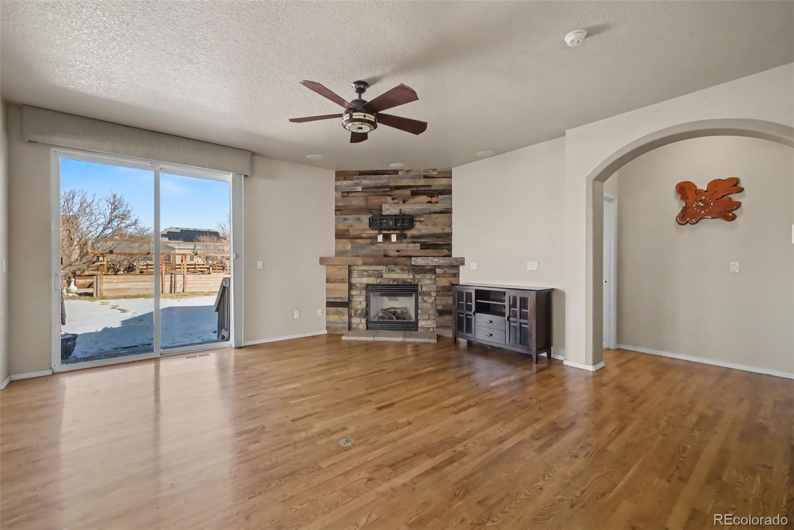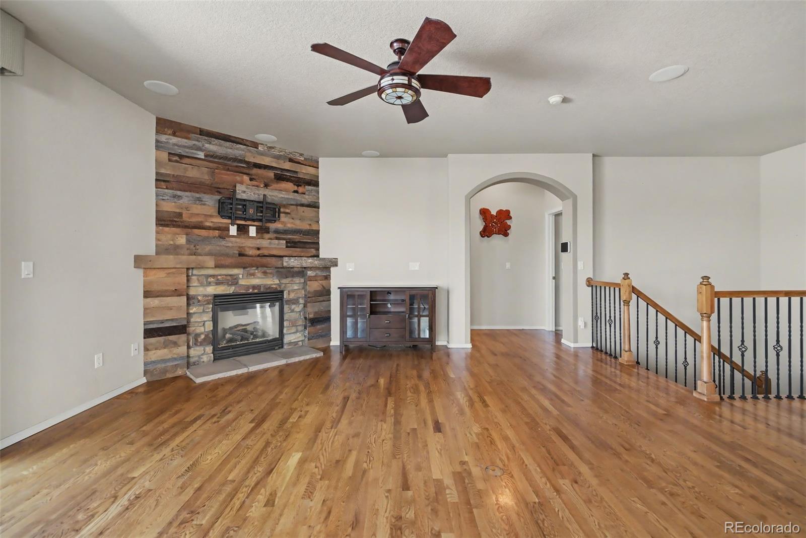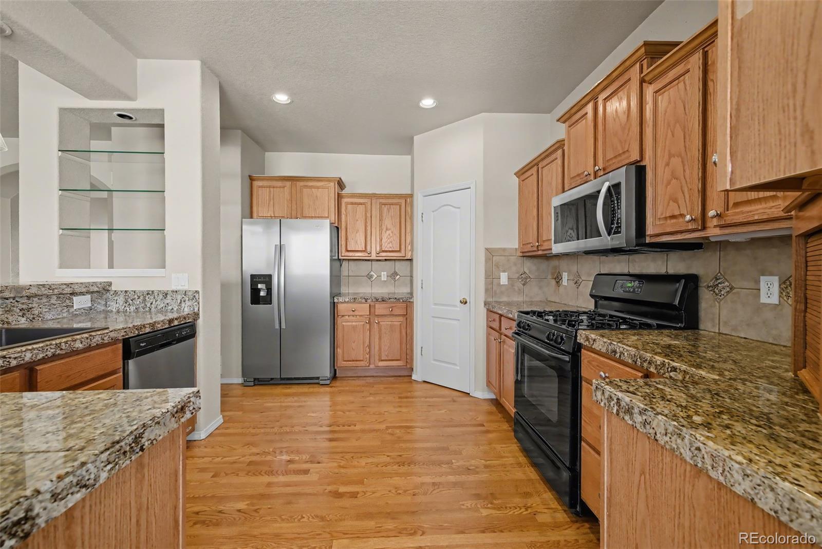 Welcome to this well-appointed ranch-style home with a 3 car garage, ideally located in the desirable Meridian Ranch community in Peyton, Colorado. Offering 5 bedrooms and 3 bathrooms, this home combines thoughtful design, comfortable living, and access to outstanding neighborhood amenities. Hardwood flooring highlights the main level, creating a warm and inviting atmosphere. The main floor features a private owner’s suite, an additional bedroom, and a full bath, perfect for main-level living. The kitchen is designed for both function and style, featuring white cabinets with crown molding, granite tile countertops, a coordinating tile backsplash, stainless steel appliances, and a gas range. The open great room is filled with natural light and opens through a large sliding glass door to a spacious concrete patio, ideal for outdoor entertaining. The owner’s suite offers a generous walk-in closet and an adjoining five-piece bath complete with a resort-style walk-in shower. The finished basement expands the living space with a large recreation room, three additional bedrooms, a bathroom, and a dedicated storage room, perfect for guests, hobbies, or multi-generational living. Additional highlights include air conditioning, a spacious laundry area, neutral interior color selections throughout, full yard landscaping, fencing, and a storage shed. The garage is enhanced with built-in storage cabinets for added organization. Enjoy a lifestyle-focused community just a short walk from Antler Creek Golf Course, with miles of trails, parks, a community recreation center, indoor and outdoor pools, and more. This home offers the perfect blend of space, comfort, and Meridian Ranch living.