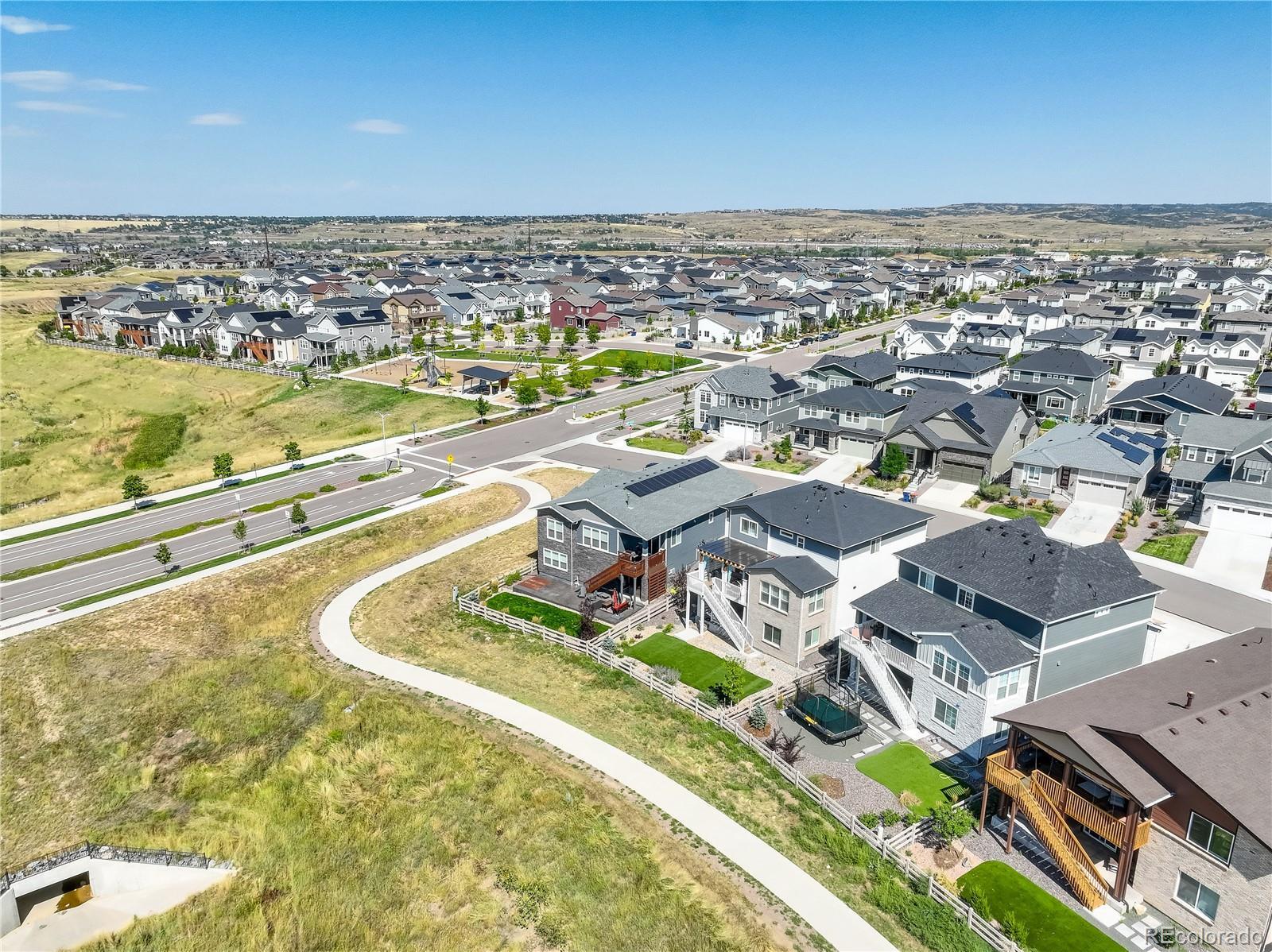 This striking home is situated on a premium open space lot that combines the perfect setting with a thoughtfully designed floor plan—offering style, comfort, and functionality in every detail. Backing to open space with sweeping mountain views, this property truly has it all! Inside, you’ll find 4 spacious bedrooms plus a large loft on the upper level, a main-floor office with French doors and picture windows, and an inviting open-concept main floor featuring the kitchen, dining, and family rooms. The finished walk-out basement is designed for entertaining, complete with a game/media room, wet bar, a private guest suite and adjacent ¾ bath and abundant storage. The chef’s kitchen is a showpiece with gleaming granite countertops, white cabinetry, gas cooktop, stainless steel appliances, expansive island seating, and plenty of counter and cabinet space. The adjoining dining area is drenched in natural light with vaulted ceilings and oversized windows framing the mountain views. The spacious primary suite is a true retreat with a spa-inspired bath and the best views in the home. Upstairs, the versatile loft makes a perfect playroom, study space, or secondary living area. Outdoor living at its best with both a covered deck off the dining room and a covered patio below—complete with a relaxing spa, perfect for year-round enjoyment. The yard is thoughtfully landscaped with low-maintenance turf and beautiful ornamental grasses and shrubs. Located in the premier Sterling Ranch community, residents enjoy world-class amenities including pickleball courts, swimming pools, extensive trail systems, sports fields, basketball courts, playgrounds, climbing walls, zip-lines, bocce ball, picnic areas, nature preserves, and so much more—with exciting additions still to come! Don’t miss the chance to own this highly upgraded, model-like home in one of Colorado’s premier neighborhoods!