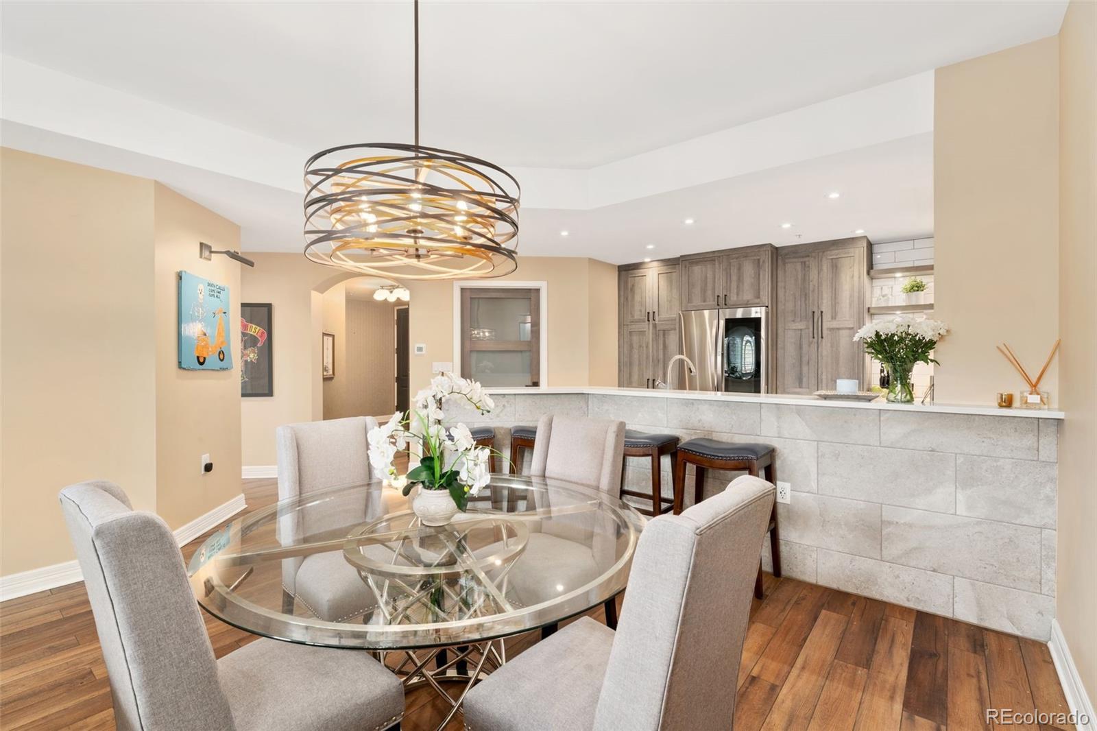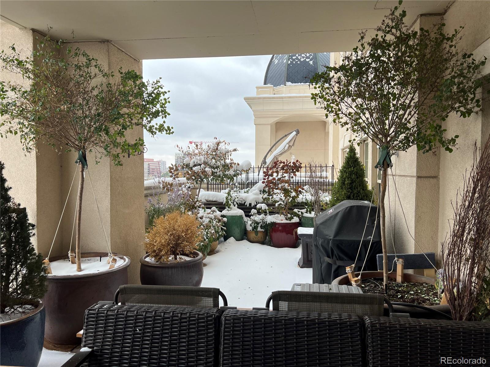 Welcome home to this stunning condo in the beautiful Beauvallon building! Experience sophisticated urban living in this beautifully updated two-bedroom, two-bath condo at the sought-after Beauvallon community. Over 125K in upgrades in 2022! This stunning residence showcases thoughtful updates throughout, including a brand-new kitchen, two stylishly renovated bathrooms, and elegant new vinyl flooring. The gourmet kitchen is an entertainer's dream featuring all newer stainless appliances, quartz counters, wine cooler and a breakfast bar with seating. Relax and unwind in the luxurious jetted tub, or entertain guests on your expansive private terrace, surrounded by lush plants and trees - a rare city oasis complete with a cozy firepit. The firepit and the fountain will stay with the property, and there is a Rain Bird automatic watering system for the terrace trees and plants. All of the furnishings are negotiable. This dog-friendly building's amenities are first class - 24/7 security, concierge service, an outdoor pool and hot tub with unobstructed city and mountain views. Enjoy the outdoor gardens, fountain, and community barbeque, also located on the 5th floor rooftop. The property is located within walking distance of restaurants, museums, and the Golden Triangle Creative District. The complex will be installing six EV charging stations soon! Hurry on this stunning condo!