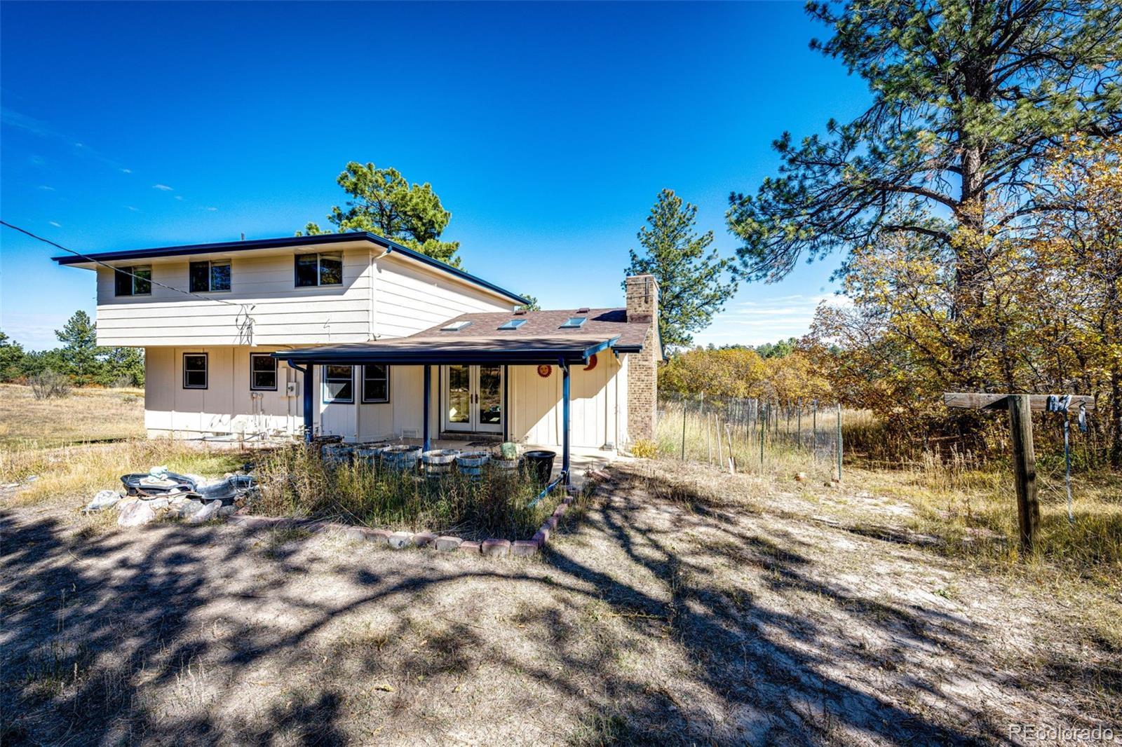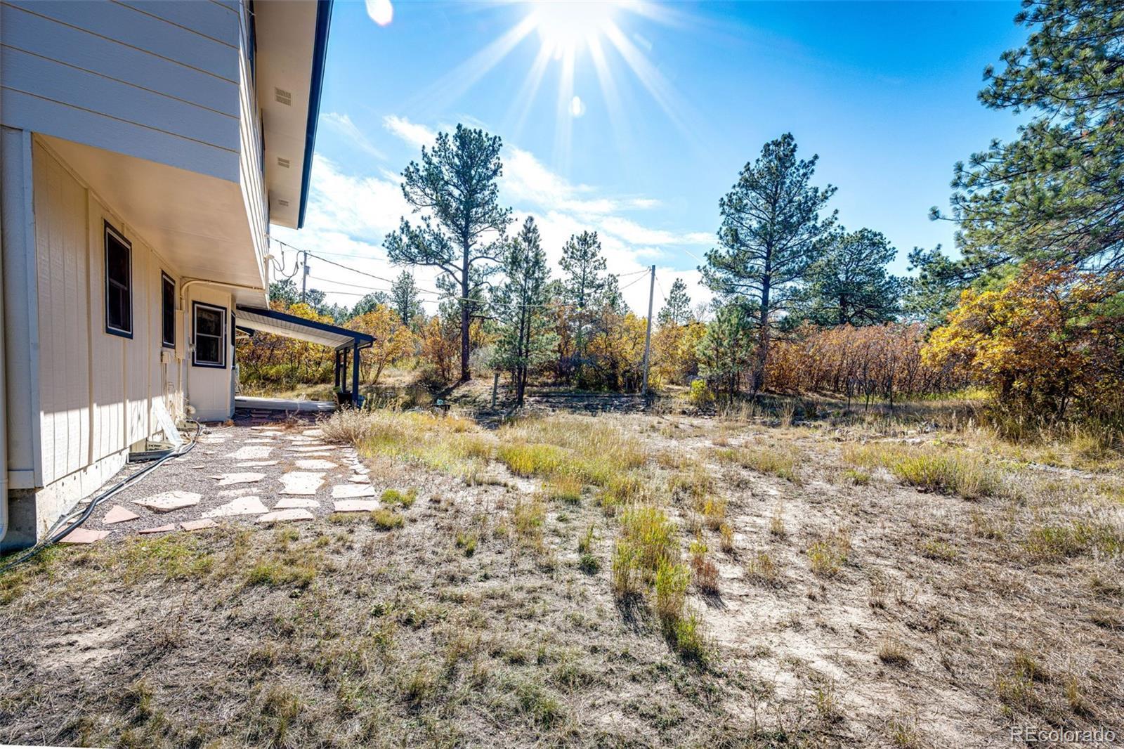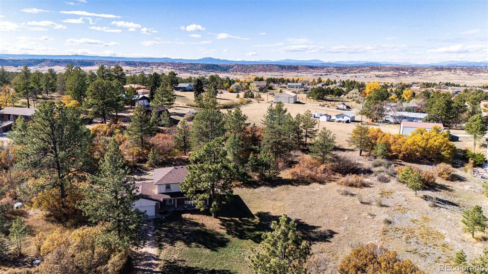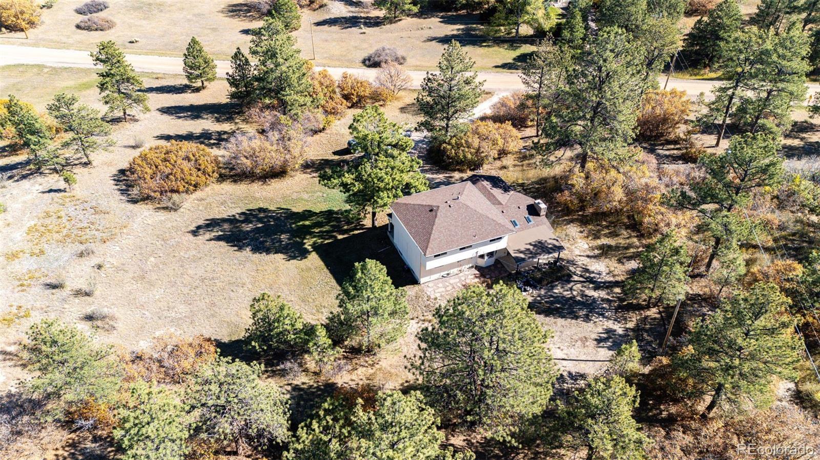 Location, location, location! This 4-bedroom, 3 bath home sits on just over 2 acres and is nestled in the beautiful Whispering Pines just outside of Franktown. Surrounded by mature pine trees, brush, natural grasses, and a garden area. The 20x16 barn has a loft and is painted to match the home which also has a newer roof, gutters, skylights, and exterior paint (12/2023). The kitchen is great for the family chef who likes to entertain with two sinks, two dishwashers, with lots of beautiful Hickory cabinets, plenty of counter space and a walk-in pantry! Enjoy cooking with natural gas! The living room and family room have lots of natural lighting from bay windows and skylights. The basement has a 3/4 bath, two bonus rooms and new LVP flooring. The two-car attached garage includes cabinets for storage. The roads are maintained by Douglas County and most of the road is paved. All this and No HOA! You won't want this one to slip by.