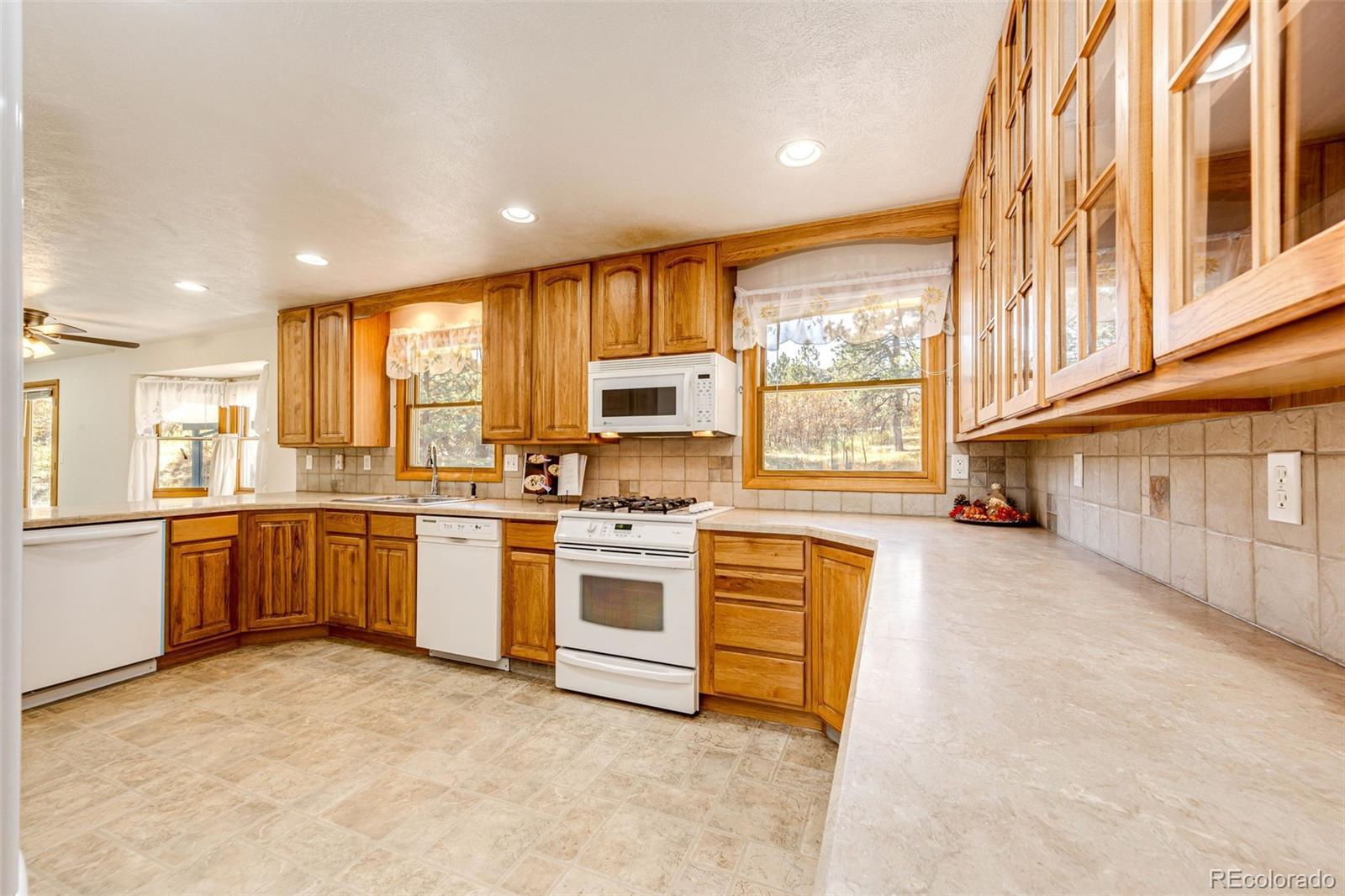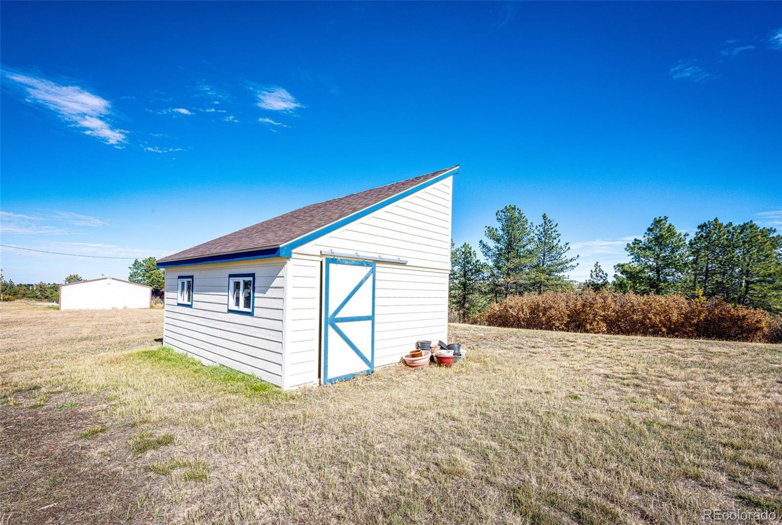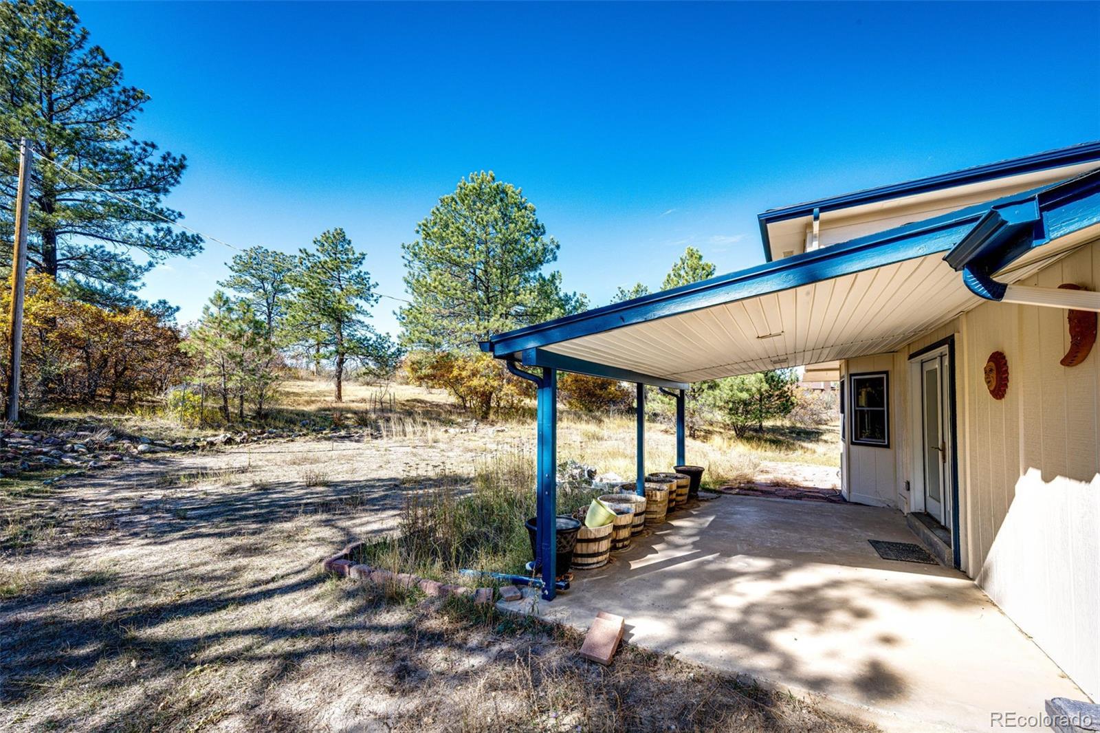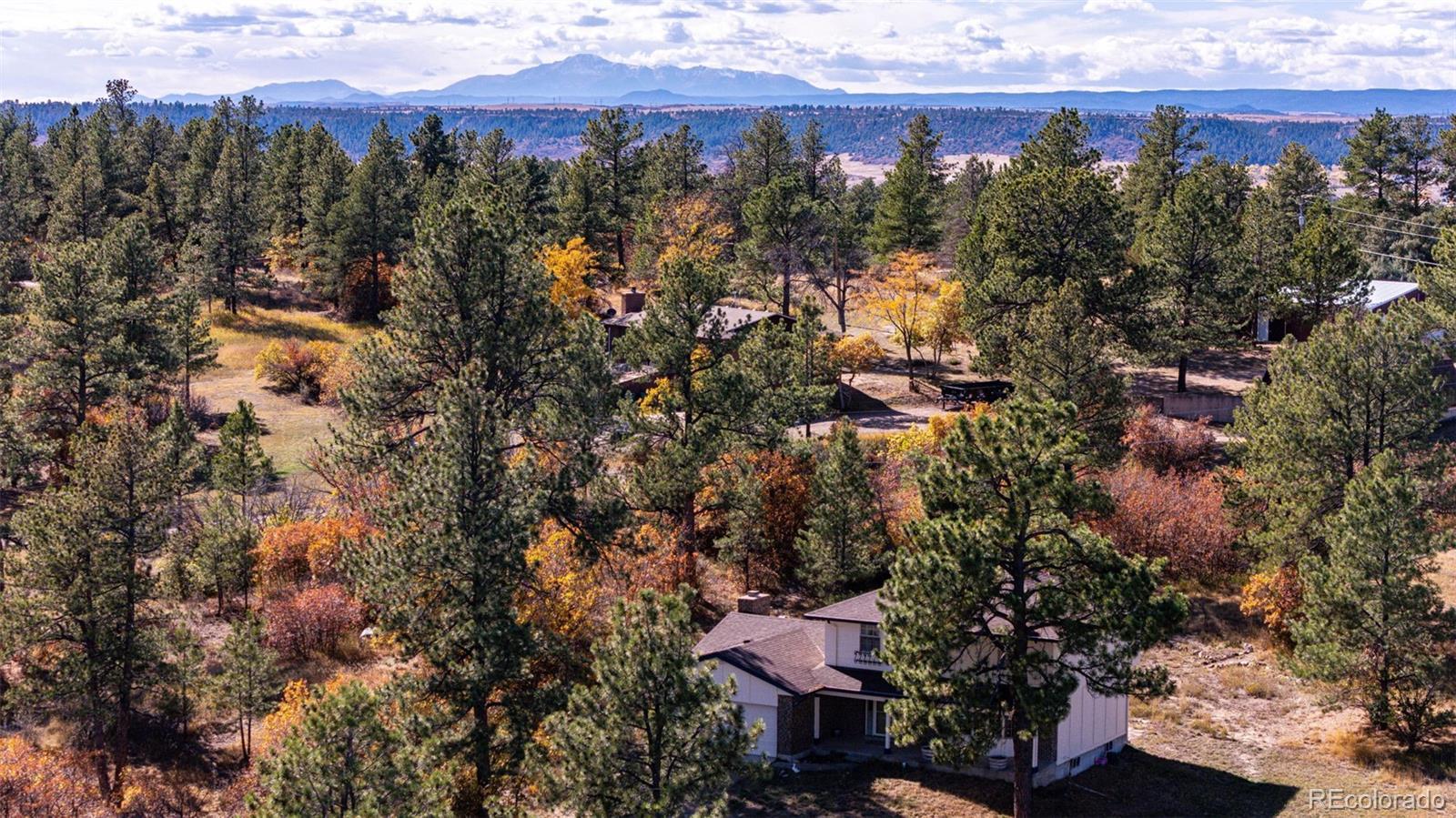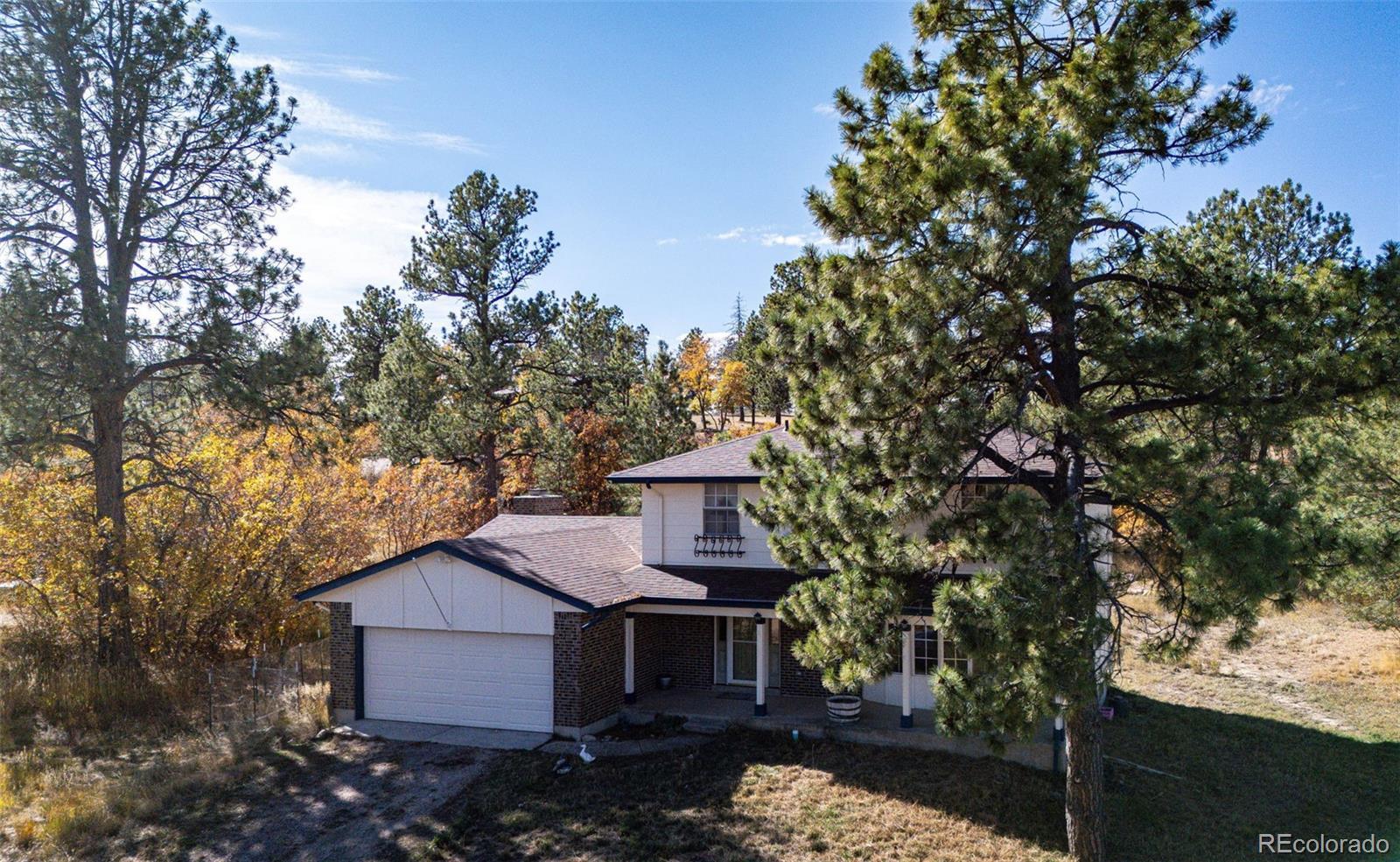 Location, location, location! This 4-bedroom, 3 bath home sits on just over 2 acres and is nestled in the beautiful Whispering Pines just outside of Franktown. Surrounded by mature pine trees, brush, natural grasses, and a garden area. The 20x16 barn has a loft and is painted to match the home which also has a newer roof, gutters, skylights, and exterior paint (12/2023). The kitchen is great for the family chef who likes to entertain with two sinks, two dishwashers, with lots of beautiful Hickory cabinets, plenty of counter space and a walk-in pantry! Enjoy cooking with natural gas! The living room and family room have lots of natural lighting from bay windows and skylights. The basement has a 3/4 bath, two bonus rooms and new LVP flooring. The two-car attached garage includes cabinets for storage. The roads are maintained by Douglas County and most of the road is paved. All this and No HOA! You won't want this one to slip by.