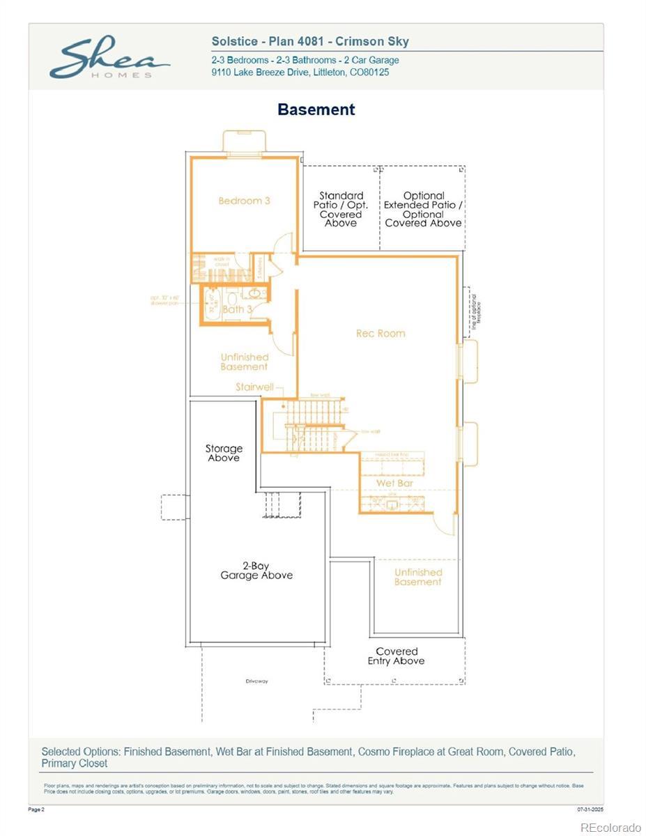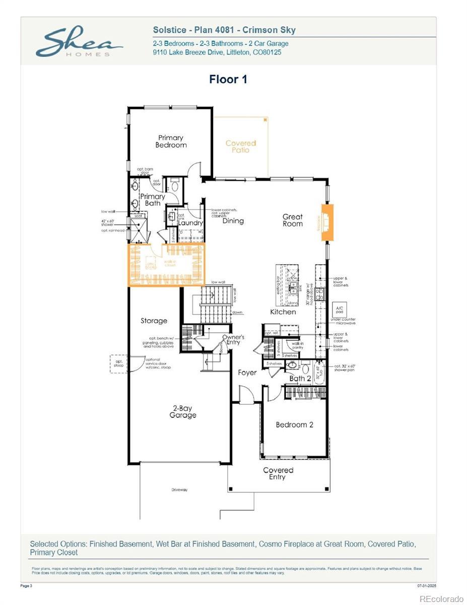Beautiful one-story home in the desirable Solstice Community. Solstice is surrounded by Chatfield State Park on 3 sides of the community and acreage parcels on the 4th side. This home features 3 bedrooms, 3 baths, fireplace with full height tile surround, finished basement with wet bar, covered patio, and 2-bay garage with storage. Design finishes include Evoke luxury plank flooring in Astoria/Gaela, AZT/DT engineered stone counter tops in New Venatino Grey, and Yorktowne Henning cabinets in White Icing and Frappe. Please contact a community representative for details. The Mirabelle Metropolitan Districts provide various services to the property and in addition to the estimated taxes, a $40 per month operations fee is imposed.