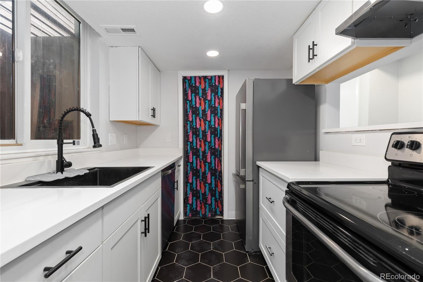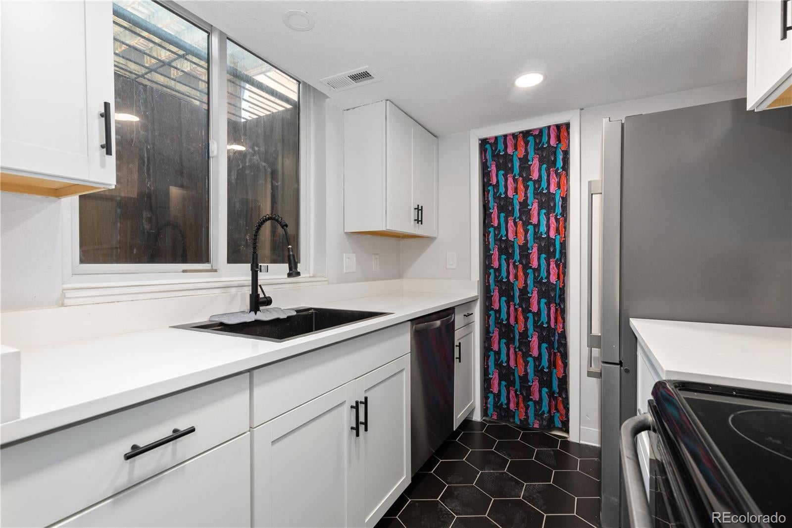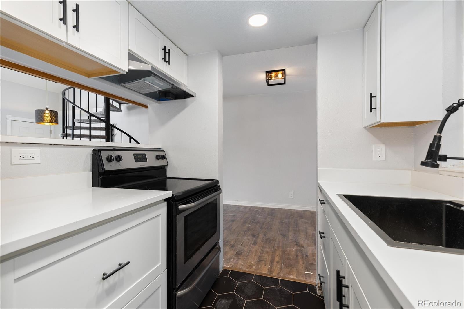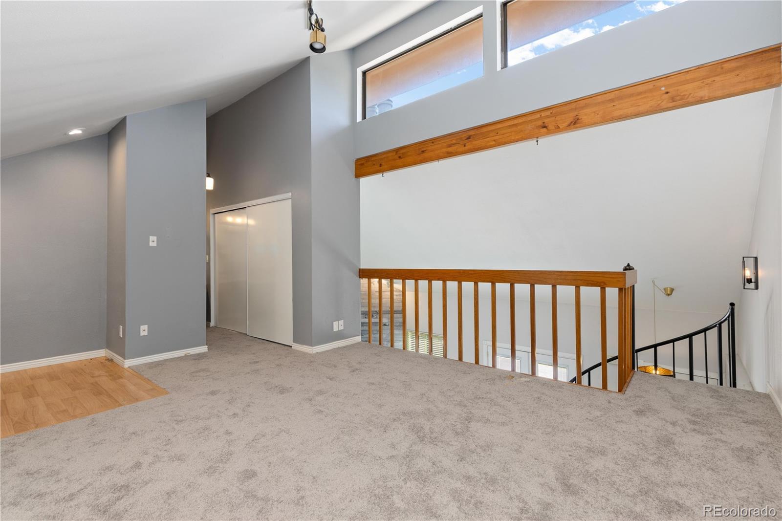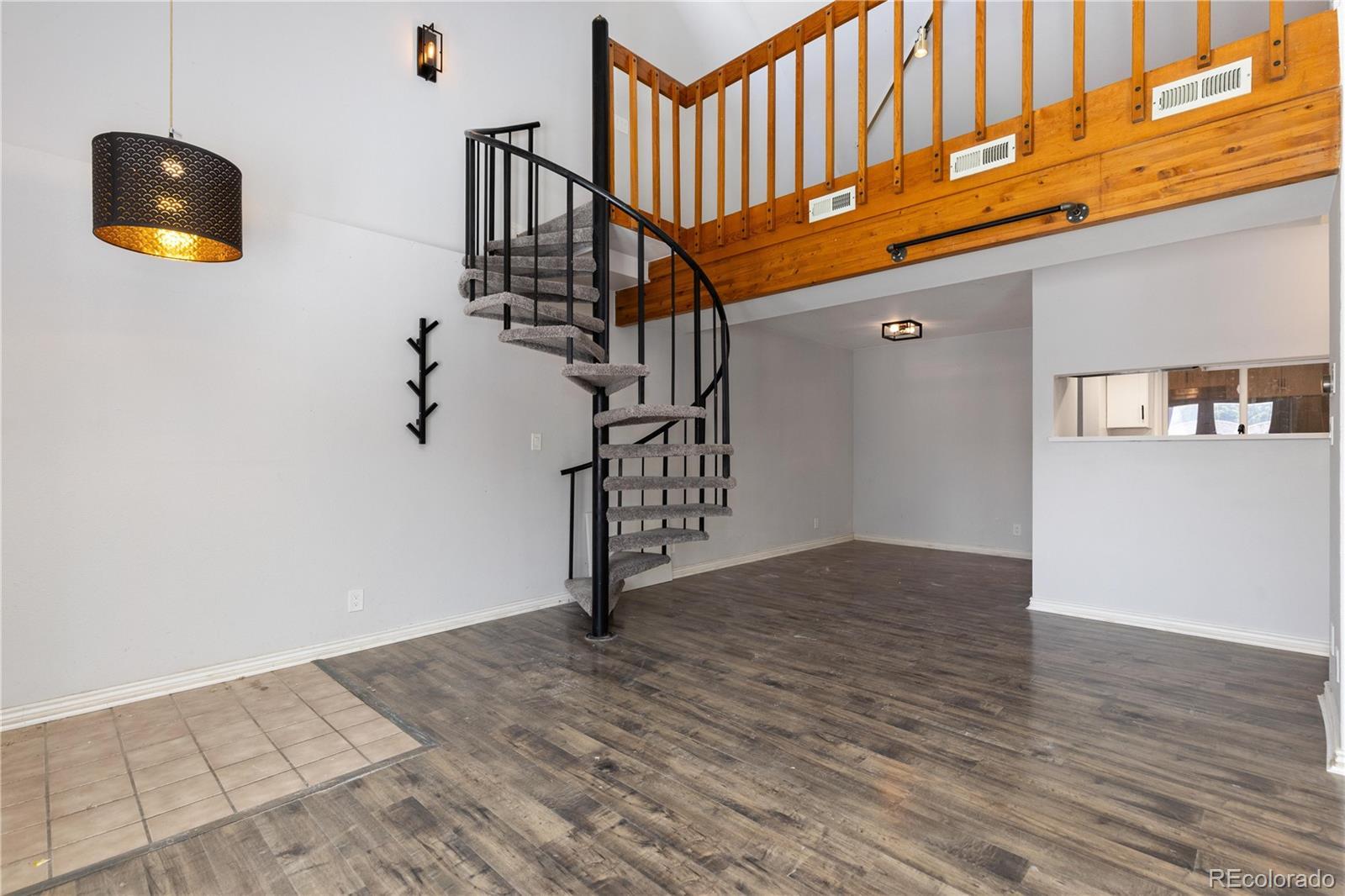 This bright, south-facing condo blends comfort, style, and unbeatable convenience in a highly desirable location. The inviting interior features wood-look laminate flooring, vaulted ceilings, and a cozy wood-burning fireplace with built-in shelving that anchors the living space. Updated light fixtures add a modern touch, while a dedicated dining area makes everyday meals and entertaining effortless. The remodeled kitchen is both stylish and functional, showcasing quartz countertops, stainless steel appliances, a convenient serving window, and new flooring. A main-level laundry area and half bath enhance day-to-day ease. Upstairs, a charming spiral staircase leads to a spacious open loft-style bedroom complete with an en-suite bath—an ideal private retreat. Step outside to a welcoming front patio, and enjoy the added convenience of a nearby carport. The location truly sets this home apart. Adjacent to Big Dry Creek Trail, you’ll have immediate access to miles of walking and biking paths leading to scenic Cornerstone Park less than half a mile away. Grocery stores including Sprouts and King Soopers are within a mile, and you’re just minutes from Historic Downtown Littleton and the vibrant South Broadway corridor.A wonderful opportunity to enjoy low-maintenance living in an exceptional setting—this condo is a standout find.