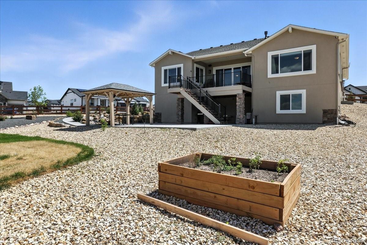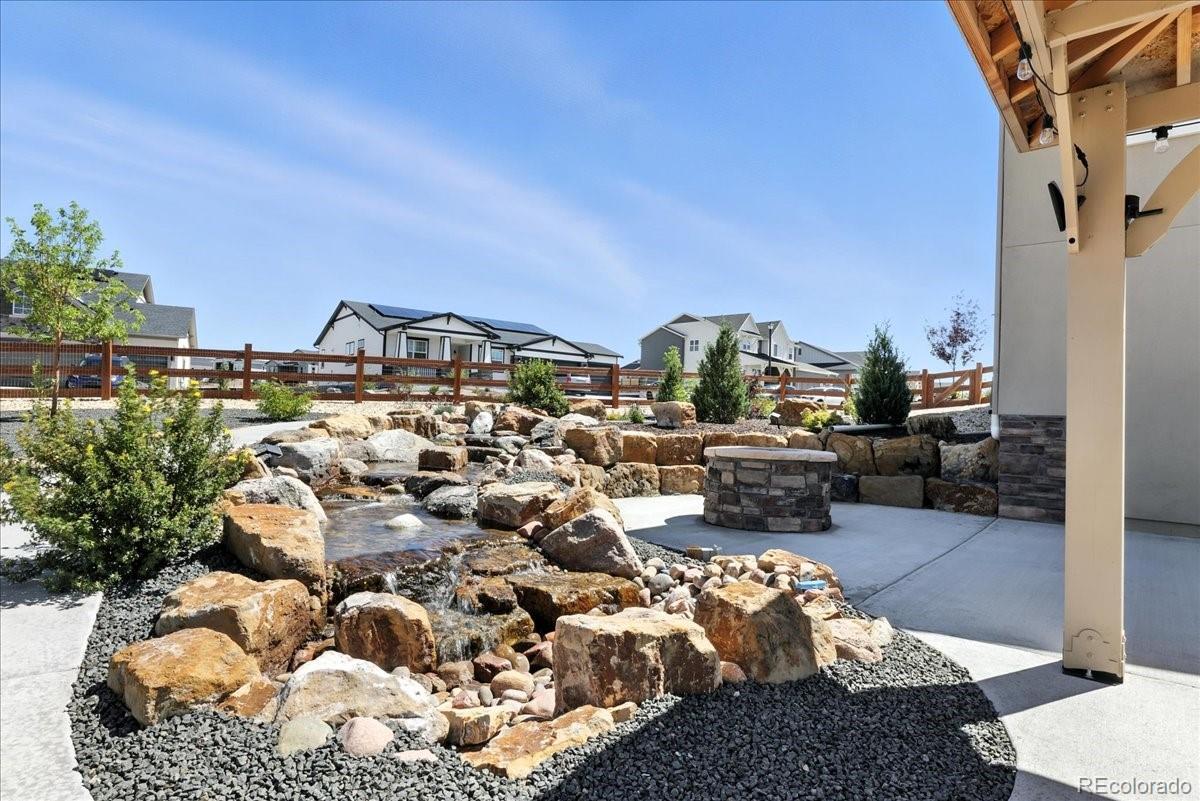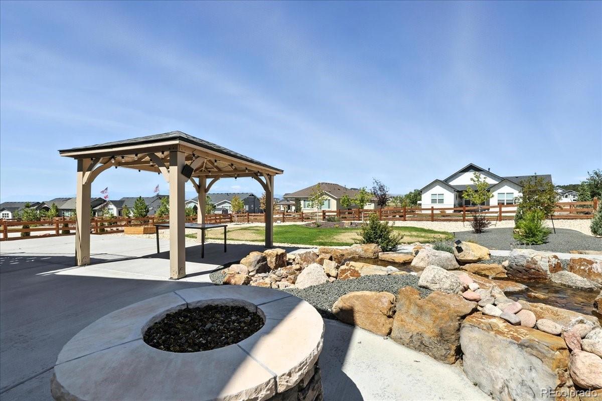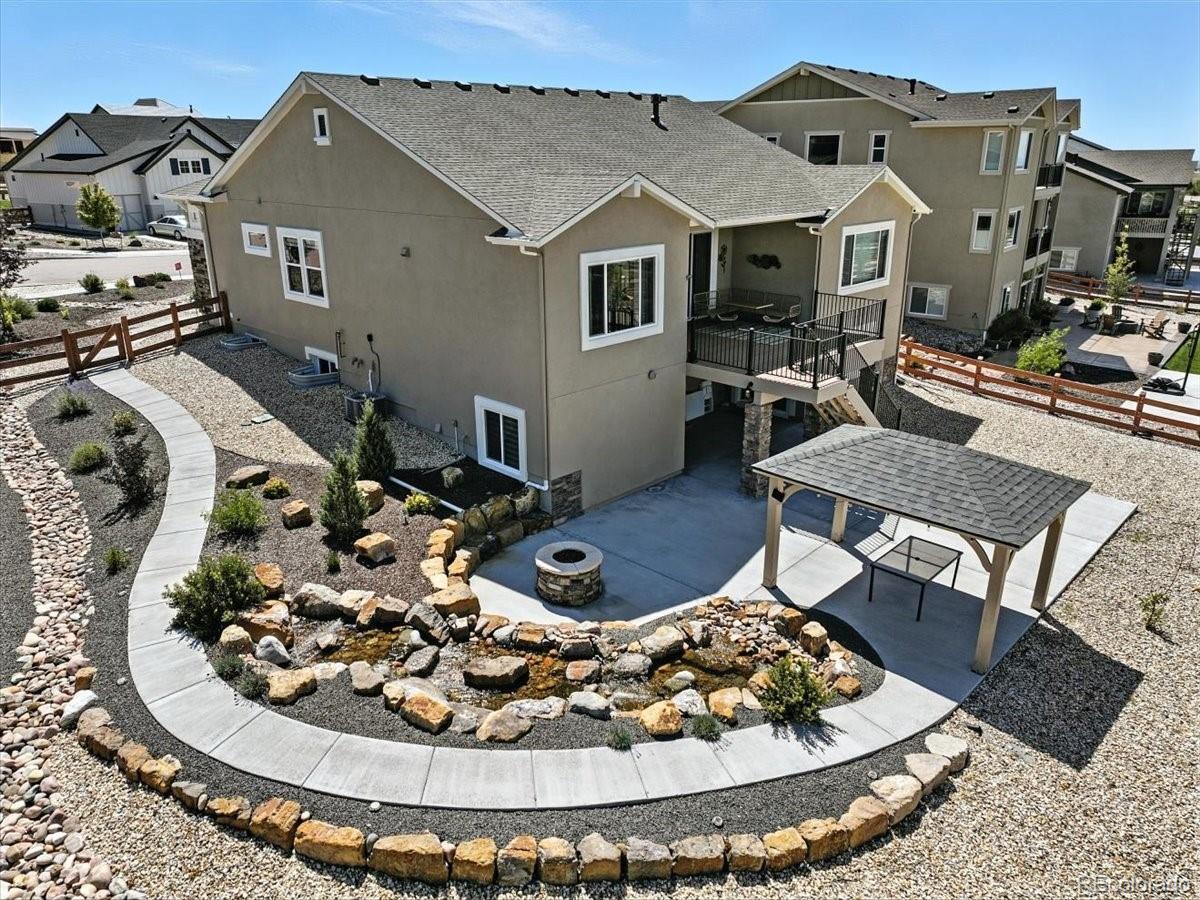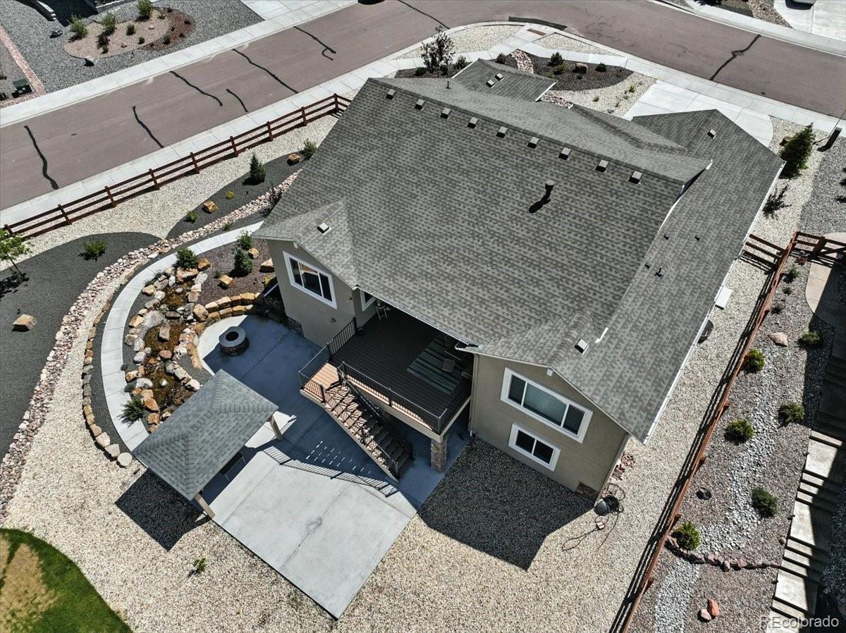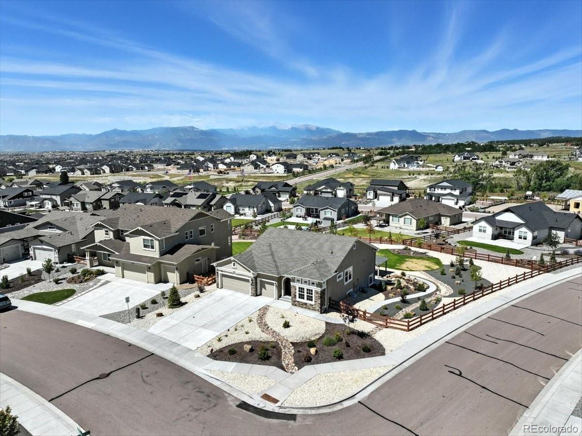 Experience luxurious living in this elegant, newly constructed ranch-style residence, boasting a walkout basement, 5 bedrooms, 4 bathrooms, and breathtaking views of Pikes Peak and the Front Range. The open-concept main level features a stunning gourmet kitchen with a large island, ample cabinets, quartz countertops, double ovens, stainless steel appliances, gas cooktop, pantry, and seamlessly flows into the living room, complete with a stone-surround gas fireplace and expansive glass sliding doors opening onto a Trex deck, ideal for taking in the views. The main level's primary suite serves as a serene retreat, featuring an attached bathroom with double sinks, a spa-inspired shower, walk-in closet with organizers, and convenient access to the laundry room, equipped with a wash sink and cabinets. This upscale home showcases high-end finishes, including central air conditioning, tile bathrooms, luxury vinyl wood plank flooring, washer and dryer, ample storage, surround sound in the living, basement, and outdoor spaces. The finished basement features a spacious living area, complete with a bar, sink, wine rack, and cabinets. The sellers have added a generously sized bedroom with a walk-in closet, and a bathroom showcasing a large shower with a rain showerhead. Discover your ideal home here, perfect for everyone to spread out comfortably. Enjoy serenity and tranquility in the immaculately landscaped, fenced yard, featuring a waterfall that was recently added, mountain views, a gazebo and a fire pit. Don't miss out on this exceptional opportunity.