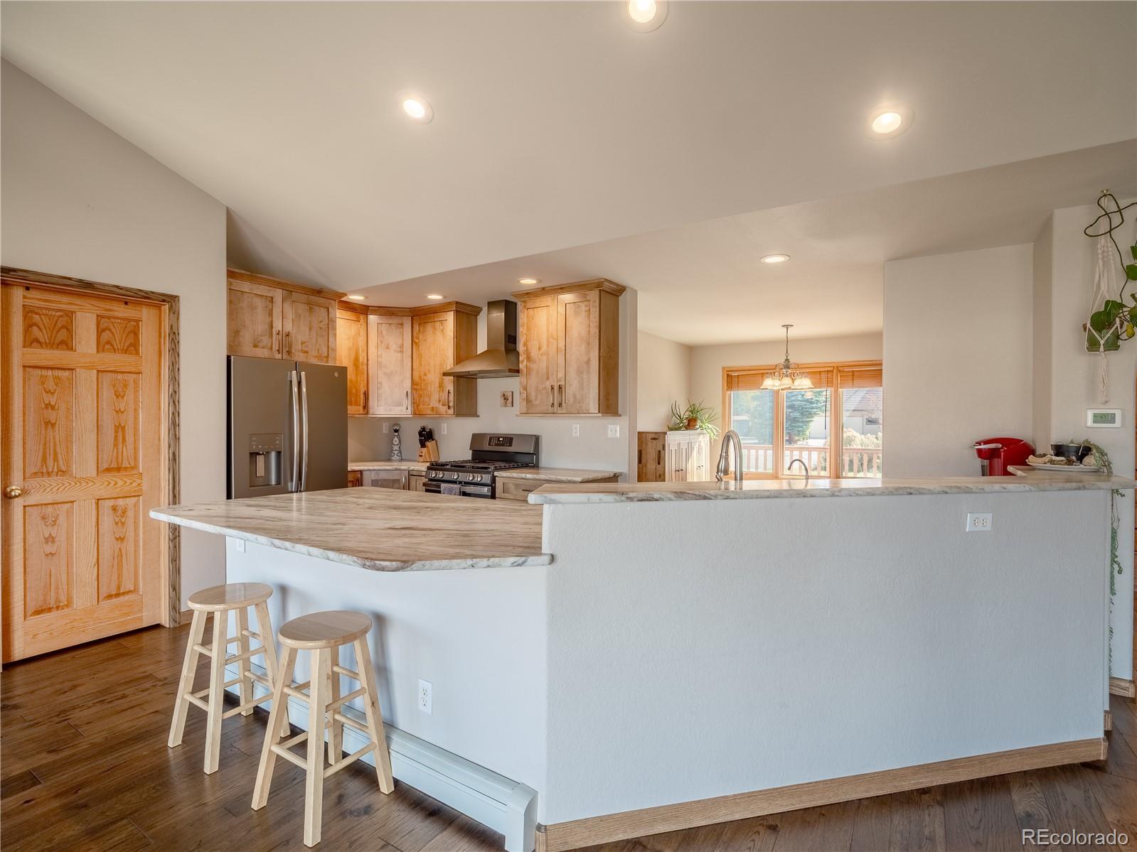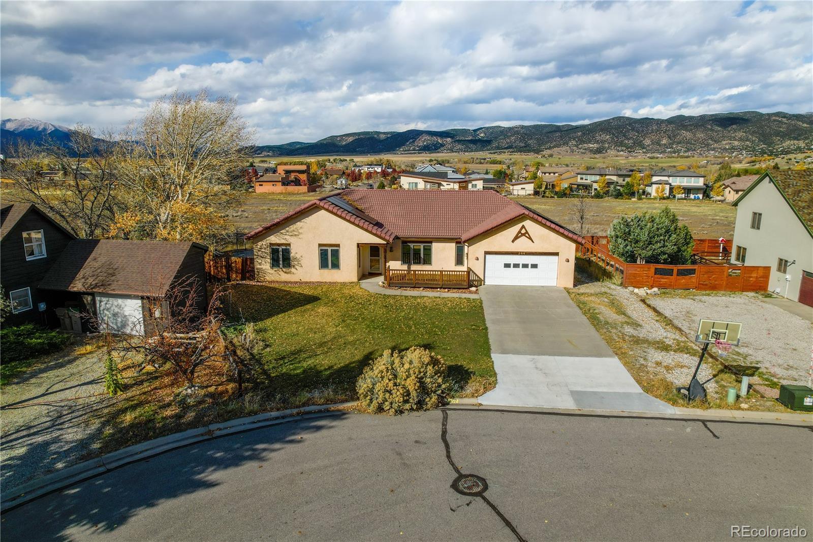 This beautifully updated 3-bedroom, 2-bath ranch-style home offers 1,824 square feet of thoughtfully designed living space in one of Salida’s most desirable neighborhoods. Nestled on a quiet cul-de-sac near the golf course, the property backs to open space and captures stunning views of the Sawatch Mountain Range —offering both tranquility and convenience just minutes from downtown. Inside, you’ll find extensive upgrades and high-quality finishes throughout. The living and dining areas feature hickory wood floors (2020) and plenty of natural light. The fully remodeled kitchen (2020) is a chef’s dream, showcasing custom alder soft-close cabinetry, marble countertops, high-end stainless steel appliances, a touch faucet, and a reverse osmosis filtration system for the sink and refrigerator. Each of the three bedrooms includes 100% wool, chemical-free carpeting (2020), while both bathrooms were remodeled in 2025 with tiled showers and glass doors (lifetime warranty), new granite counters and sinks, refurbished wood vanities, and matte black fixtures. The spacious primary suite offers a walk-in closet and a tasteful en suite 5-piece bath with a new tub and beautifully tiled shower. Additional updates include new tile in the laundry room, updated baseboards, door casings, and fresh paint throughout (2020). Energy efficiency is a highlight with fully paid-off solar panels installed in 2021, bringing the average electric bill to est. $8 per month. The home also features a spacious attached two-car garage for parking, storage, and easy year-round access. Enjoy peaceful mornings on the patio overlooking open space and panoramic mountain views, or take a short stroll to the nearby golf course and trails. With its ideal location, energy efficiency, and high-end updates throughout, this move-in-ready Salida home offers the perfect blend of comfort, style, and Colorado living.
