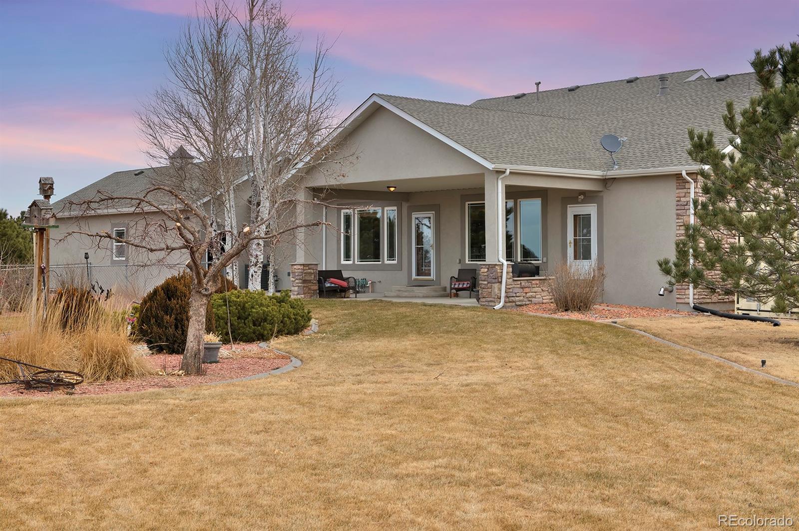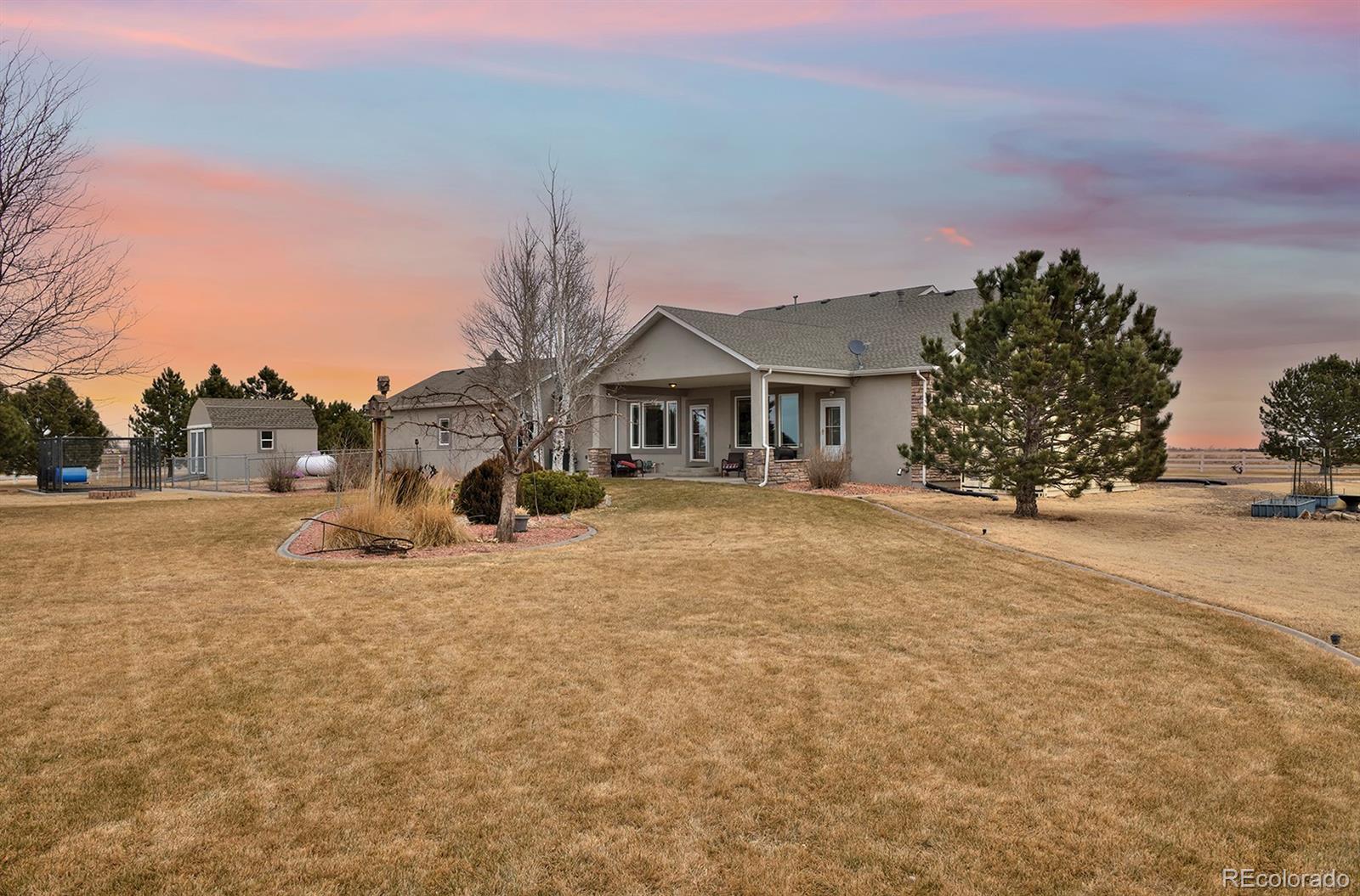 Experience the best of country living just outside Brush, this spacious ranch-style home is set on 2.04 acres. Designed for convenience and comfort, this home offers true main-level living with all primary living spaces—kitchen, dining, living room, primary bedrooms, and laundry—on the first floor. The fully finished basement is a welcome bonus, offering additional bedrooms and living space that can function almost like a separate suite, ideal for guests, multi-generational living, or recreation. Featuring 5 bedrooms and 5 baths, this property blends space and versatility. Step outside to a beautifully landscaped yard surrounded by mature trees, creating natural shade and privacy. In the summer, the cornfields to the west add a picturesque backdrop and help create a secluded outdoor patio area, complete with a cozy fire-pit for evening gatherings. Updates include new stucco and a new roof in 2024, giving the home fresh curb appeal and peace of mind. A 3-car garage, chicken coop, outdoor shed, and circle drive add functionality and charm. Located on a county-maintained road, this property combines the ease of access with a private, country atmosphere—just minutes from town.