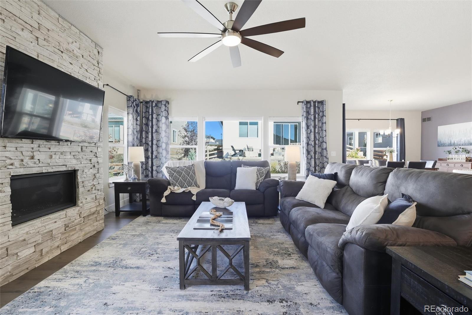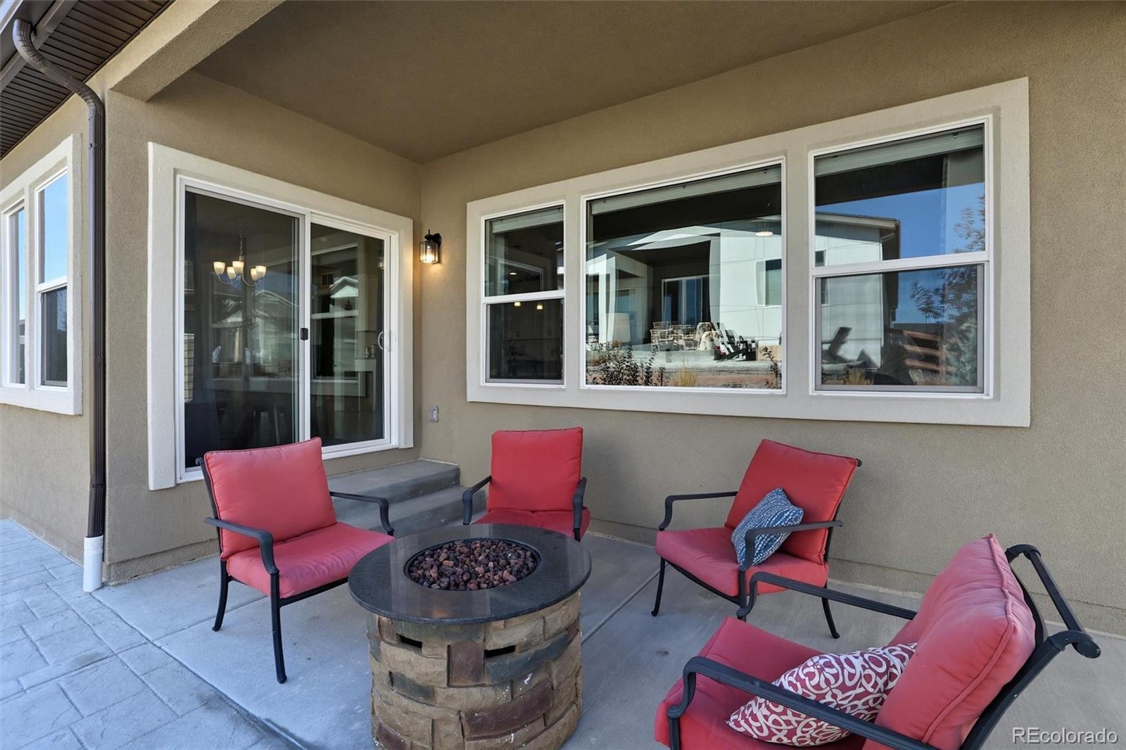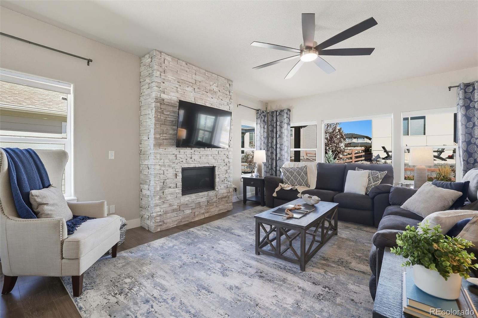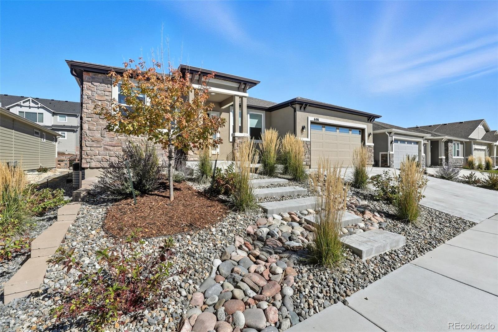 This immaculate, sun-drenched newer Wolf Ranch home pairs fresh style with a smart layout that makes daily life flow effortlessly. From the covered entry, step inside to find warm wood laminate floors and a sunlit office tucked to the right. The heart of the home opens into a spacious great room, where a stone gas fireplace anchors the space and walls of windows fill it with light. The dining area extends naturally outdoors with a walkout to the backyard patio. The kitchen is designed to gather around, with granite counters, a large eat-at island, stainless steel appliances including a gas cooktop and in-wall double oven, and a generous walk-in pantry with added shelving. A well-planned laundry room makes chores feel simple, complete with extra storage and a permanent acacia folding table. On the main level, the primary suite is a restful retreat featuring a walk-in closet and a four-piece bath with a double granite vanity and a walk-in shower. Two additional bedrooms, a full bath, and a powder room complete the layout. Downstairs, the finished basement stretches out with an enormous family and rec room, a dining nook, full bath, and two more bedrooms—one with its own nook, den, or walk-in closet—giving everyone space to spread out. Out back, the partially covered patio looks over the xeriscaped yard, designed for low maintenance and easy evenings outside. A three-car tandem garage provides ample space for vehicles, hobbies, or storage. Thoughtful details like central A/C and a whole-house humidifier keep the home comfortable year-round, while mountain views from the front are a daily reminder of Colorado living at its best. Finally, Wolf Ranch ties it all together with winding trails, a vibrant community center, and quick access to schools, shopping, hospitals, and entertainment—placing comfort and connection right at your doorstep.