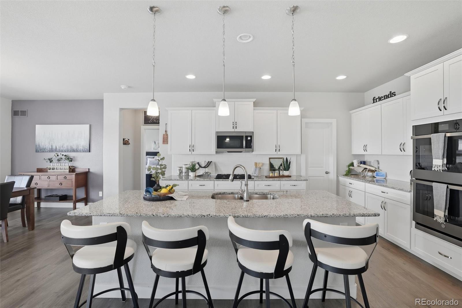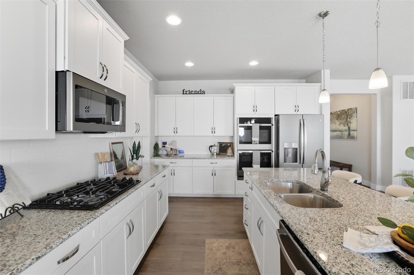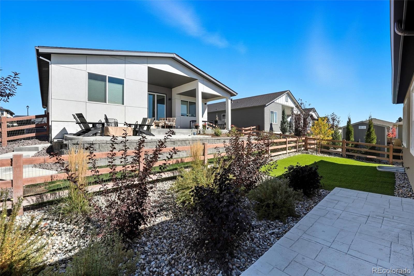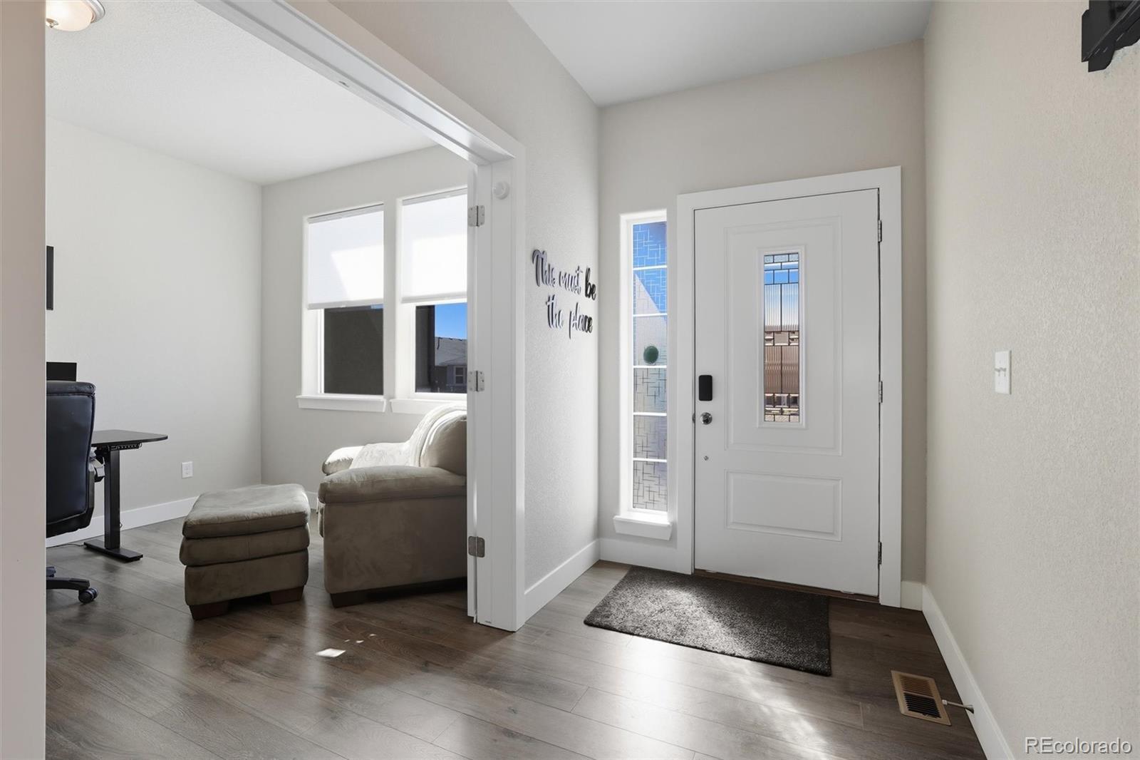 This immaculate, sun-drenched newer Wolf Ranch home pairs fresh style with a smart layout that makes daily life flow effortlessly. From the covered entry, step inside to find warm wood laminate floors and a sunlit office tucked to the right. The heart of the home opens into a spacious great room, where a stone gas fireplace anchors the space and walls of windows fill it with light. The dining area extends naturally outdoors with a walkout to the backyard patio. The kitchen is designed to gather around, with granite counters, a large eat-at island, stainless steel appliances including a gas cooktop and in-wall double oven, and a generous walk-in pantry with added shelving. A well-planned laundry room makes chores feel simple, complete with extra storage and a permanent acacia folding table. On the main level, the primary suite is a restful retreat featuring a walk-in closet and a four-piece bath with a double granite vanity and a walk-in shower. Two additional bedrooms, a full bath, and a powder room complete the layout. Downstairs, the finished basement stretches out with an enormous family and rec room, a dining nook, full bath, and two more bedrooms—one with its own nook, den, or walk-in closet—giving everyone space to spread out. Out back, the partially covered patio looks over the xeriscaped yard, designed for low maintenance and easy evenings outside. A three-car tandem garage provides ample space for vehicles, hobbies, or storage. Thoughtful details like central A/C and a whole-house humidifier keep the home comfortable year-round, while mountain views from the front are a daily reminder of Colorado living at its best. Finally, Wolf Ranch ties it all together with winding trails, a vibrant community center, and quick access to schools, shopping, hospitals, and entertainment—placing comfort and connection right at your doorstep.