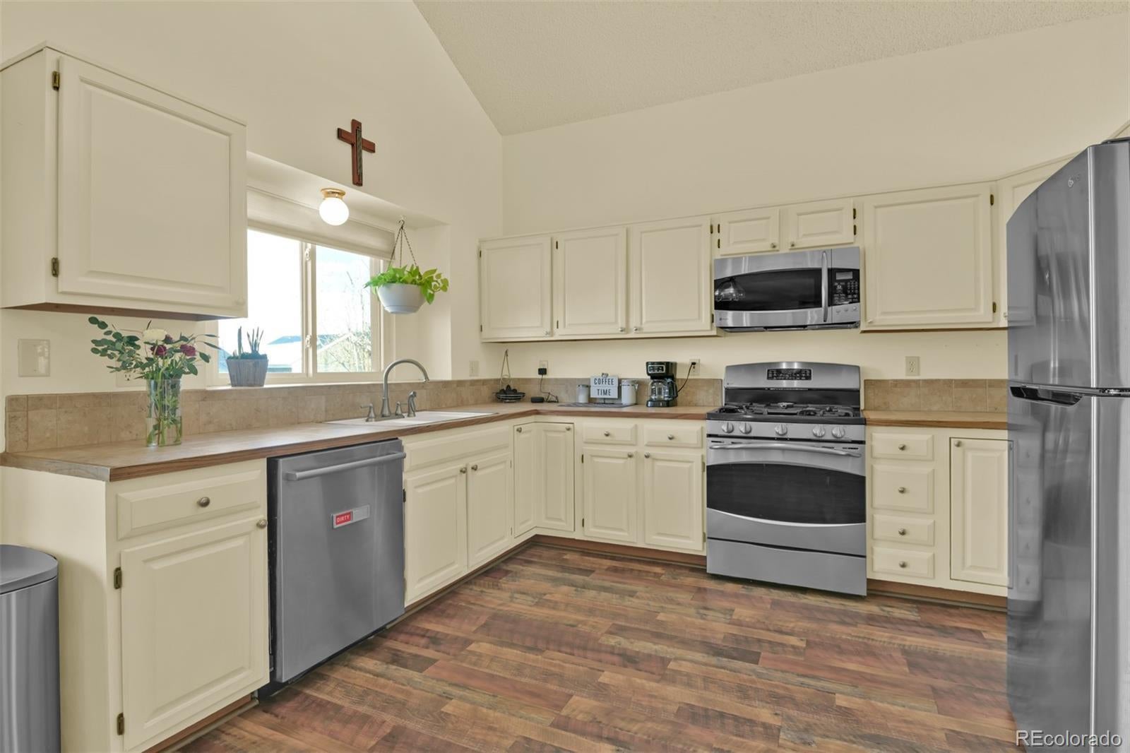 Welcome to this 4-bedroom, 4-bathroom home nestled in a desirable west side Colorado Springs neighborhood, just minutes from Garden of the Gods, Ute Valley Park, close to hiking and biking trails, shopping and restaurants as well as quick access to I-25. Step inside to discover a bright and inviting main level featuring vaulted ceilings, new upgraded LVP flooring, and a thoughtfully designed layout ideal for both everyday living and entertaining. The main level offers both an open living room sand a great room style family room with fireplace and a well equipped kitchen with lots of counter space, an eat-in breakfast nook, stainless steel appliances, gas cooking, and a walk-out to the deck. Upstairs, you can retreat to the primary suite with a full ensuite bathroom, dual vanities and a walk-in closet. Two additional secondary bedrooms and a full bathroom complete the upper level, all featuring new carpet. The fully finished basement expands your living space with a large family room, a well-equipped wet bar ideal for entertaining, an additional good sized bedroom, and a full bathroom which is perfect for guests or multi-generational living. With its prime location and generous spaces, this home is a great choice for Colorado Springs west side living.
