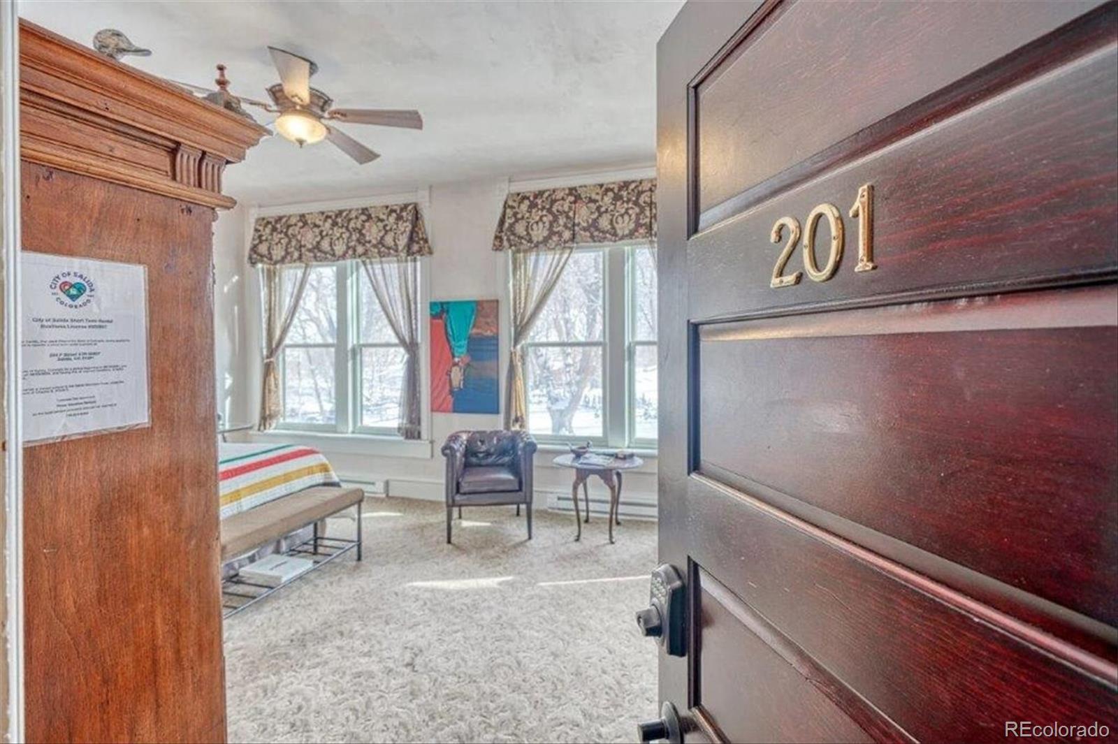 THE PALACE HOTEL CONDOMINIUMS, UNIT #201, RENOVATED WHILE MAINTAINING THE WONDERFUL HISTORICAL FEATURES, IS IN THE PERFECT LOCATION IN THE HEART OF DOWNTOWN SALIDA...STEPS TO THE ARKANSAS RIVER, NEXT TO BEAUTIFUL RIVERSIDE PARK, AND EASY WALKING DISTANCE TO ALL THE UNIQUE STORES, RESTAURANTS, BARS, BREWERIES & AMBIANCE OF THIS AMAZING COLORADO MOUNTAIN TOWN! THESE MUCH SOUGHT-AFTER PROPERTIES DO NOT BECOME AVAILABLE VERY OFTEN! YOU WILL FALL IN LOVE WITH THE CHARM, ELIQUENSE, HISTORY, & IMPECCABLE CONDITION OF THIS MAGNIFICENT BUILDING! UNIT 201 IS FILLED WITH INCREDIBLE TONS OF NATURAL LIGHT BEAMING IN FROM ALMOST FLOOR-TO-CEILING WALL OF WINDOWS FACING SOUTH & EAST....VIEWS FROM EVERYWHERE IN THIS GORGEOUS LOCATION INCLUDING THE POPULAR S MOUNTAIN! #201 COMES FULLY FURNISHED & IS TURN-KEY CONDITION WITH A QUEEN-SIZED BED, LEATHER CHAIRS, BEAUTIFUL ONE-OF-A-KIND AMOIRE & END TABLES, KITCHEN TABLE & CLASSIC CHAIRS & MORE...SO COMFORTABLE BUT VERY CHARMING! THE KITCHEN HAS ALL THE ESSENTIALS THAT YOU WOULD WANT TO PREPARE SPECIAL MEALS BUT IF NOT YOU ARE STEPS AWAY FROM MANY DIFFERENT DINING OPTIONS THAT HISTORIC DOWNTOWN SALIDA HAS TO OFFER! THE COMMON AREAS OF THE BUILDING ARE MAINTAINED AS THEY WERE ORIGINALLY FINISHED WHICH IS VERY ENCHANTING & WONDERFULLY FINISHED DETAILS! SALIDA OFFERS OPPORTUNITIES FOR MANY ADVENTURES...HIKING, BIKING, RAFTING & SURFING THE SCENIC RIVER, FLY-FISHING, HOT SPRINGS, SKIING POPULAR MONARCH MOUNTAIN, SIGHTSEEING OR EVEN PLAYING A ROUND OF GOLF....VERY DOG-FRIENDLY TOWN! THIS IS THE ONE YOU HAVE BEEN WAITING FOR...CURRENTLY BEING USED AS A SHORT-TERM RENTAL BUT COULD BE A LONG-TERM RENTAL OR A PRIVATE SPECIAL MOUNTAIN GETAWAY! CHECK FOR DETAILS FOR RENTAL USE WITH THE CITY OF SALIDA! WELCOME HOME TO A VERY UNIQUE & UPSCALE PROPERTY THAT WILL RELAX & ENERGIZE YOUR SPIRIT! THIS IS A 12+ & HAS BEEN MAINTAINED IN TOP CONDITION & IS SQUEAKY CLEAN!