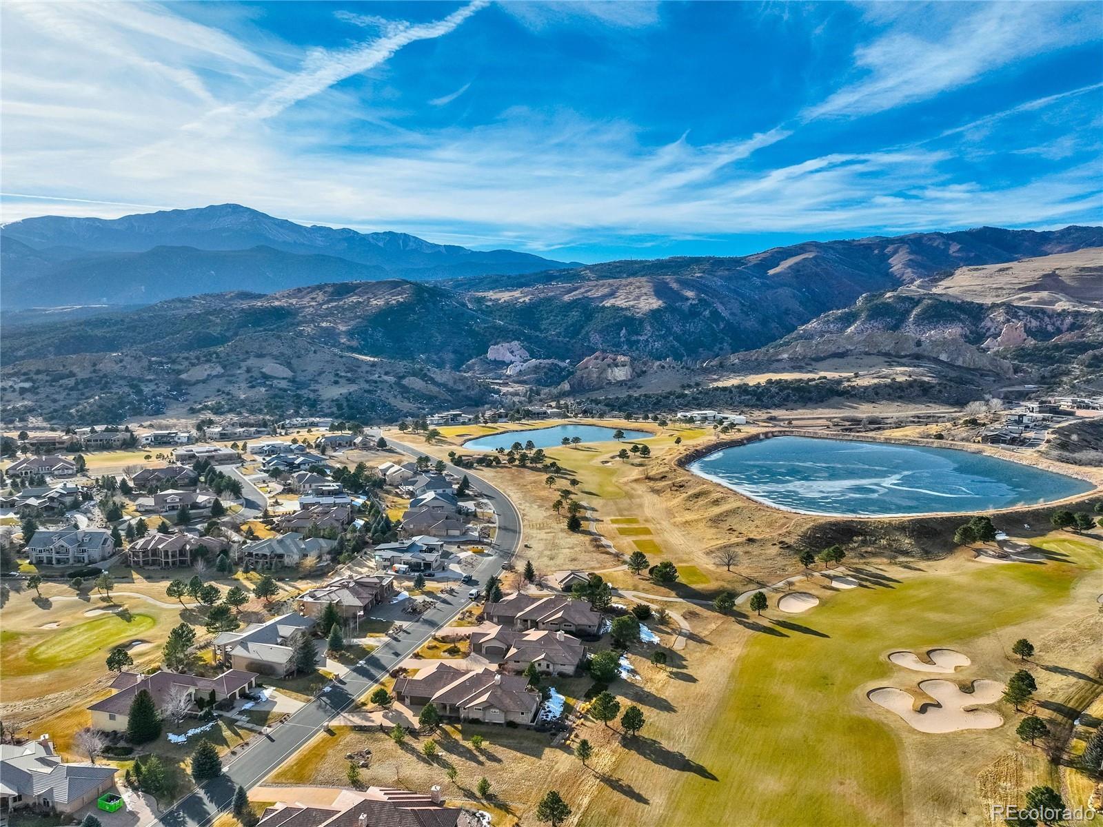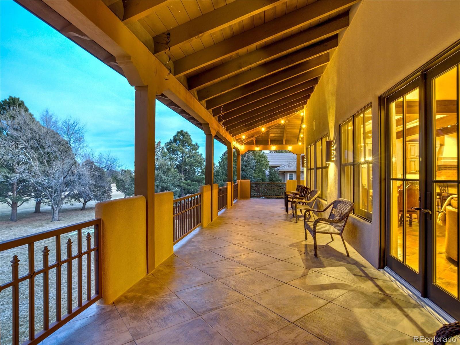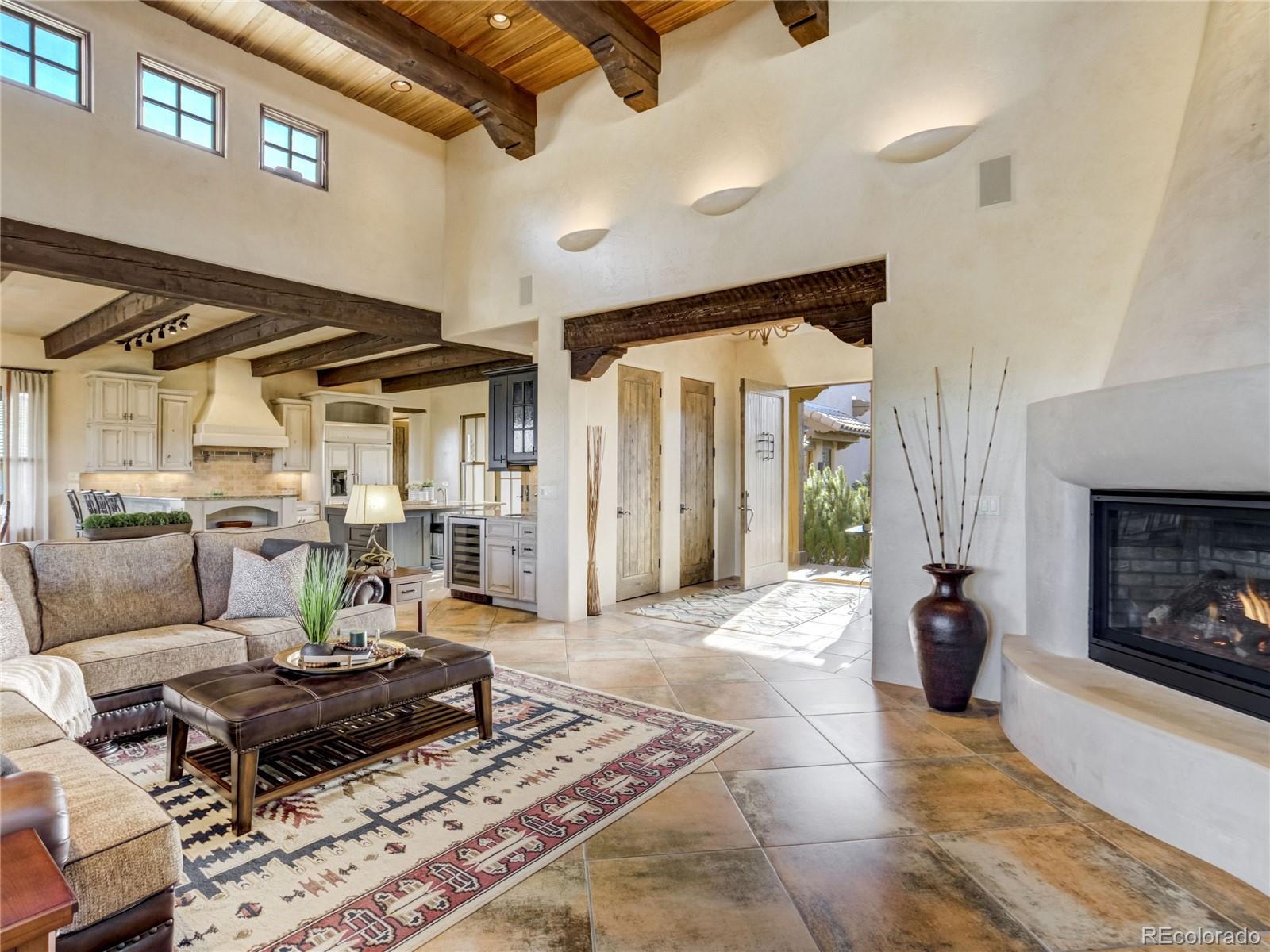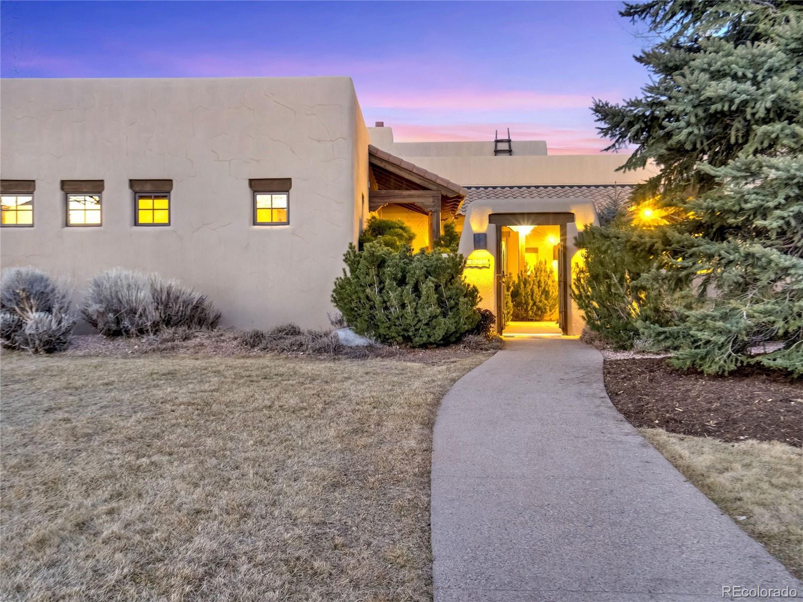 Welcome to Casa Estancia — where Santa Fe–inspired Pueblo Revival architecture meets elevated living in the gated community of Kissing Camels. Here, the soul of the home exudes tranquility. Originally crafted as an acclaimed builder’s personal residence, this timeless home reflects intentional design, enduring materials, and architectural warmth throughout. It lives like a retreat bathed in serenity, seamlessly blending indoor and outdoor living. The substantial outdoor courtyard, anchored by a kiva fireplace, frames Pikes Peak beneath breathtaking mountain sunsets—where firelight harmonizes with a soul-inspiring Colorado sky. At the rear, a wood-beamed concrete patio overlooks pine-lined open space along the 9th fairway with quiet privacy, sweeping golf course views, and radiant Colorado sunrises. The thoughtfully designed floorplan emphasizes main-level living. A rare 700+ square-foot main-level attached casita allows exceptional flexibility for multigenerational living, extended guests, or a private executive suite. Throughout the home, substantial granite surfaces, custom cabinetry, and illuminated art niches reflect elevated craftsmanship. Five artistic kiva fireplaces add warmth and architectural character, while a private wine cellar and steam shower in the primary bath enhance everyday luxury. The walkout lower level expands the retreat experience, opening to a private patio and featuring a wet bar, exercise room, two bedrooms with en-suite baths, and abundant storage. An oversized garage with a dedicated storage room, plus additional lower-level storage, ensures practical functionality. Situated on a flat mesa, Kissing Camels is known for its walkable streets, e-bike-friendly terrain, and striking views of Garden of the Gods and Pikes Peak. Optional club membership provides premier golf, wellness, tennis, pickleball, dining, and vibrant social amenities. Casa Estancia is a private sanctuary where design, landscape, and lifestyle converge in rare harmony.