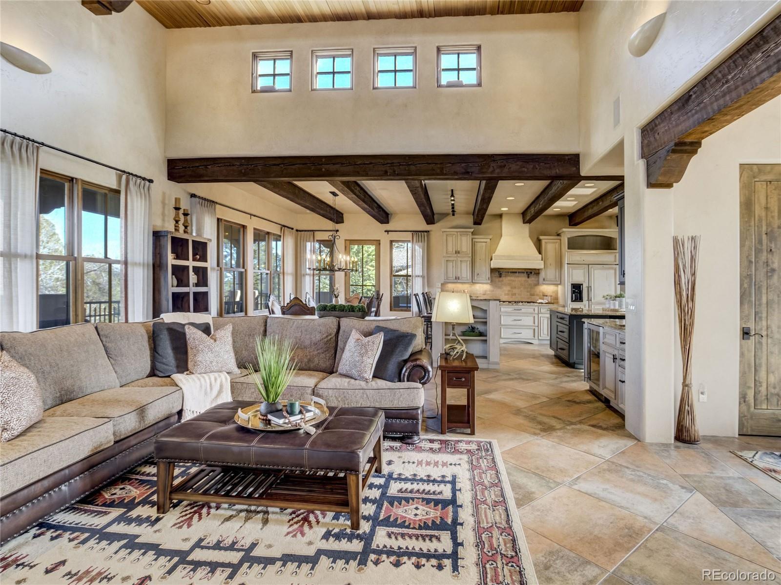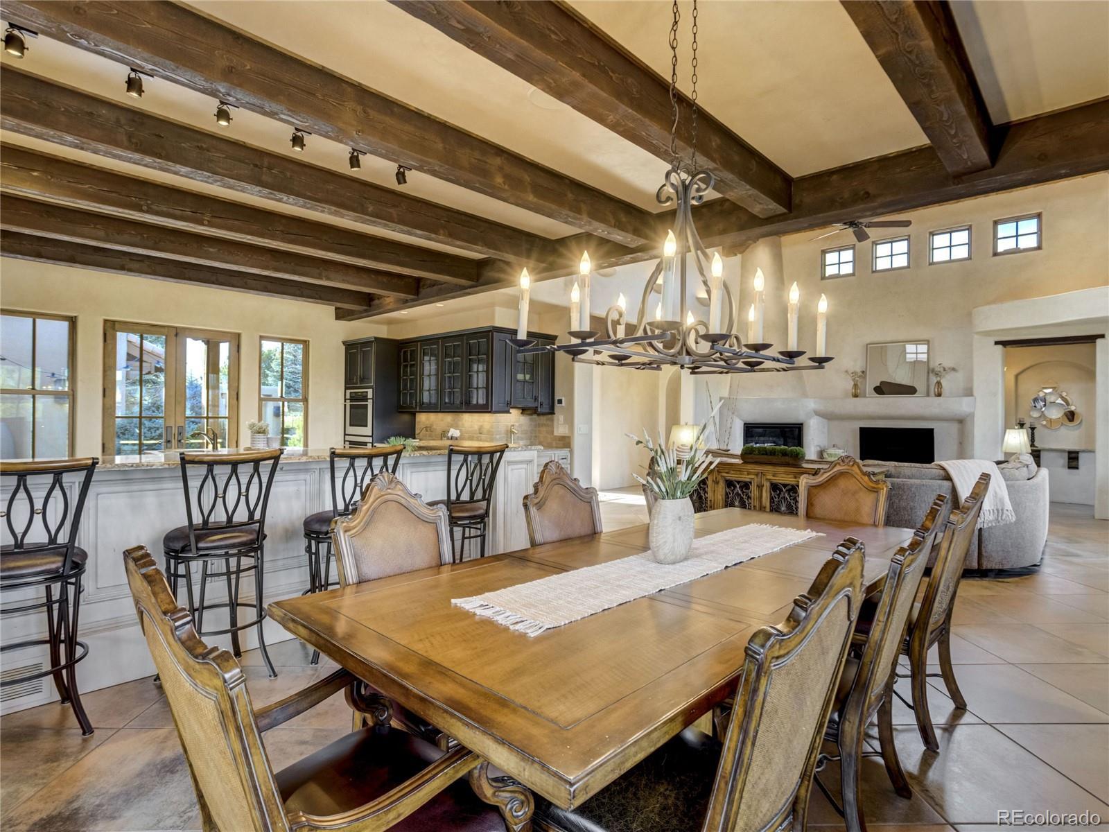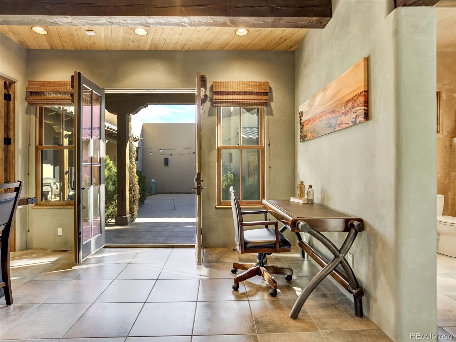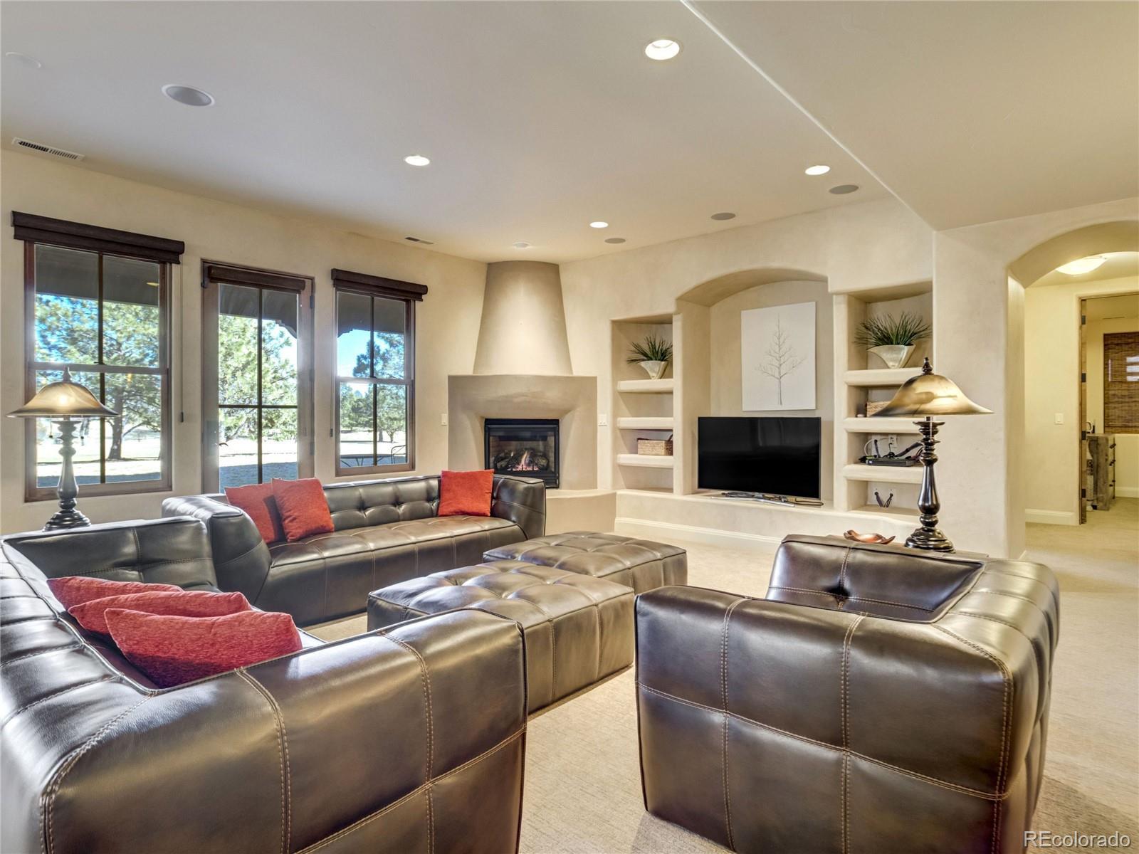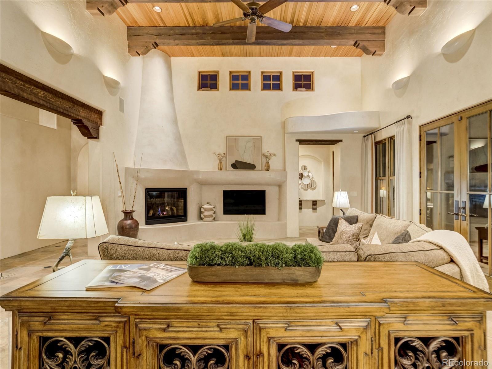 Welcome to Casa Estancia — where Santa Fe–inspired Pueblo Revival architecture meets elevated living in the gated community of Kissing Camels. Here, the soul of the home exudes tranquility. Originally crafted as an acclaimed builder’s personal residence, this timeless home reflects intentional design, enduring materials, and architectural warmth throughout. It lives like a retreat bathed in serenity, seamlessly blending indoor and outdoor living. The substantial outdoor courtyard, anchored by a kiva fireplace, frames Pikes Peak beneath breathtaking mountain sunsets—where firelight harmonizes with a soul-inspiring Colorado sky. At the rear, a wood-beamed concrete patio overlooks pine-lined open space along the 9th fairway with quiet privacy, sweeping golf course views, and radiant Colorado sunrises. The thoughtfully designed floorplan emphasizes main-level living. A rare 700+ square-foot main-level attached casita allows exceptional flexibility for multigenerational living, extended guests, or a private executive suite. Throughout the home, substantial granite surfaces, custom cabinetry, and illuminated art niches reflect elevated craftsmanship. Five artistic kiva fireplaces add warmth and architectural character, while a private wine cellar and steam shower in the primary bath enhance everyday luxury. The walkout lower level expands the retreat experience, opening to a private patio and featuring a wet bar, exercise room, two bedrooms with en-suite baths, and abundant storage. An oversized garage with a dedicated storage room, plus additional lower-level storage, ensures practical functionality. Situated on a flat mesa, Kissing Camels is known for its walkable streets, e-bike-friendly terrain, and striking views of Garden of the Gods and Pikes Peak. Optional club membership provides premier golf, wellness, tennis, pickleball, dining, and vibrant social amenities. Casa Estancia is a private sanctuary where design, landscape, and lifestyle converge in rare harmony.