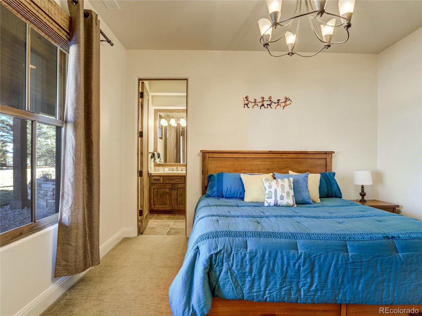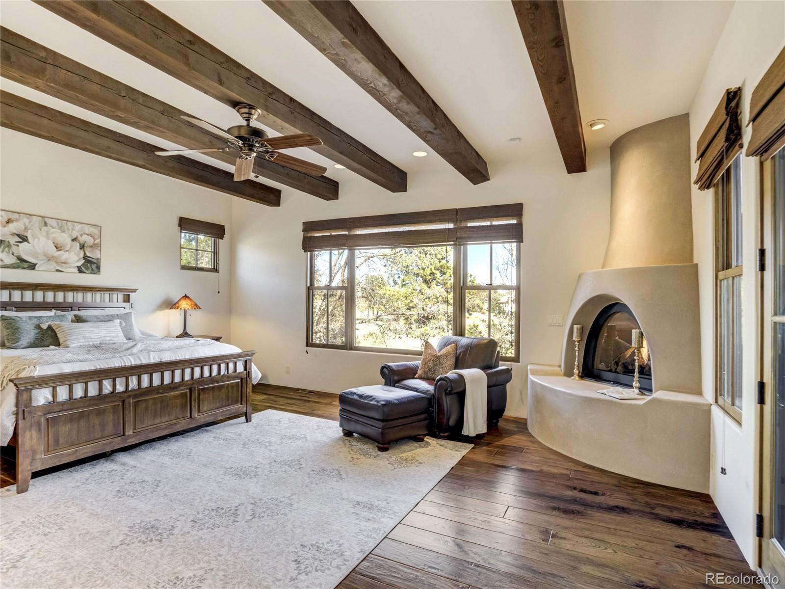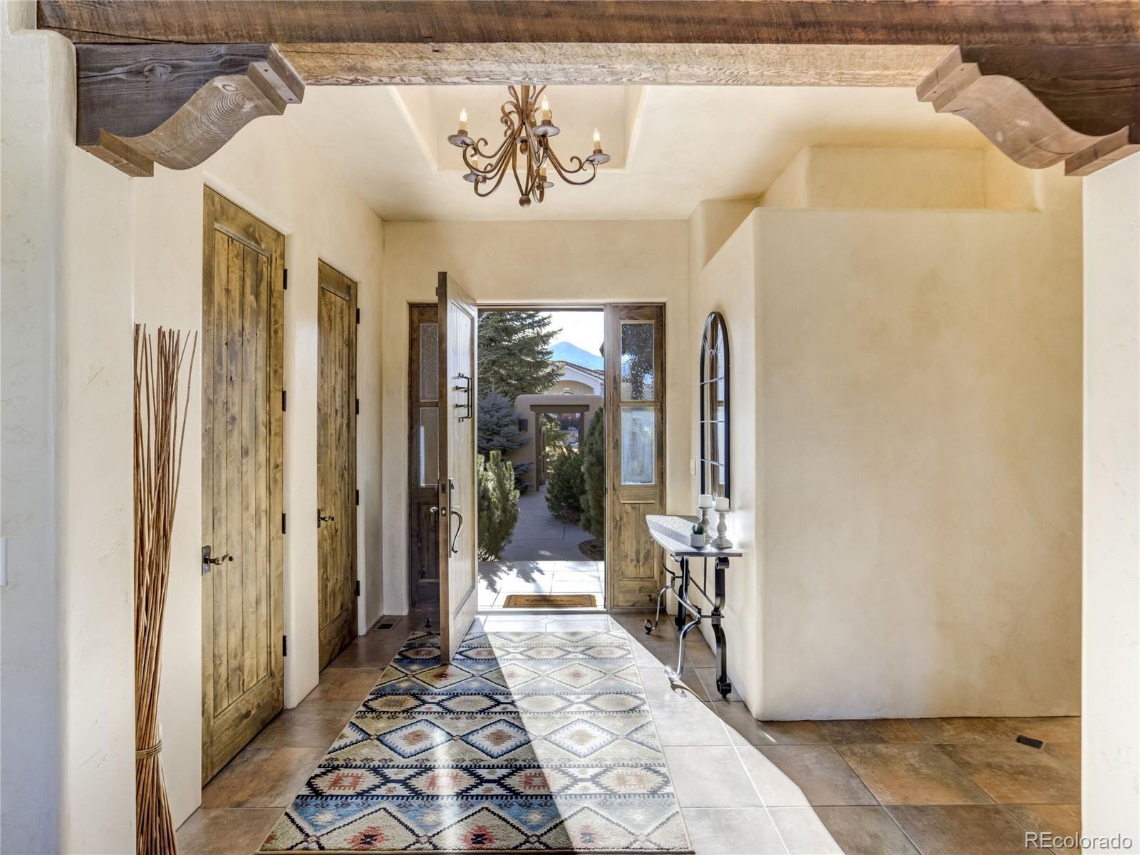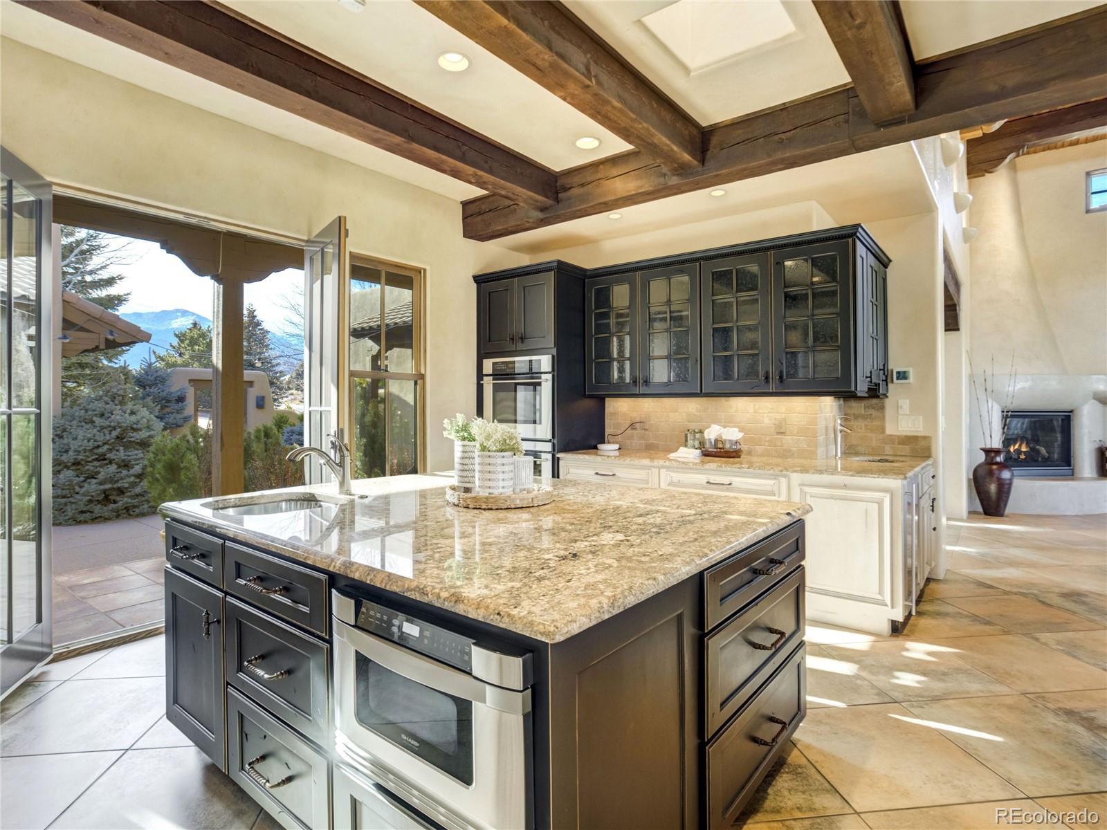 Welcome to Casa Estancia — where Santa Fe–inspired Pueblo Revival architecture meets elevated living in the gated community of Kissing Camels. Here, the soul of the home exudes tranquility. Originally crafted as an acclaimed builder’s personal residence, this timeless home reflects intentional design, enduring materials, and architectural warmth throughout. It lives like a retreat bathed in serenity, seamlessly blending indoor and outdoor living. The substantial outdoor courtyard, anchored by a kiva fireplace, frames Pikes Peak beneath breathtaking mountain sunsets—where firelight harmonizes with a soul-inspiring Colorado sky. At the rear, a wood-beamed concrete patio overlooks pine-lined open space along the 9th fairway with quiet privacy, sweeping golf course views, and radiant Colorado sunrises. The thoughtfully designed floorplan emphasizes main-level living. A rare 700+ square-foot main-level attached casita allows exceptional flexibility for multigenerational living, extended guests, or a private executive suite. Throughout the home, substantial granite surfaces, custom cabinetry, and illuminated art niches reflect elevated craftsmanship. Five artistic kiva fireplaces add warmth and architectural character, while a private wine cellar and steam shower in the primary bath enhance everyday luxury. The walkout lower level expands the retreat experience, opening to a private patio and featuring a wet bar, exercise room, two bedrooms with en-suite baths, and abundant storage. An oversized garage with a dedicated storage room, plus additional lower-level storage, ensures practical functionality. Situated on a flat mesa, Kissing Camels is known for its walkable streets, e-bike-friendly terrain, and striking views of Garden of the Gods and Pikes Peak. Optional club membership provides premier golf, wellness, tennis, pickleball, dining, and vibrant social amenities. Casa Estancia is a private sanctuary where design, landscape, and lifestyle converge in rare harmony.