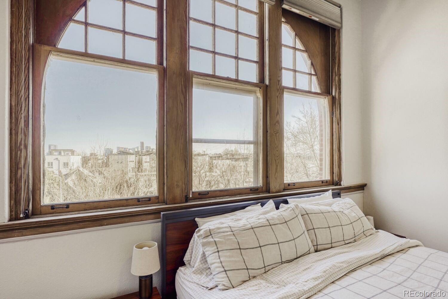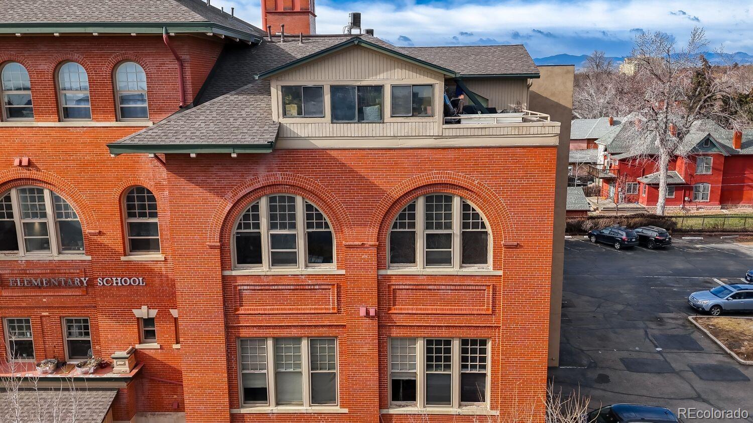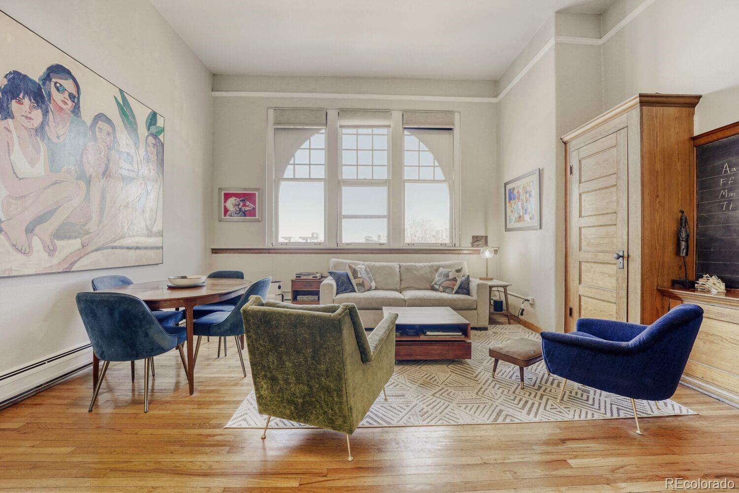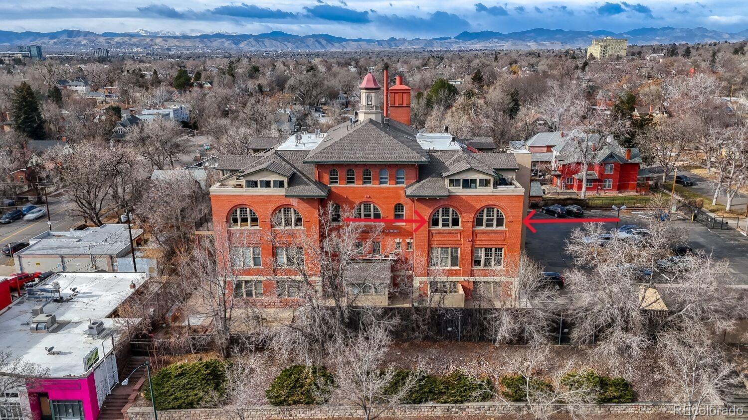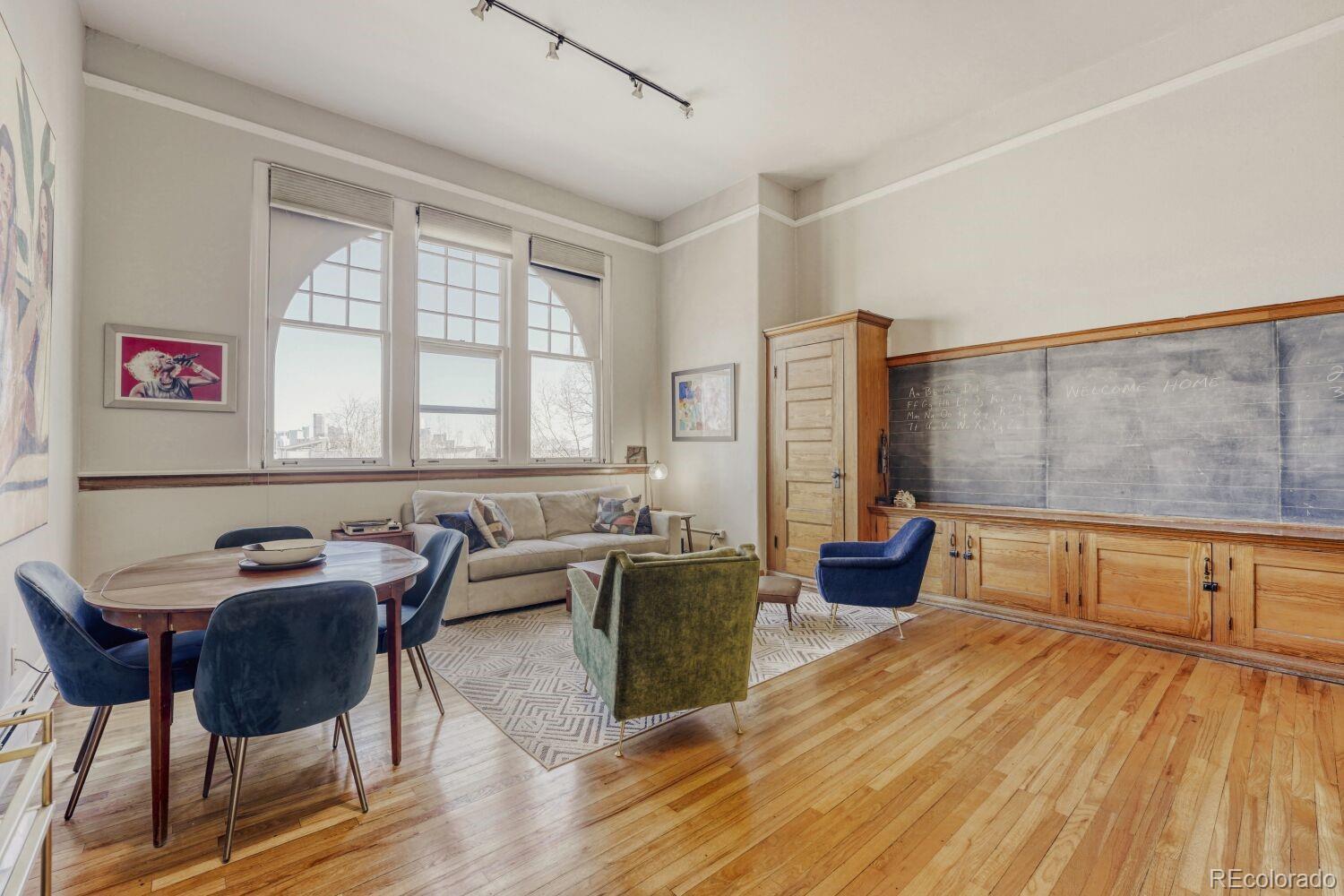 Located in the desirable Highlands/Sloans Lake neighborhood the historic Boulevard Elementary Schoolhouse was built in 1904 and converted into 28 one-of-a kind condominium units in 1984. Welcome to unit #306 which showcases the original classroom blackboard and storage cupboards and wood floors. Renovated in 2014 with appreciation/preservation of the history. 2014 Kitchen renovation includes, white shaker door fronts, slide-out cabinet inserts, new sink, Soapstone countertops, hood vented to the exterior, refrigerator new 2023, garbage disposal new 2024, dishwasher new 2017. The ¾ bathroom was renovated with a Vintage 1963 American Standard vanity with a pink sink, oversized shower, custom tile. A full en-suite bathroom was added in what was originally the cloakroom of the schoolhouse this features a Vintage 1910 clawfoot tub and Vintage wall mounted sink, in floor heating, original coat hooks and moldings were carefully removed and reattached in the bath and back hallway/closet. Interior doors are repurposed/restored, custom-milled 5 panel solid wood with antique crystal doorknobs. Dramatic arched windows to show off the spectacular City views feature custom Hunter Douglas double blinds for thermal, noise and light protection. Watch fireworks from your Livingroom at the sports stadiums within view. Private in unit laundry. Gated secure parking space #39 and guest parking. Indoor secure bicycle locker room with spaces for rent. Outdoor community gathering space with a BBQ grill. Amazon delivery lockers located within the secure gated lot.