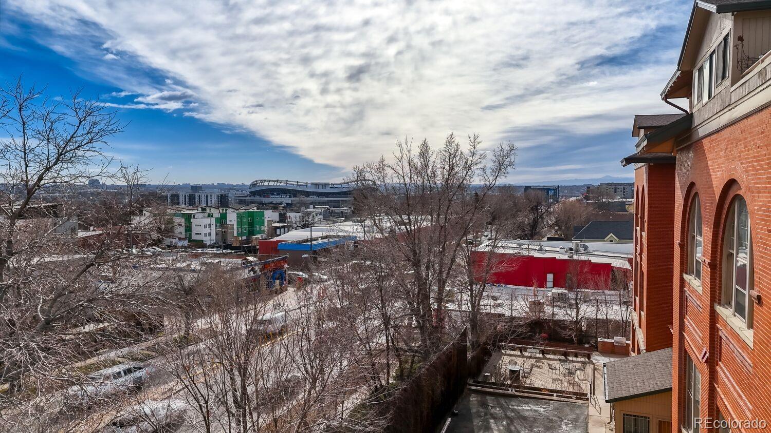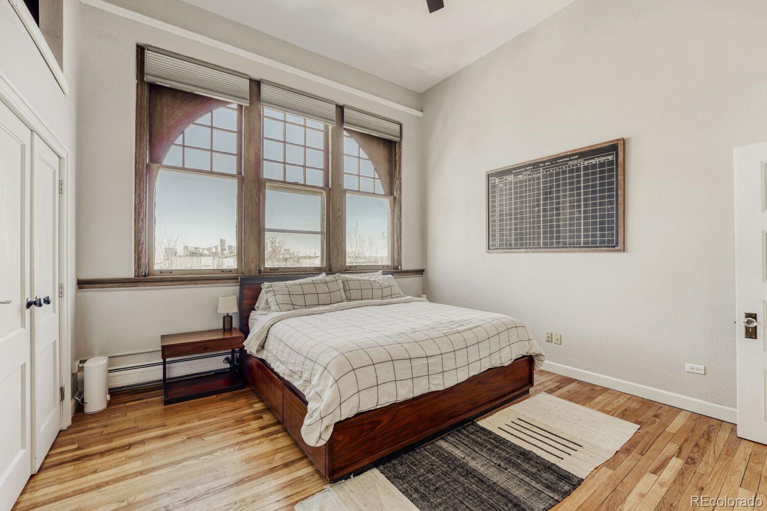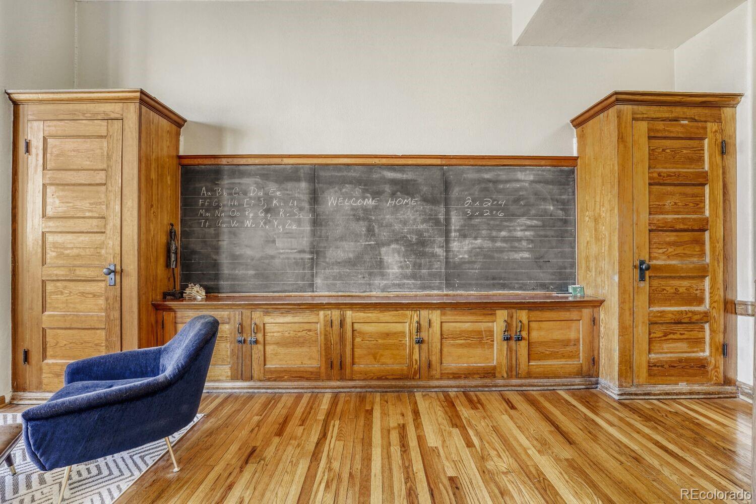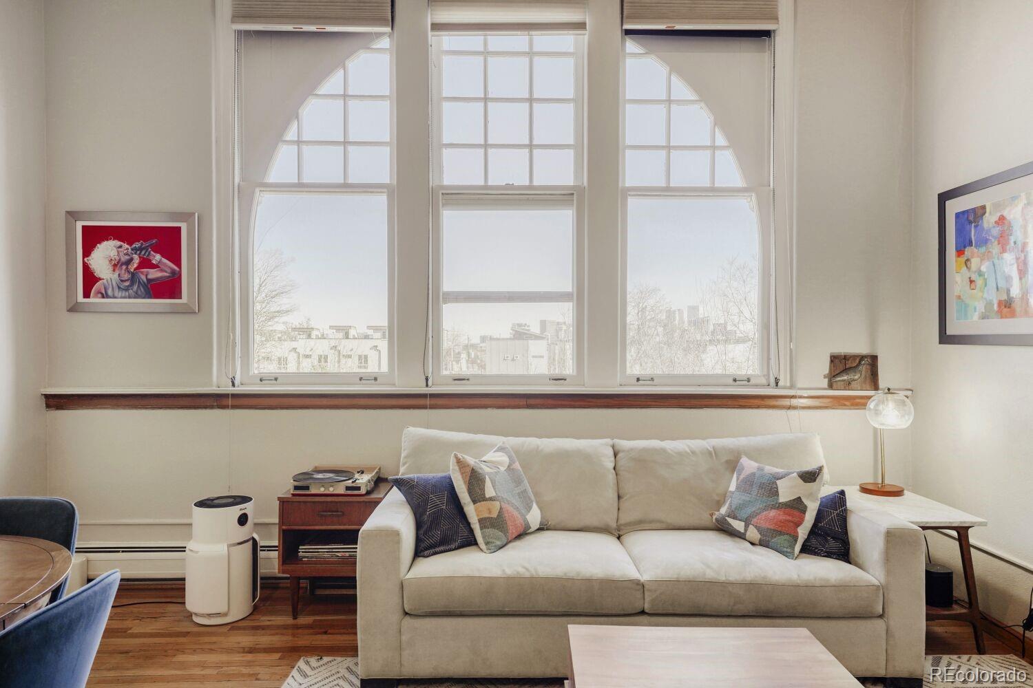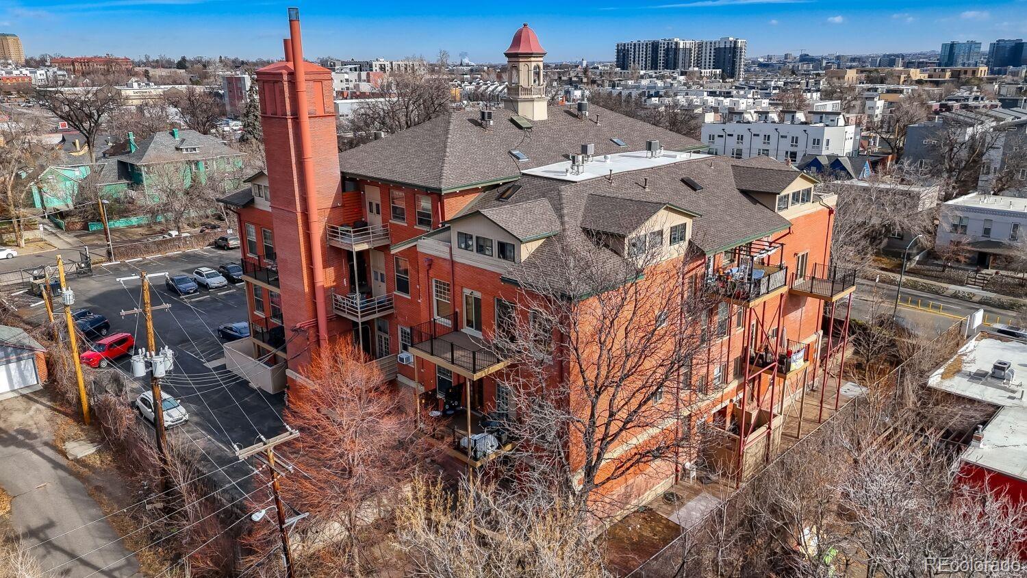 Located in the desirable Highlands/Sloans Lake neighborhood the historic Boulevard Elementary Schoolhouse was built in 1904 and converted into 28 one-of-a kind condominium units in 1984. Welcome to unit #306 which showcases the original classroom blackboard and storage cupboards and wood floors. Renovated in 2014 with appreciation/preservation of the history. 2014 Kitchen renovation includes, white shaker door fronts, slide-out cabinet inserts, new sink, Soapstone countertops, hood vented to the exterior, refrigerator new 2023, garbage disposal new 2024, dishwasher new 2017. The ¾ bathroom was renovated with a Vintage 1963 American Standard vanity with a pink sink, oversized shower, custom tile. A full en-suite bathroom was added in what was originally the cloakroom of the schoolhouse this features a Vintage 1910 clawfoot tub and Vintage wall mounted sink, in floor heating, original coat hooks and moldings were carefully removed and reattached in the bath and back hallway/closet. Interior doors are repurposed/restored, custom-milled 5 panel solid wood with antique crystal doorknobs. Dramatic arched windows to show off the spectacular City views feature custom Hunter Douglas double blinds for thermal, noise and light protection. Watch fireworks from your Livingroom at the sports stadiums within view. Private in unit laundry. Gated secure parking space #39 and guest parking. Indoor secure bicycle locker room with spaces for rent. Outdoor community gathering space with a BBQ grill. Amazon delivery lockers located within the secure gated lot.