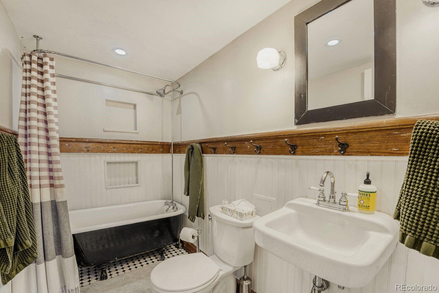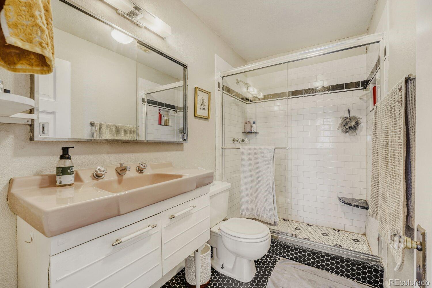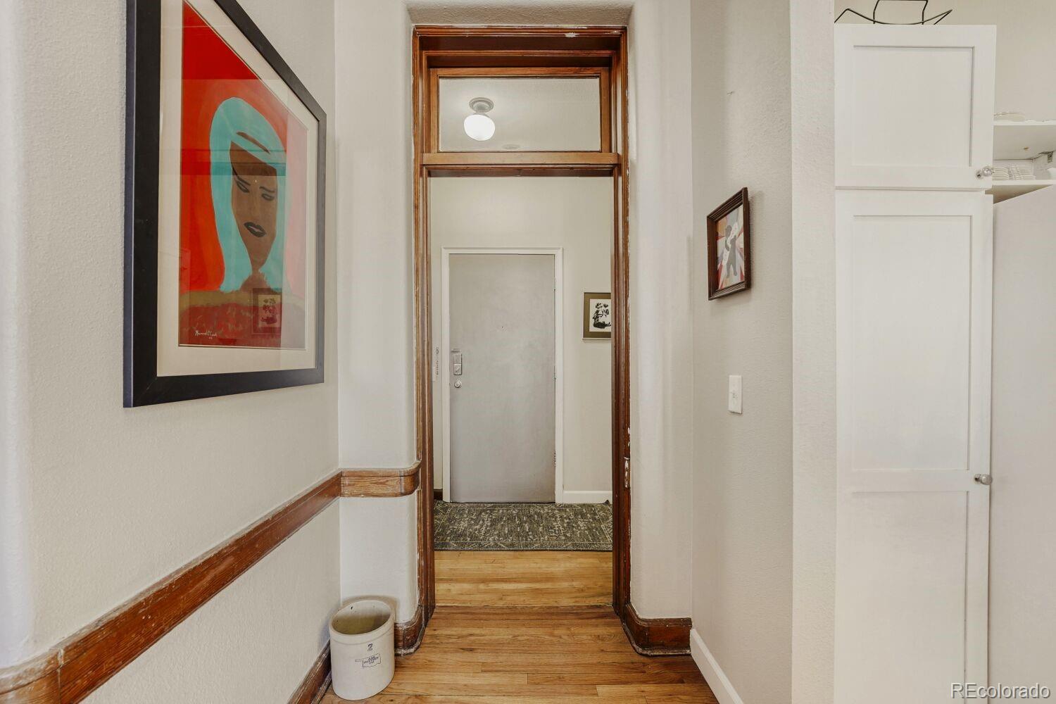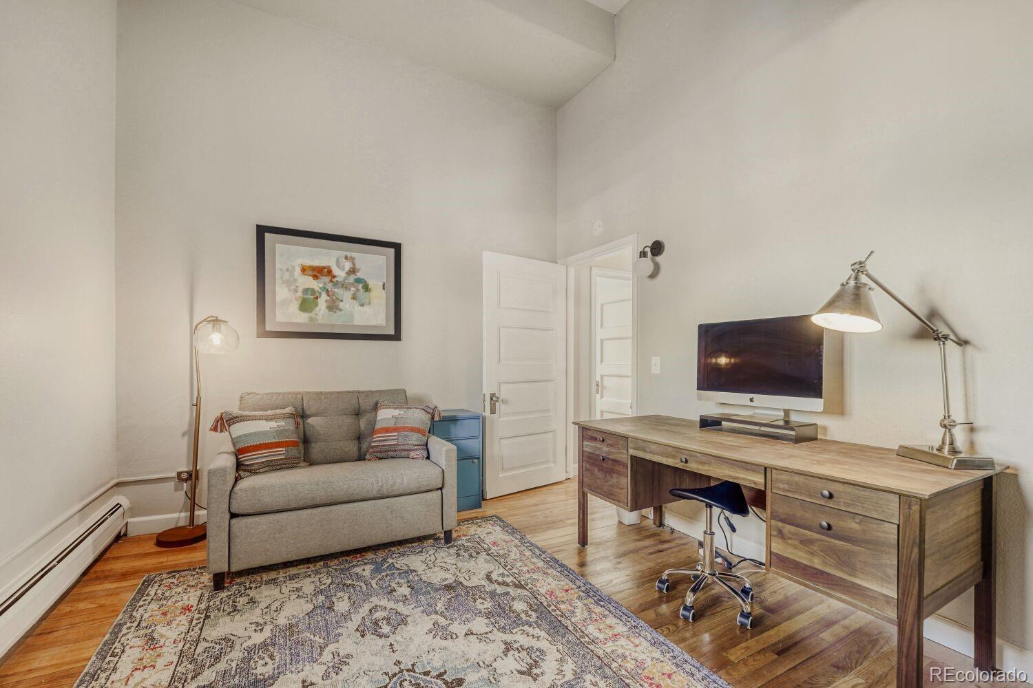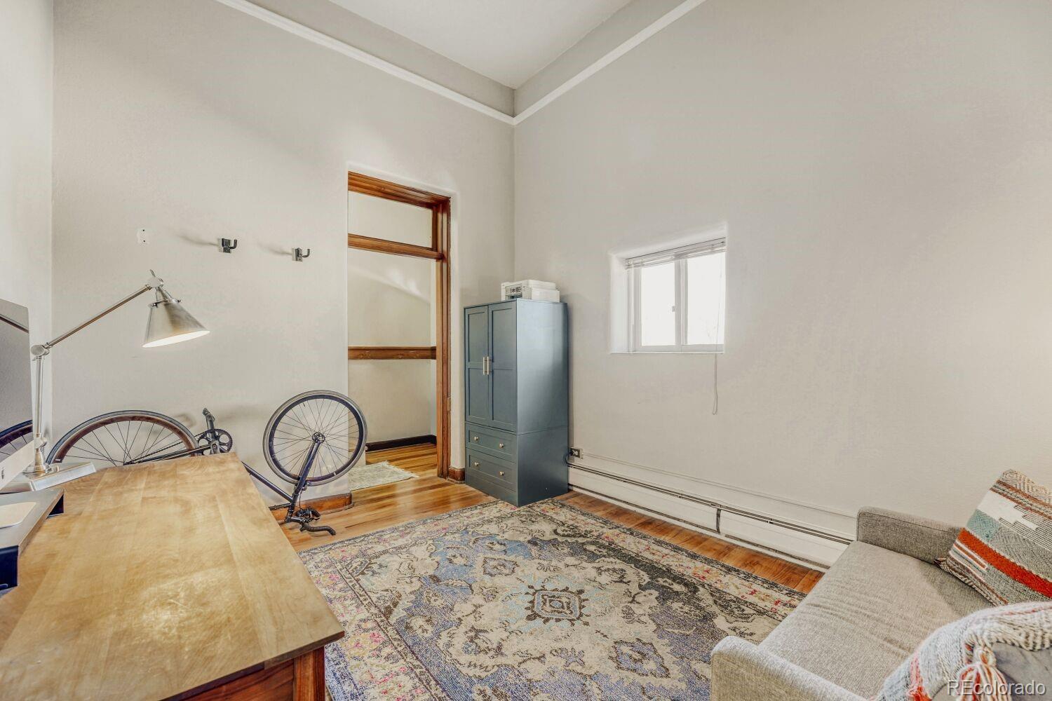 Located in the desirable Highlands/Sloans Lake neighborhood the historic Boulevard Elementary Schoolhouse was built in 1904 and converted into 28 one-of-a kind condominium units in 1984. Welcome to unit #306 which showcases the original classroom blackboard and storage cupboards and wood floors. Renovated in 2014 with appreciation/preservation of the history. 2014 Kitchen renovation includes, white shaker door fronts, slide-out cabinet inserts, new sink, Soapstone countertops, hood vented to the exterior, refrigerator new 2023, garbage disposal new 2024, dishwasher new 2017. The ¾ bathroom was renovated with a Vintage 1963 American Standard vanity with a pink sink, oversized shower, custom tile. A full en-suite bathroom was added in what was originally the cloakroom of the schoolhouse this features a Vintage 1910 clawfoot tub and Vintage wall mounted sink, in floor heating, original coat hooks and moldings were carefully removed and reattached in the bath and back hallway/closet. Interior doors are repurposed/restored, custom-milled 5 panel solid wood with antique crystal doorknobs. Dramatic arched windows to show off the spectacular City views feature custom Hunter Douglas double blinds for thermal, noise and light protection. Watch fireworks from your Livingroom at the sports stadiums within view. Private in unit laundry. Gated secure parking space #39 and guest parking. Indoor secure bicycle locker room with spaces for rent. Outdoor community gathering space with a BBQ grill. Amazon delivery lockers located within the secure gated lot.