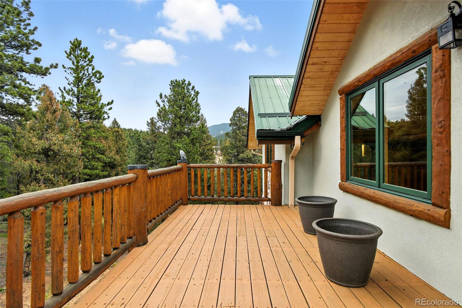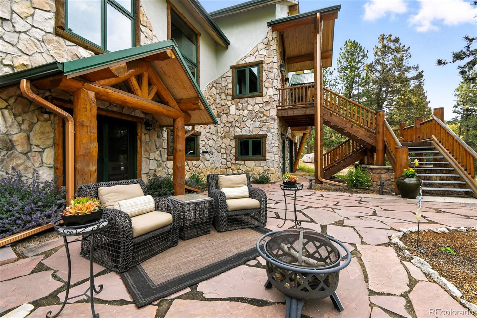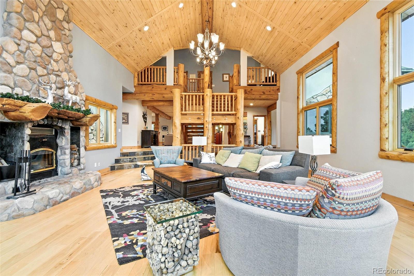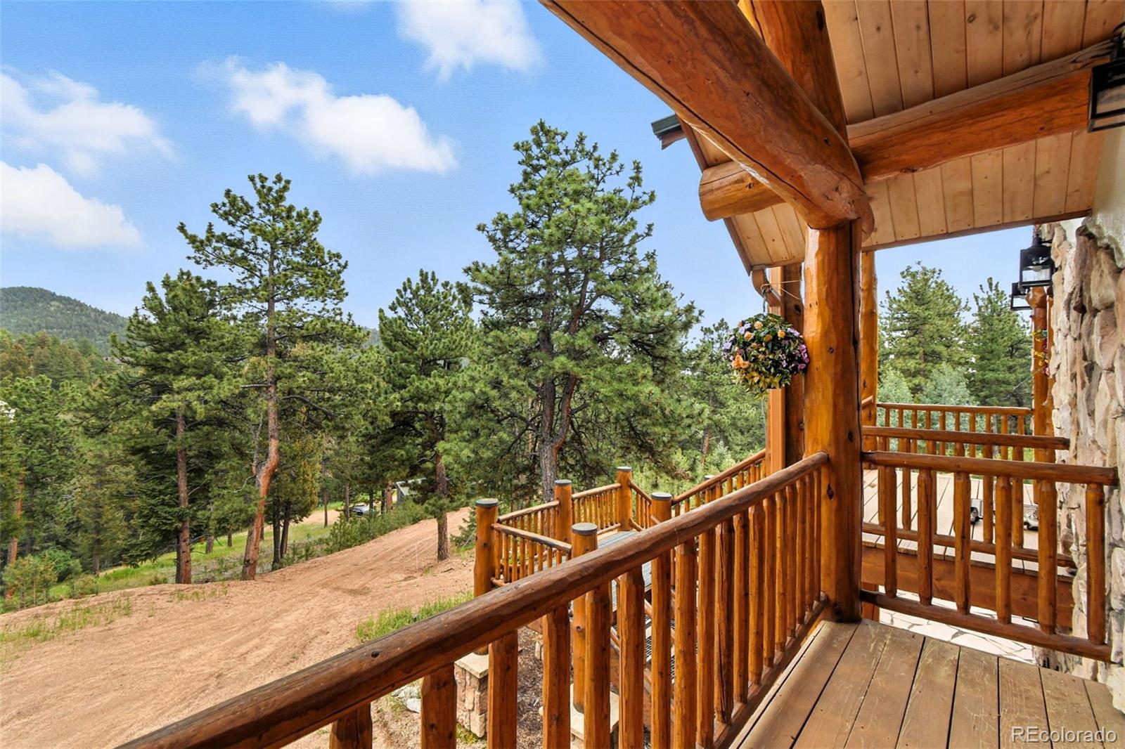 Live the Colorado dream in this stunning mountain retreat featuring rich log accents, custom wood trim, and a wall of windows that fills the vaulted living room with natural light. Cozy up by the moss rock fireplace or cook in the well-appointed kitchen with birch cabinets and granite countertops. Hickory floors, slate tile, and in-floor radiant heat add warmth and style. The spacious primary suite offers a luxurious five-piece bath with custom lead glass windows that offer a spectrum of colors to fill your soaking tub and a private 2,400 sf redwood deck for serene mountain views. This is a treed lot that was home to a horse family in the past and has the old stable to refinish or make into a diva den or sweat box sauna. The lower level has plenty of storage, a home gym, and space for a home theatre.