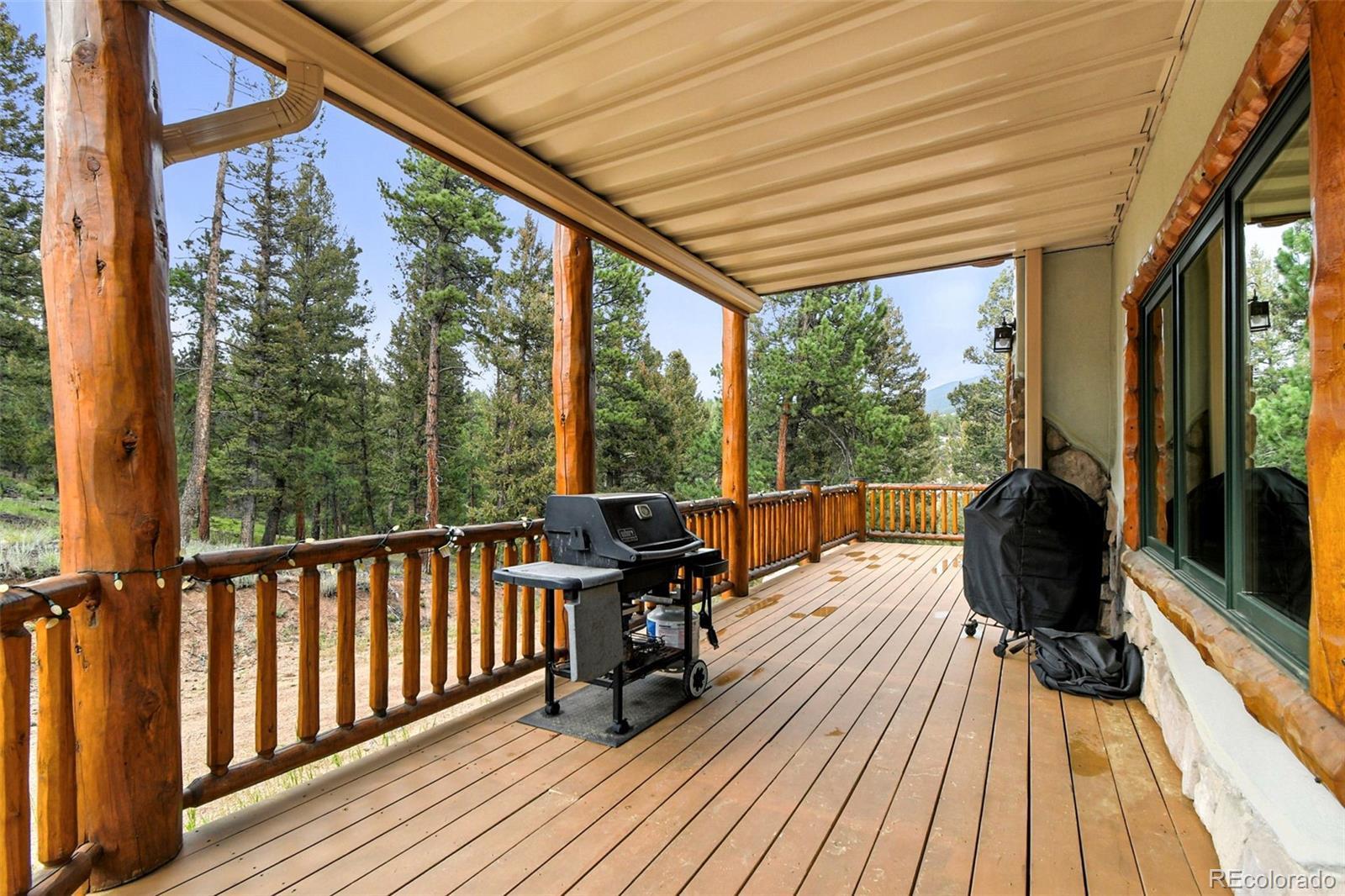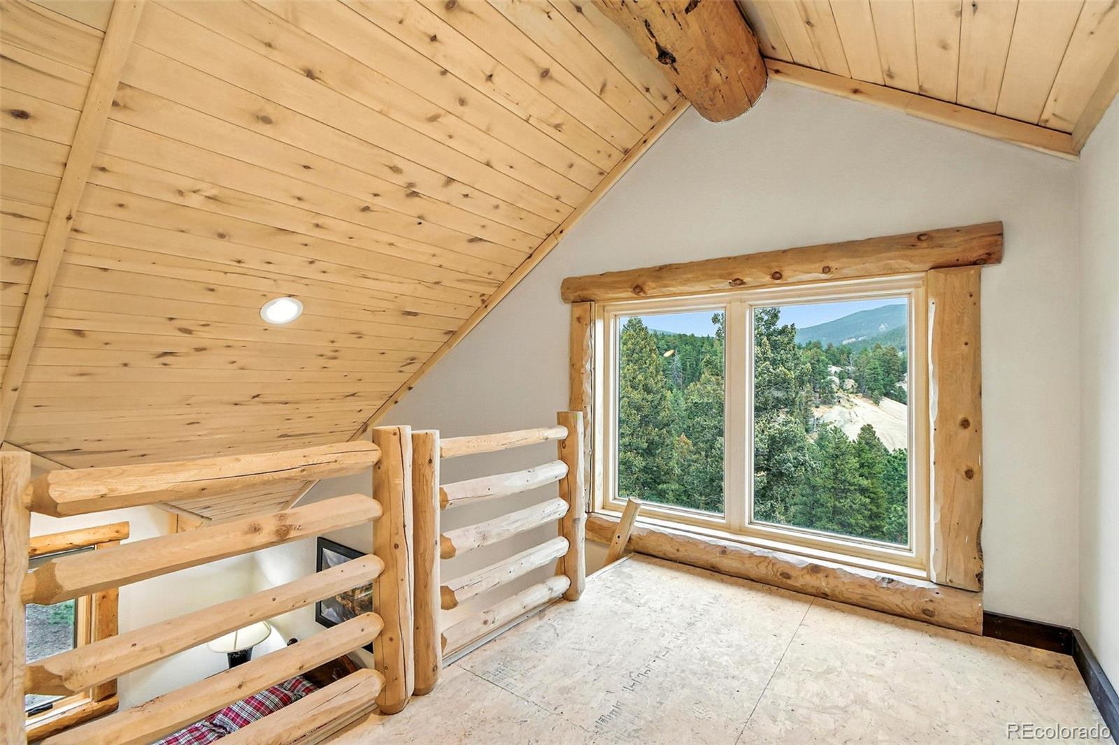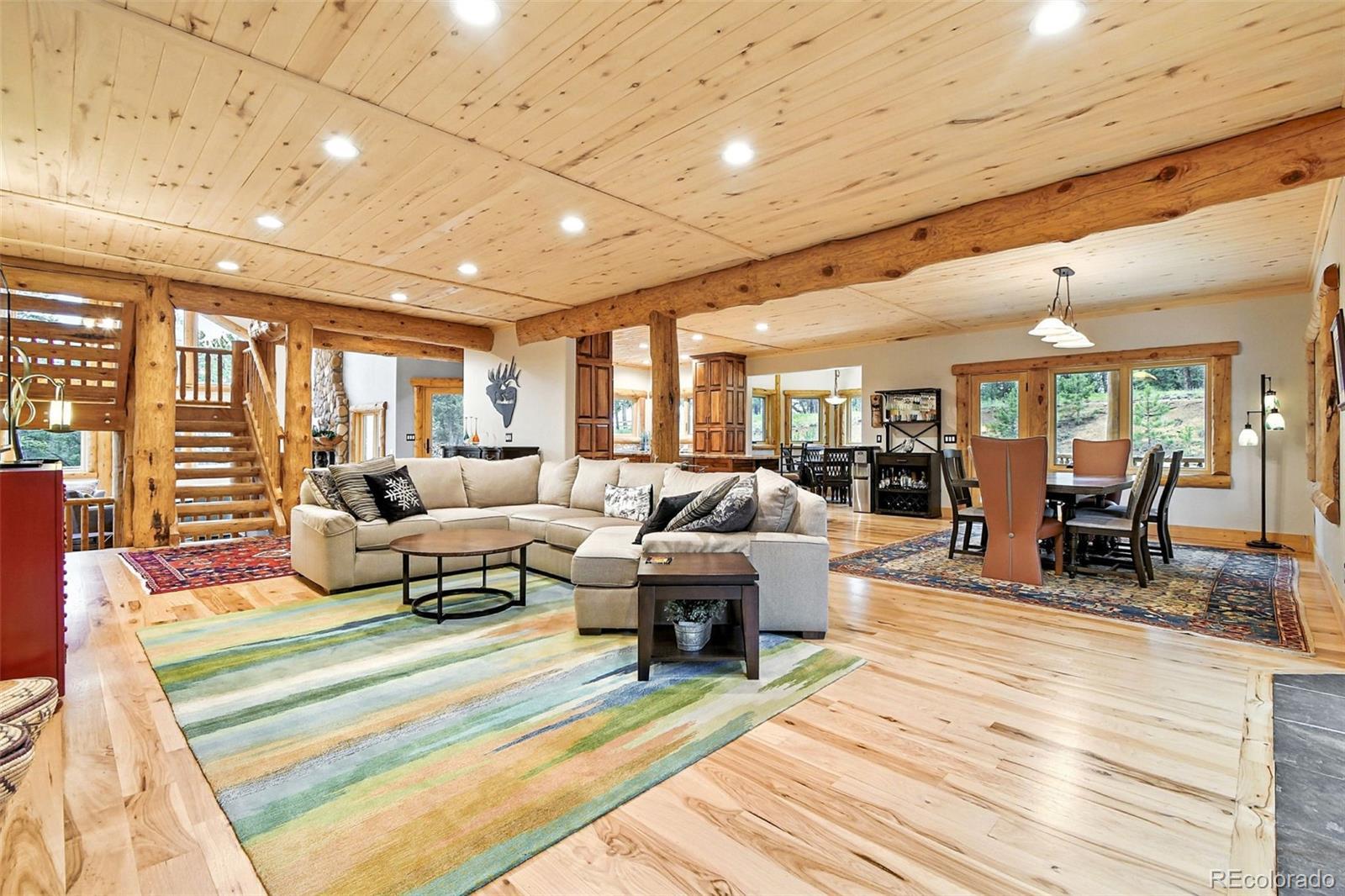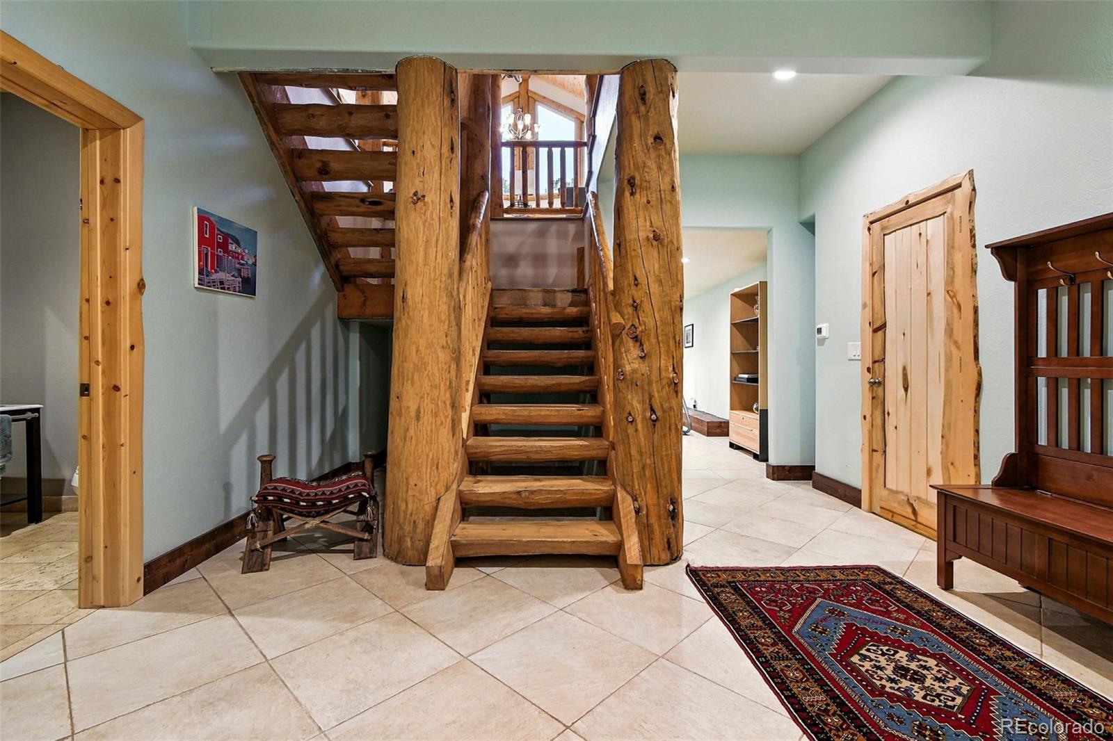 Live the Colorado dream in this stunning mountain retreat featuring rich log accents, custom wood trim, and a wall of windows that fills the vaulted living room with natural light. Cozy up by the moss rock fireplace or cook in the well-appointed kitchen with birch cabinets and granite countertops. Hickory floors, slate tile, and in-floor radiant heat add warmth and style. The spacious primary suite offers a luxurious five-piece bath with custom lead glass windows that offer a spectrum of colors to fill your soaking tub and a private 2,400 sf redwood deck for serene mountain views. This is a treed lot that was home to a horse family in the past and has the old stable to refinish or make into a diva den or sweat box sauna. The lower level has plenty of storage, a home gym, and space for a home theatre.