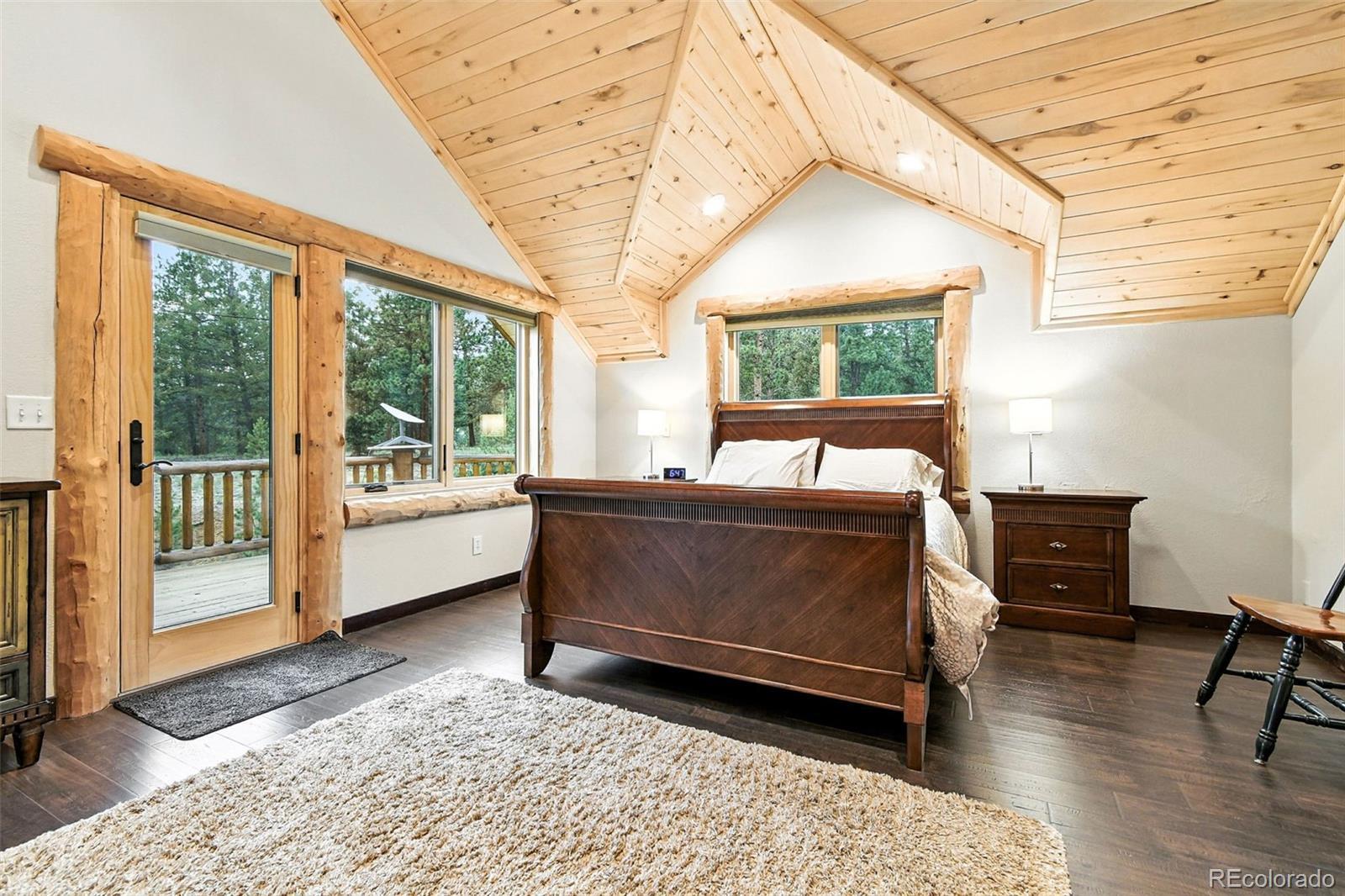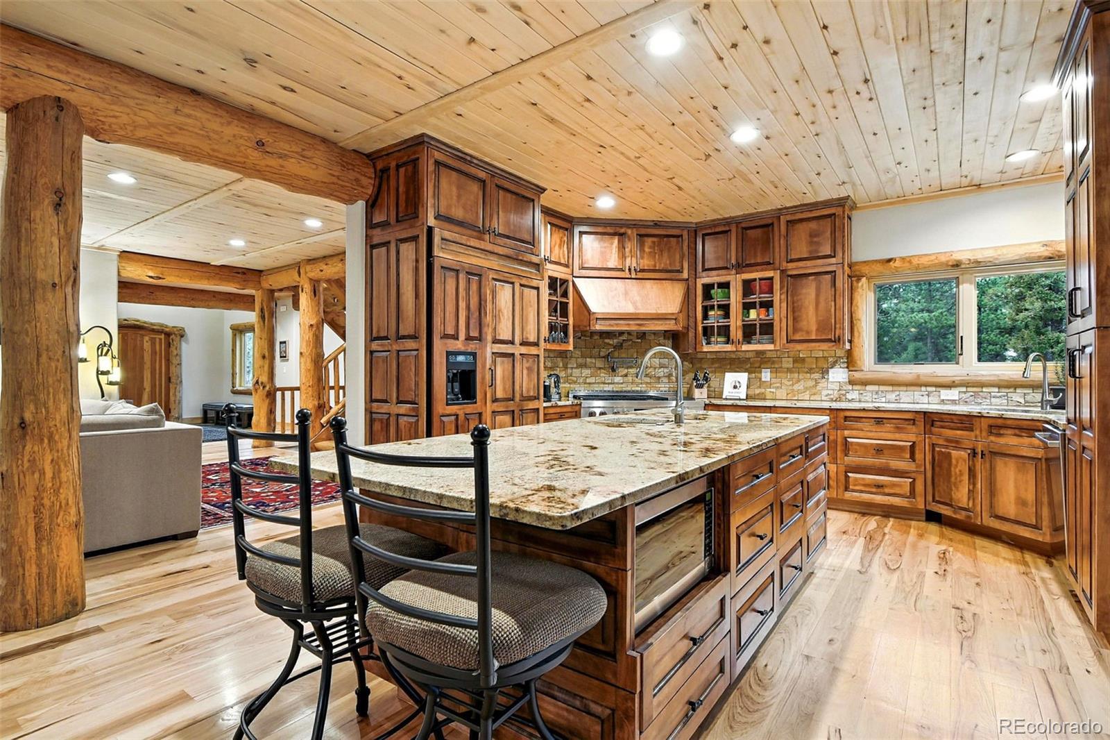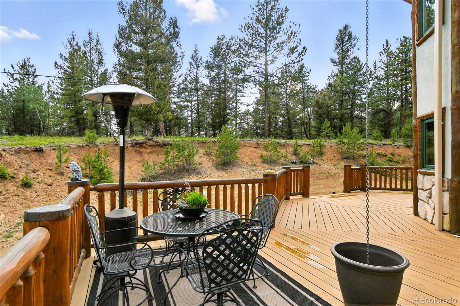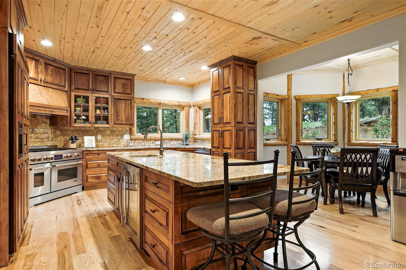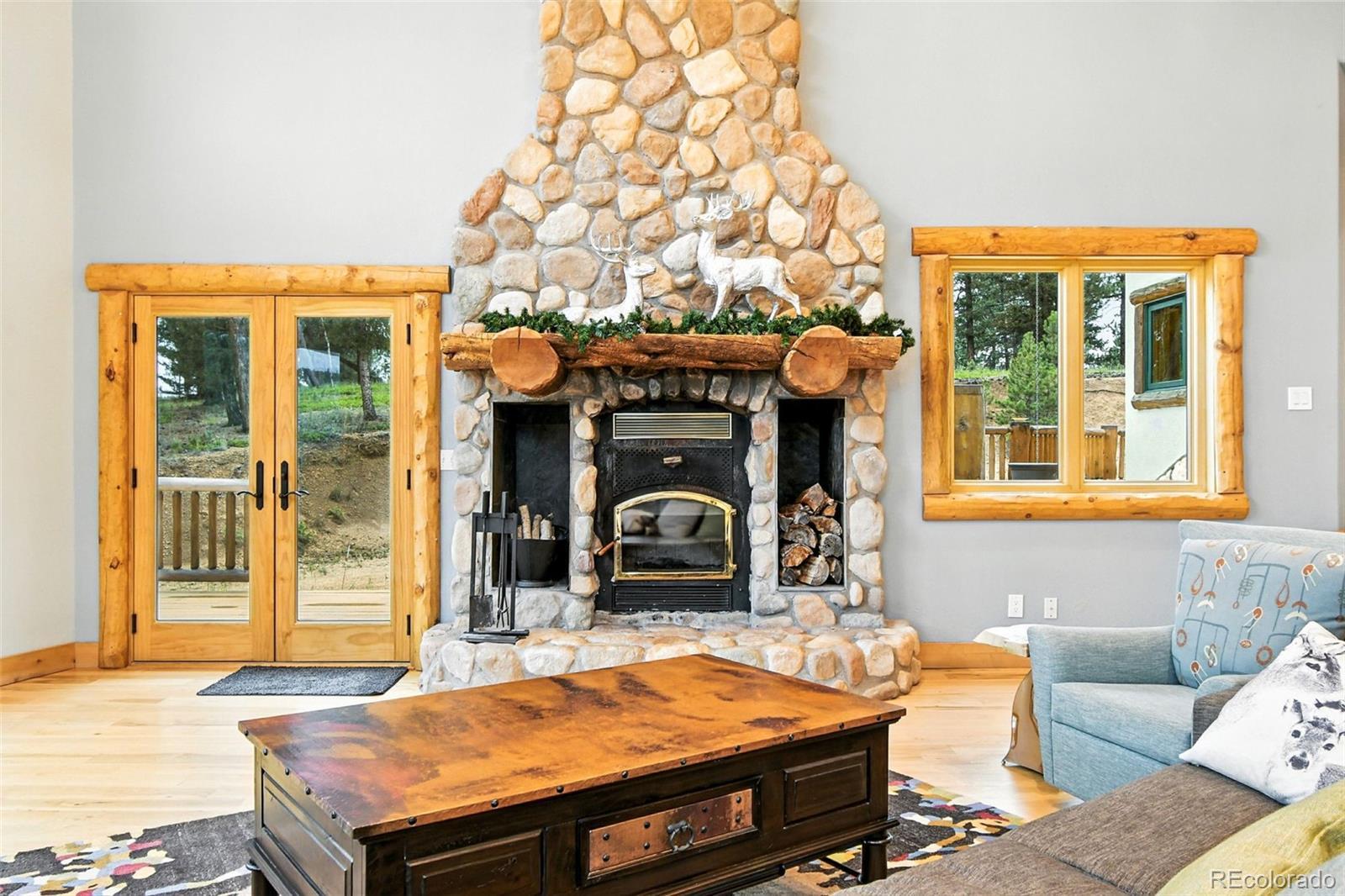 Live the Colorado dream in this stunning mountain retreat featuring rich log accents, custom wood trim, and a wall of windows that fills the vaulted living room with natural light. Cozy up by the moss rock fireplace or cook in the well-appointed kitchen with birch cabinets and granite countertops. Hickory floors, slate tile, and in-floor radiant heat add warmth and style. The spacious primary suite offers a luxurious five-piece bath with custom lead glass windows that offer a spectrum of colors to fill your soaking tub and a private 2,400 sf redwood deck for serene mountain views. This is a treed lot that was home to a horse family in the past and has the old stable to refinish or make into a diva den or sweat box sauna. The lower level has plenty of storage, a home gym, and space for a home theatre.