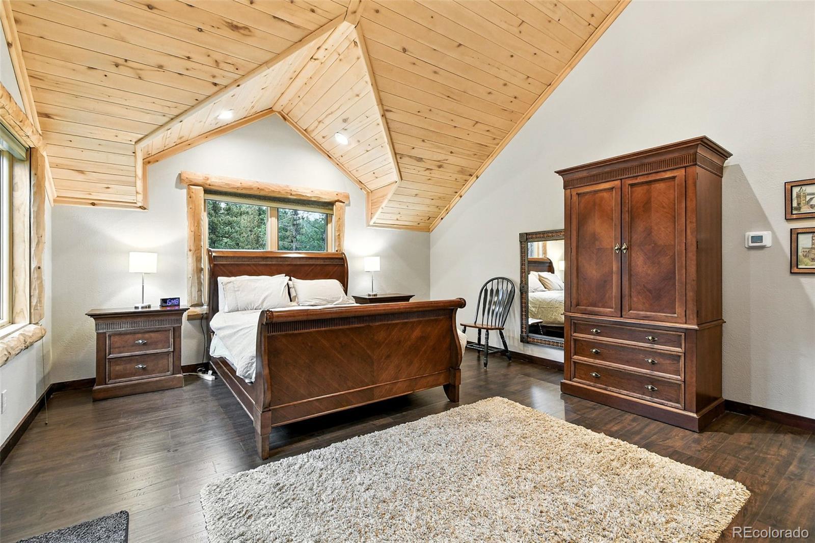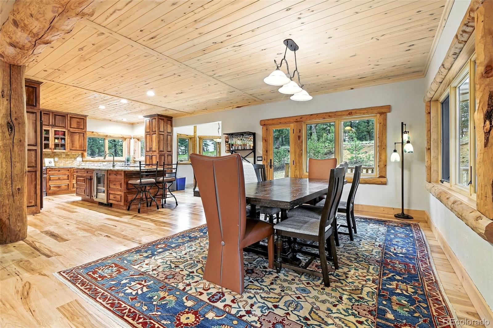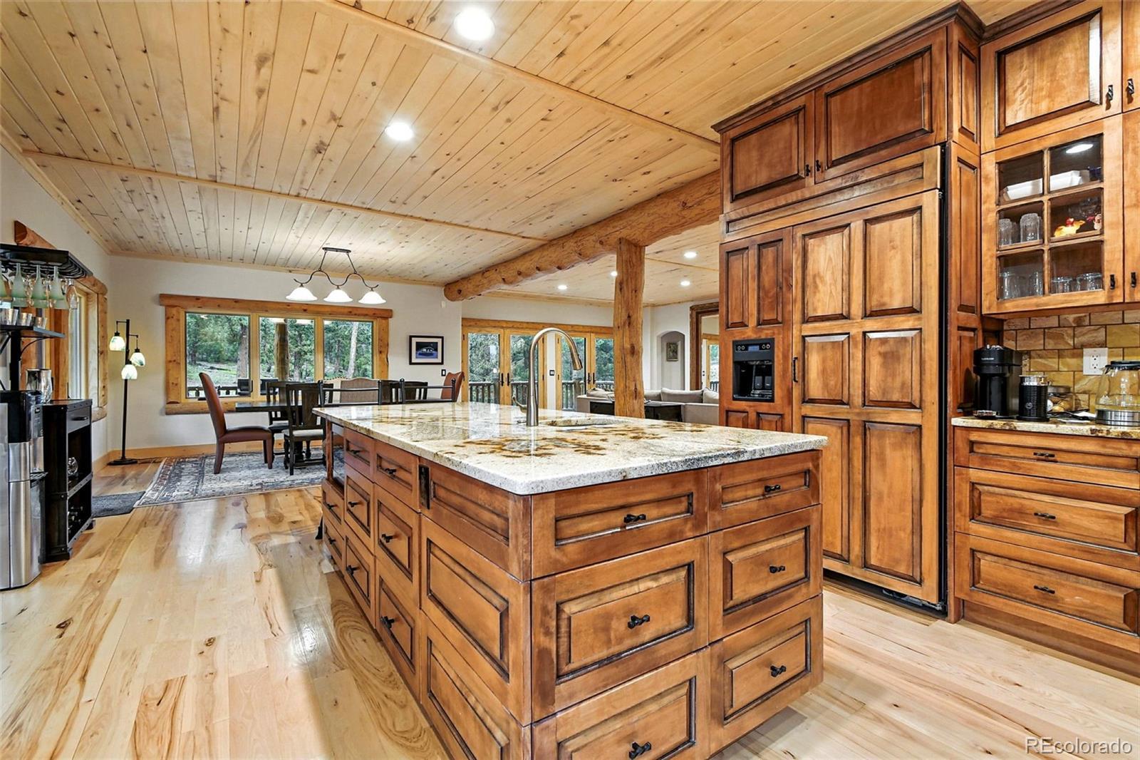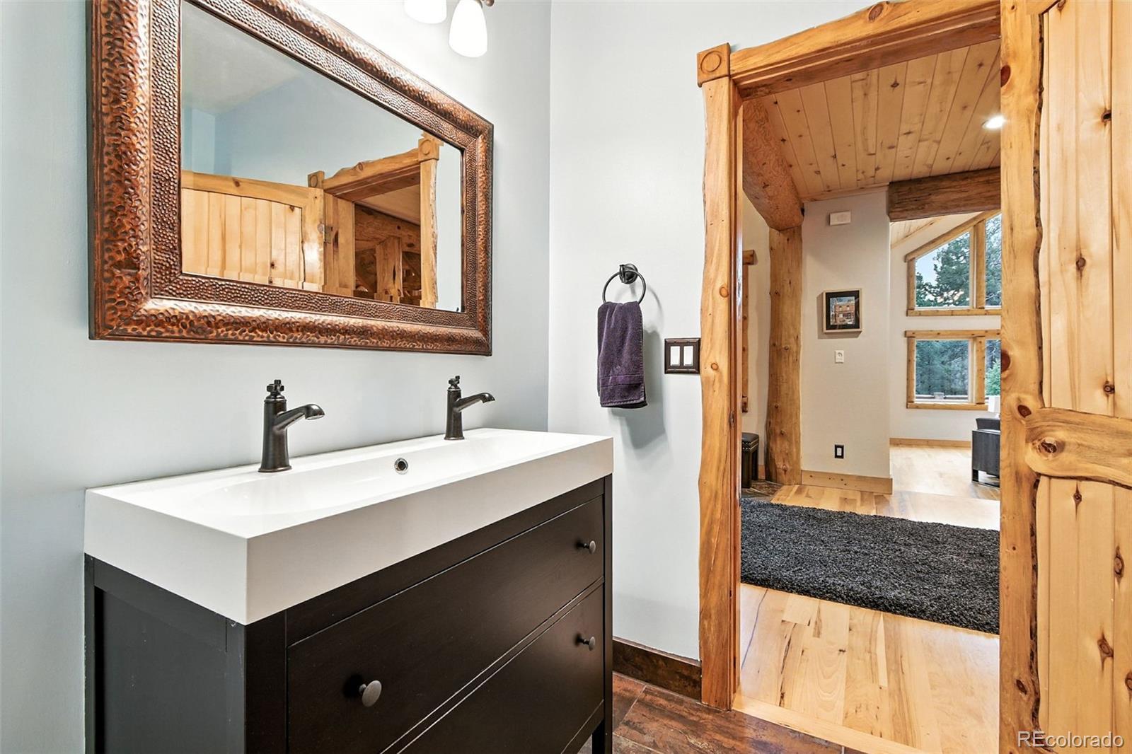 Live the Colorado dream in this stunning mountain retreat featuring rich log accents, custom wood trim, and a wall of windows that fills the vaulted living room with natural light. Cozy up by the moss rock fireplace or cook in the well-appointed kitchen with birch cabinets and granite countertops. Hickory floors, slate tile, and in-floor radiant heat add warmth and style. The spacious primary suite offers a luxurious five-piece bath with custom lead glass windows that offer a spectrum of colors to fill your soaking tub and a private 2,400 sf redwood deck for serene mountain views. This is a treed lot that was home to a horse family in the past and has the old stable to refinish or make into a diva den or sweat box sauna. The lower level has plenty of storage, a home gym, and space for a home theatre.