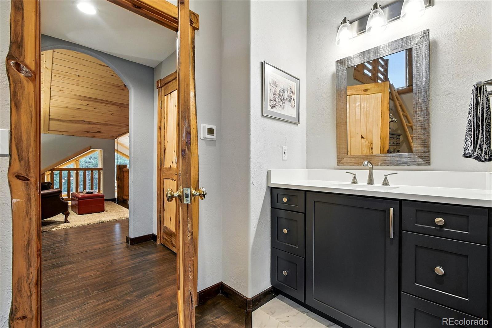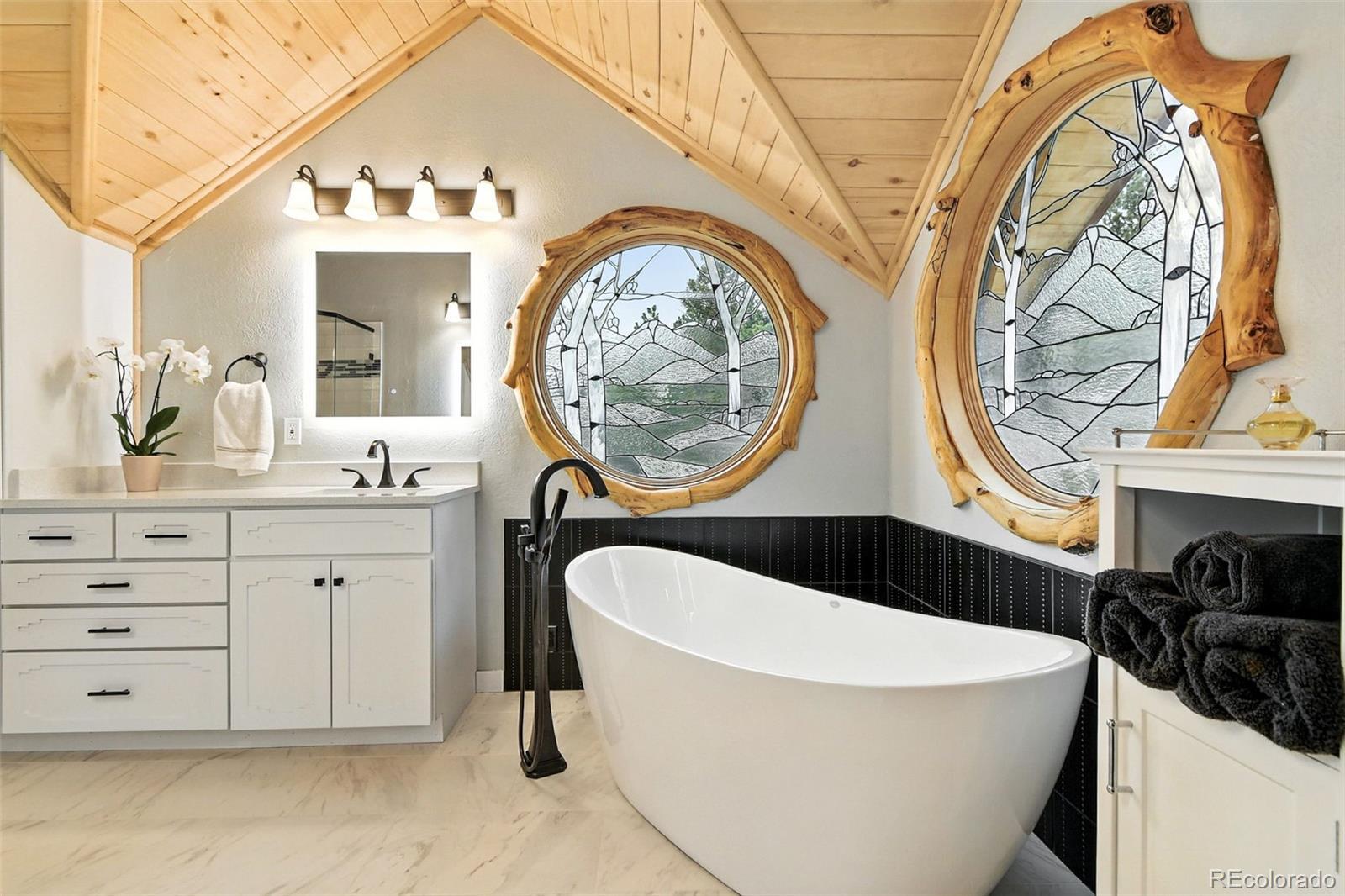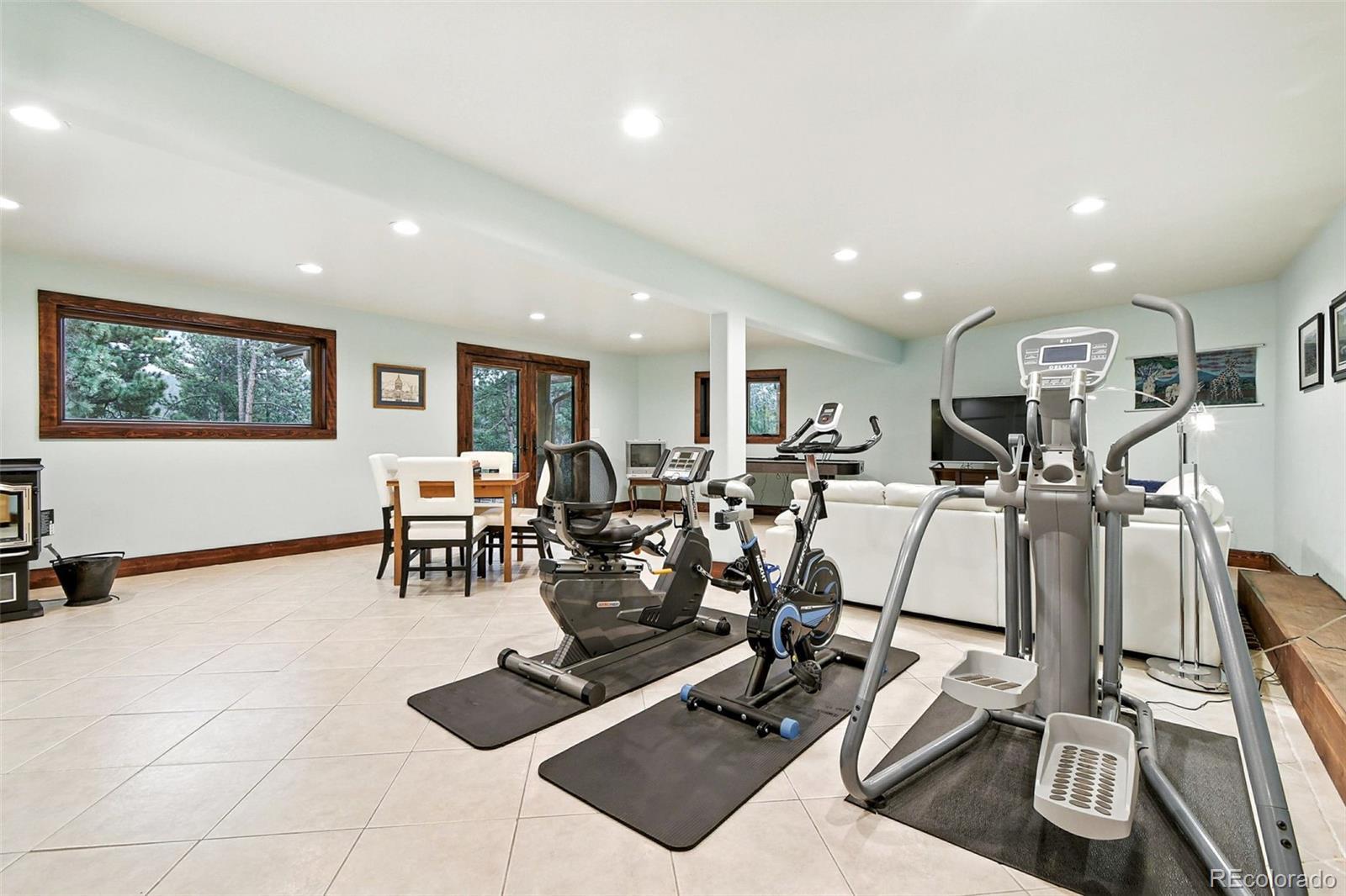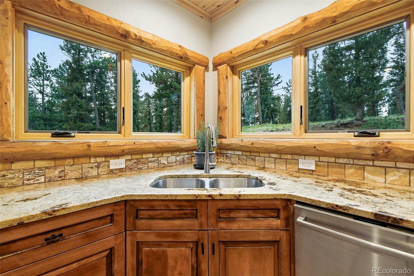 Live the Colorado dream in this stunning mountain retreat featuring rich log accents, custom wood trim, and a wall of windows that fills the vaulted living room with natural light. Cozy up by the moss rock fireplace or cook in the well-appointed kitchen with birch cabinets and granite countertops. Hickory floors, slate tile, and in-floor radiant heat add warmth and style. The spacious primary suite offers a luxurious five-piece bath with custom lead glass windows that offer a spectrum of colors to fill your soaking tub and a private 2,400 sf redwood deck for serene mountain views. This is a treed lot that was home to a horse family in the past and has the old stable to refinish or make into a diva den or sweat box sauna. The lower level has plenty of storage, a home gym, and space for a home theatre.