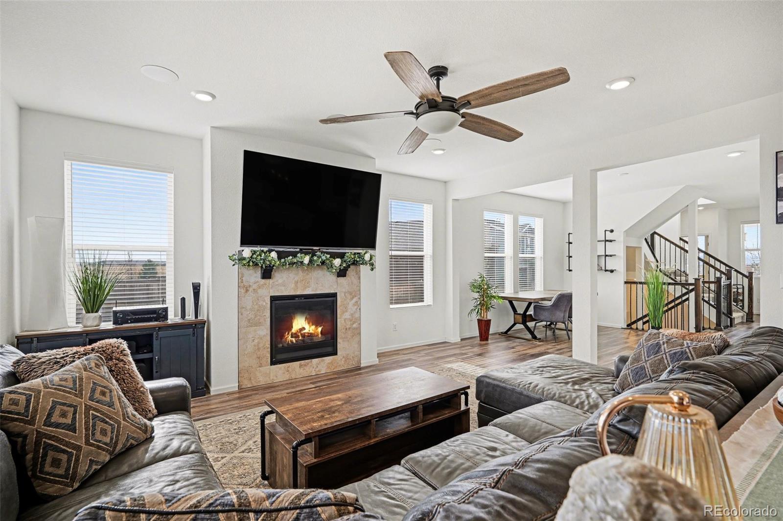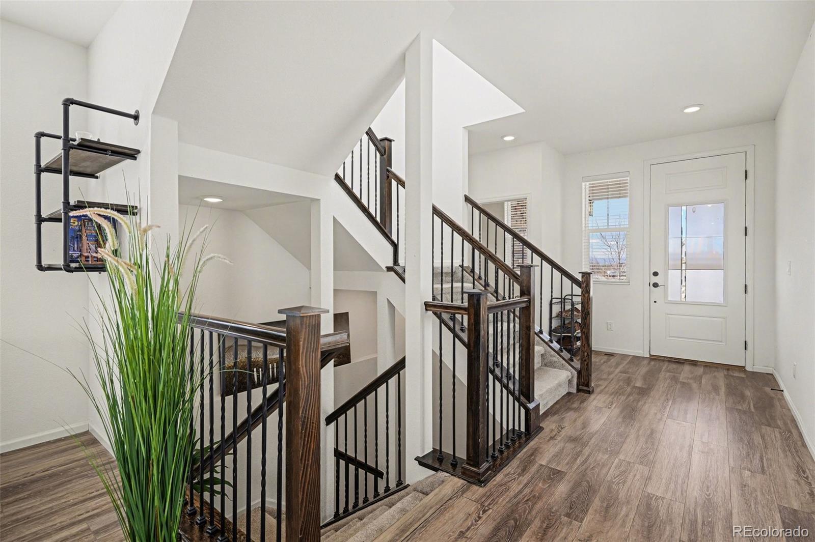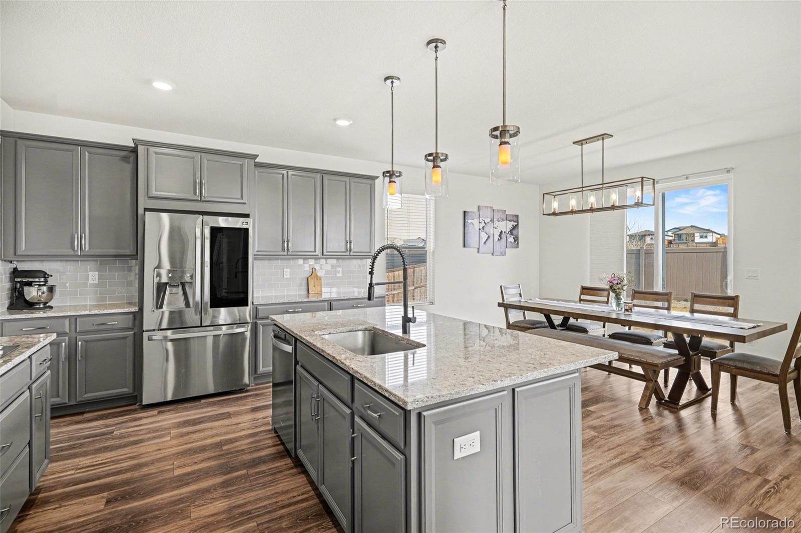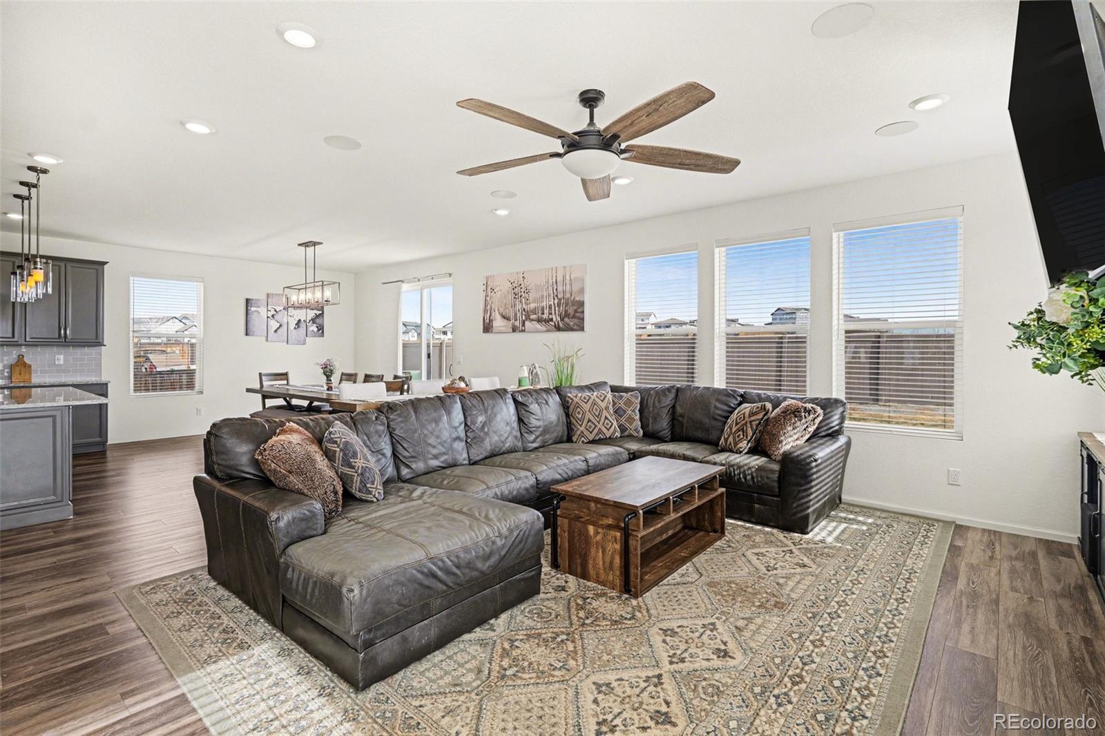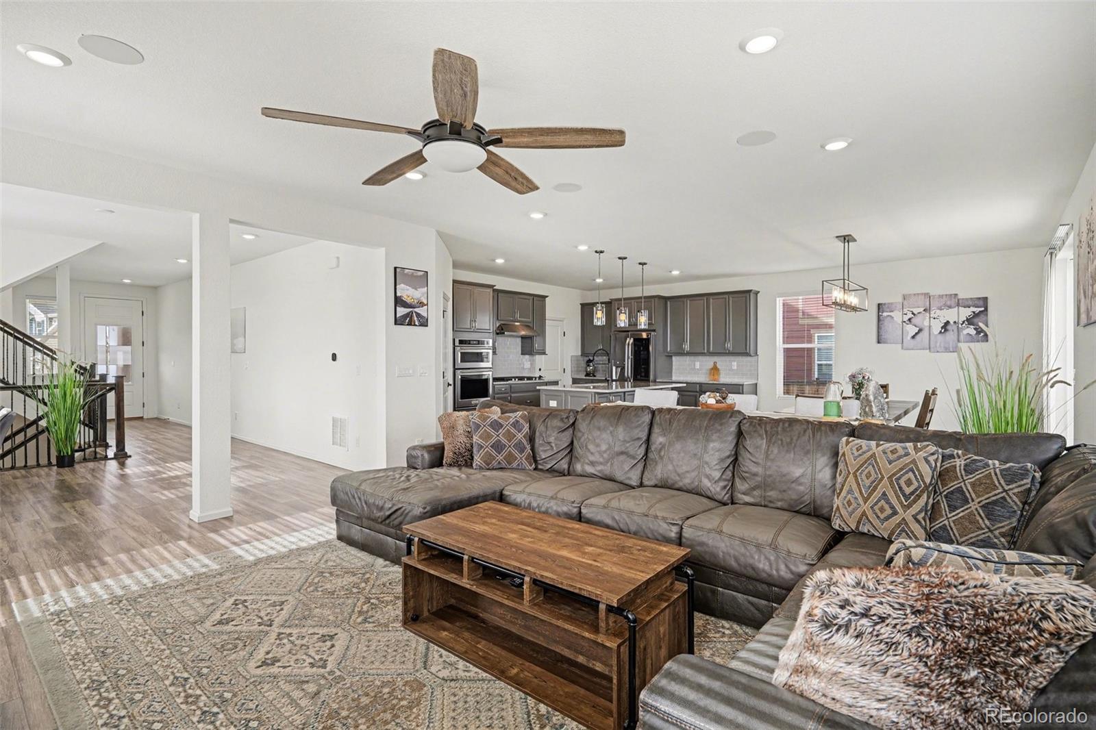 Sky Ranch 2 Story w/ Finish Basement on .24 Acre Lot! Sellers have a VA Assumable 2.875% Interest Rate. Kitchen Features 42" Shaker Cabinetry, Gourmet Stainless Steel Appliances w/ Gas Cook Top. Modern Pendant Lighting, Granite Slab Counters & Island w/ Seating. Extremely Open Floor Plan w/ LVP Flooring on the Main Floor, Main Floor Office, 4 Bedrooms Upstairs w/ Large Primary Suite & Additional Ensuite Bathroom in Secondary Bedroom. Large Rec Room in Finished Basement w/ Additional Bedroom and Full Bathroom. Jellyfish Permanent Outdoor Smart Lighting. Monthly Energy Savings w/ Solar. Close to Buckley Space Force Base, Shopping and Dining, APS Harmony Ridge P-8 School, Adonea Community Pool and Park, plus Backs to Open Space and First Creek.