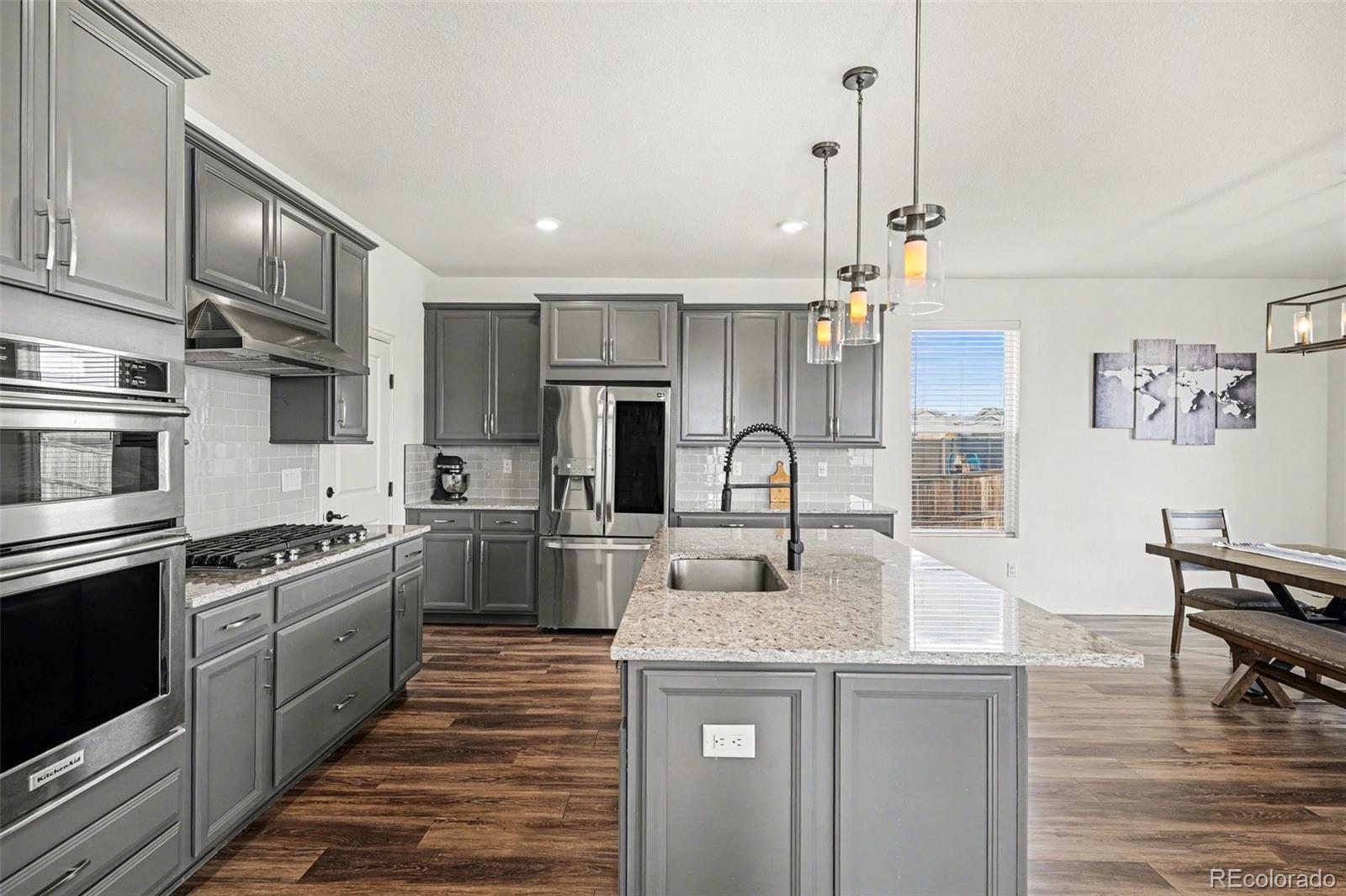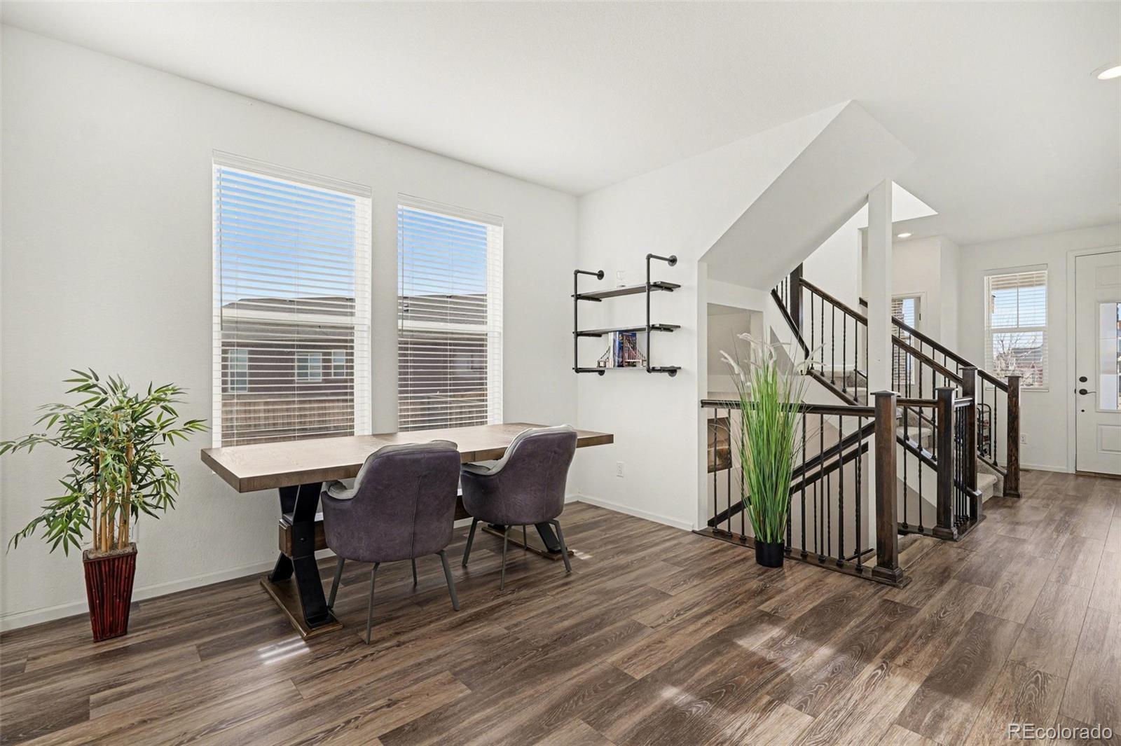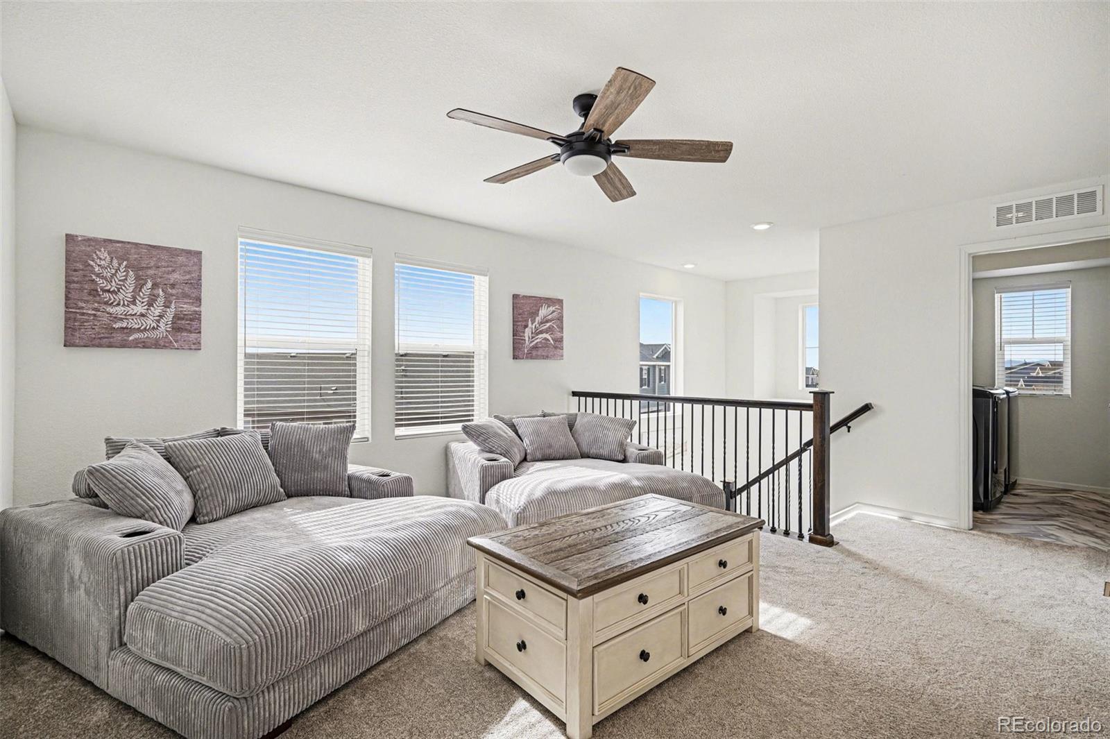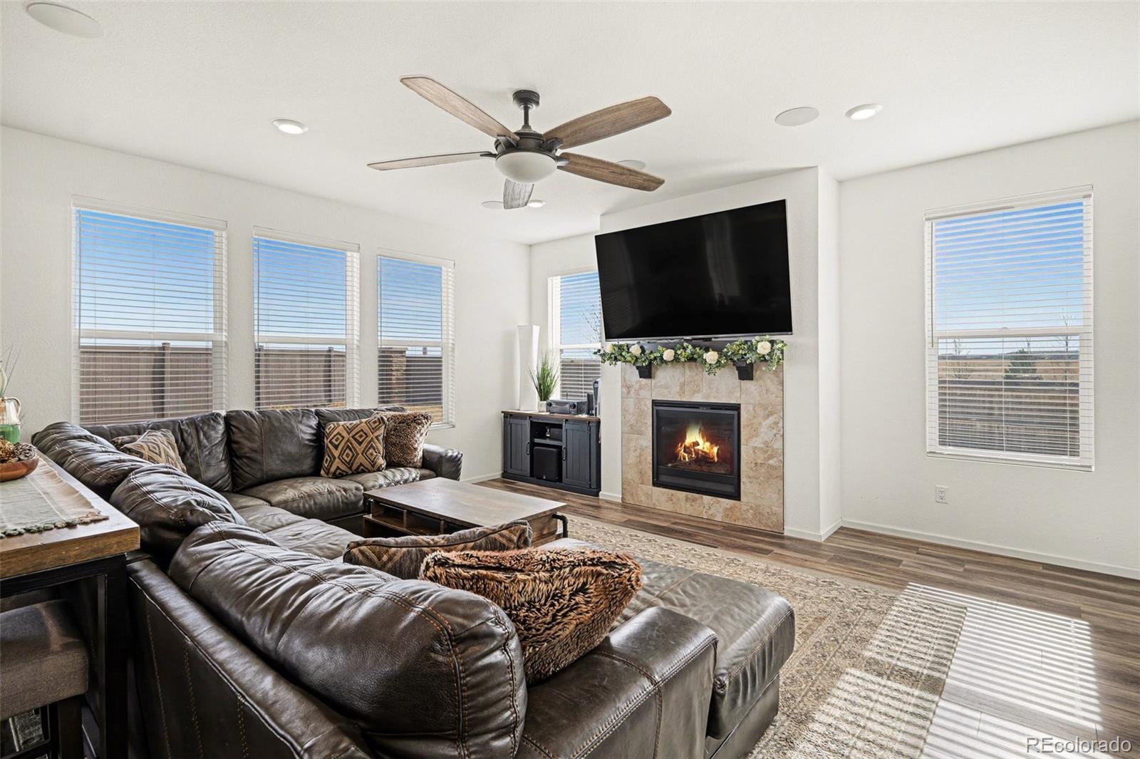 Sky Ranch 2 Story w/ Finish Basement on .24 Acre Lot! Sellers have a VA Assumable 2.875% Interest Rate. Kitchen Features 42" Shaker Cabinetry, Gourmet Stainless Steel Appliances w/ Gas Cook Top. Modern Pendant Lighting, Granite Slab Counters & Island w/ Seating. Extremely Open Floor Plan w/ LVP Flooring on the Main Floor, Main Floor Office, 4 Bedrooms Upstairs w/ Large Primary Suite & Additional Ensuite Bathroom in Secondary Bedroom. Large Rec Room in Finished Basement w/ Additional Bedroom and Full Bathroom. Jellyfish Permanent Outdoor Smart Lighting. Monthly Energy Savings w/ Solar. Close to Buckley Space Force Base, Shopping and Dining, APS Harmony Ridge P-8 School, Adonea Community Pool and Park, plus Backs to Open Space and First Creek.