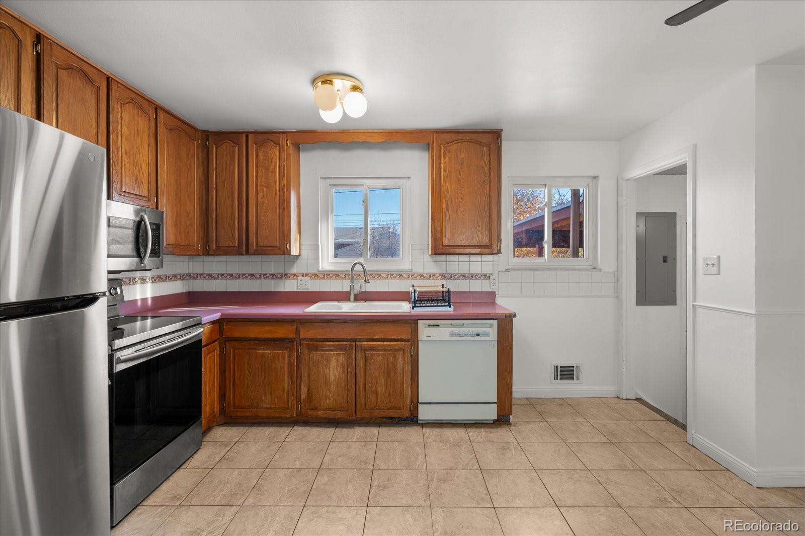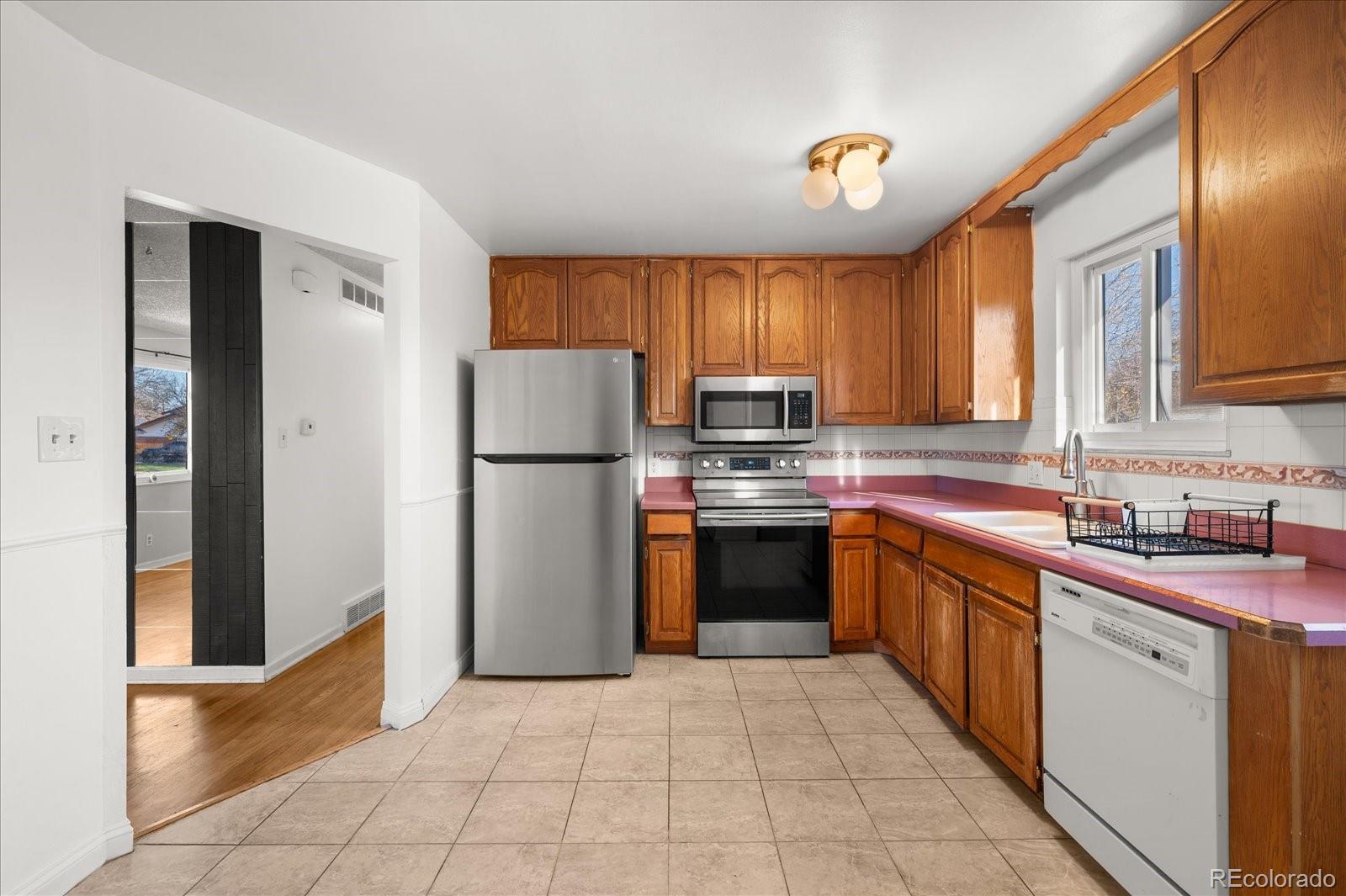 Fantastic first-time buyer opportunity in Northglenn! This updated brick ranch features fresh main-level paint, an oversized 1-car garage, and an upgraded kitchen with 42" cabinets, stainless appliances (all <1 year old), and a new sink/faucet. Main floor offers 3 bedrooms with a Jack-and-Jill bath to the primary, plus a new furnace for worry-free living. Enjoy a spacious backyard with a covered deck, storage shed, garden area, and grape vines. Major upgrades include a new sewer line and updated electrical throughout. Fantastic location—1 mile from the N Line 112th Station, steps from E.B. Rains Jr. Park/Webster Lake, close to the Northglenn Rec Center, near Boondocks Food & Fun, minutes to Croke Reservoir, and surrounded by great local dining and community amenities. Easy access to highways to Denver, Boulder, Longmont, and Fort Collins.