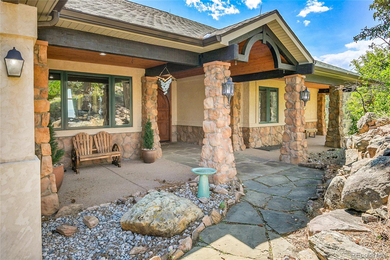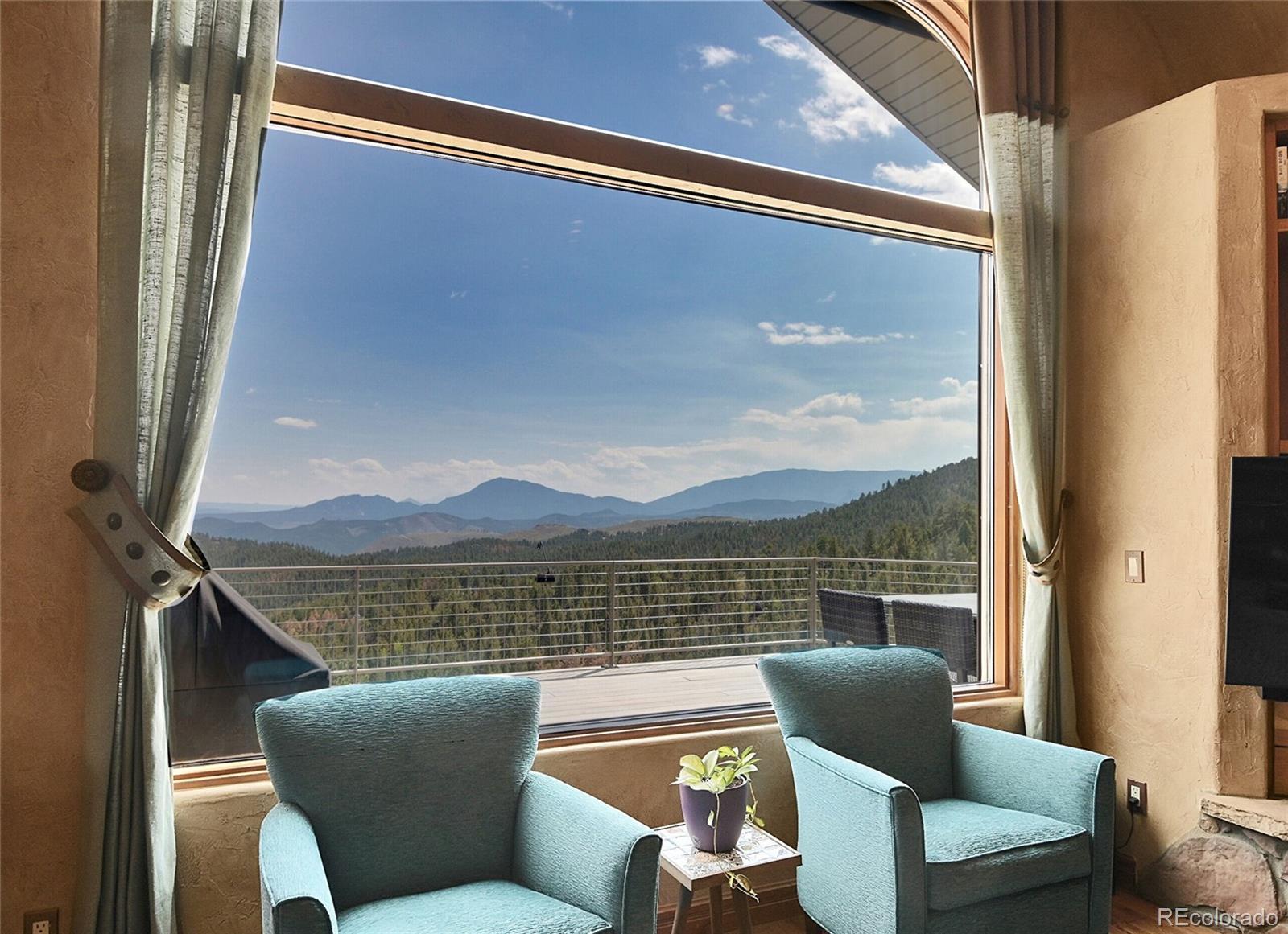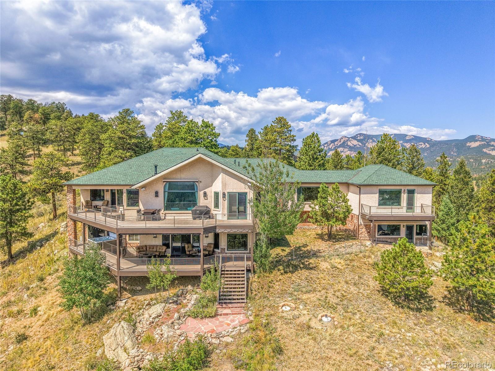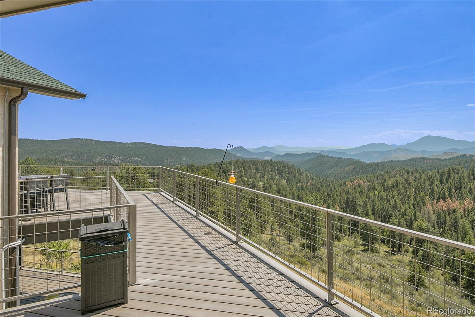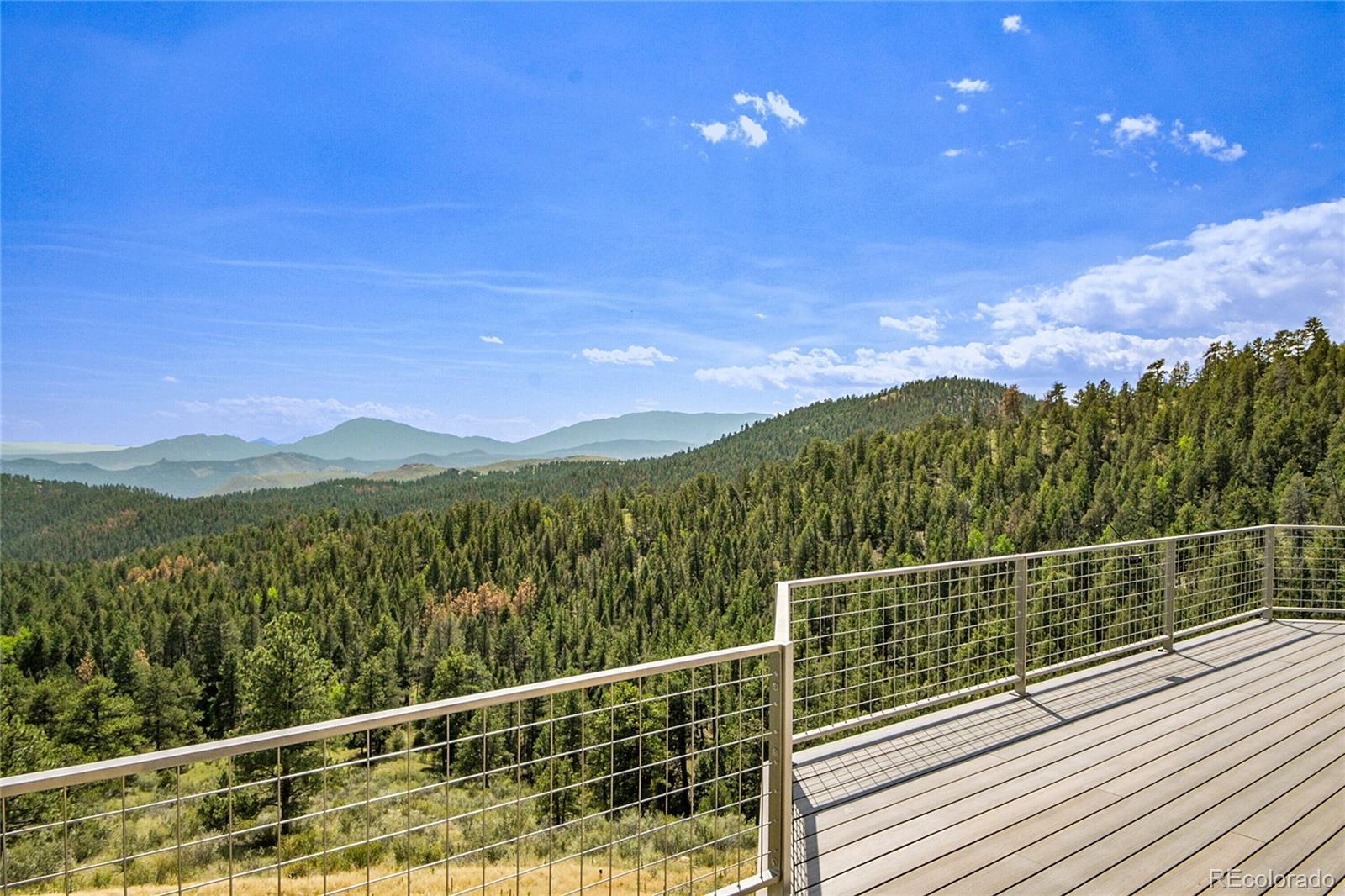 Mountain luxury and elegance with million-dollar views, main-floor living, and an attached In-Law apartment with a separate entrance—all within an hour of DIA and just 90 minutes to world-class skiing in Breckenridge, without the hassle of I-70 traffic. Situated on five beautifully mitigated acres backing to open space, this custom home in Douglass Ranch offers both tranquility and an easy commute to Denver or DTC. Enter through the stunning custom double doors and be captivated by the dramatic Pikes Peak views framed by the great room’s expansive windows. Designed by an artist, this home features warm hickory floors, a barrel-vaulted ceiling, and a striking ski-lift cable stair rail, with thoughtful details ensuring breathtaking views from nearly every room. The chef’s kitchen boasts a 6-burner Dacor gas cooktop, KitchenAid appliances, a new double convection oven and dishwasher, and a butler’s pantry with a built-in wine rack. The dining area opens onto 2,500 sq ft of Trex decking, perfect for entertaining or watching the elk migration. The main-floor primary suite is a luxurious retreat with a sitting room, spa-like five-piece bath, and a new custom walk-in closet. At the opposite end, the 800-sq-ft ADA-compliant apartment/guest quarters offers a full kitchen, living room, private deck, large bedroom, and ¾ bath, with a separate entrance providing privacy for multi-generational living. The lower level features a media room with a wet bar, blackout window coverings, a soundproof gym, and $24K in Smart Tech and AV, all controlled from your phone. Hardwired internet runs throughout, with redundancy for reliability. This level also includes a second guest apartment, and three en-suite bedrooms. Enjoy the indoor sauna, then step outside to the six-seat spa. The lower deck is DriDeck-covered for year-round use. Recent upgrades include a new Class 4 roof and gutters, ensuring durability and peace of mind.