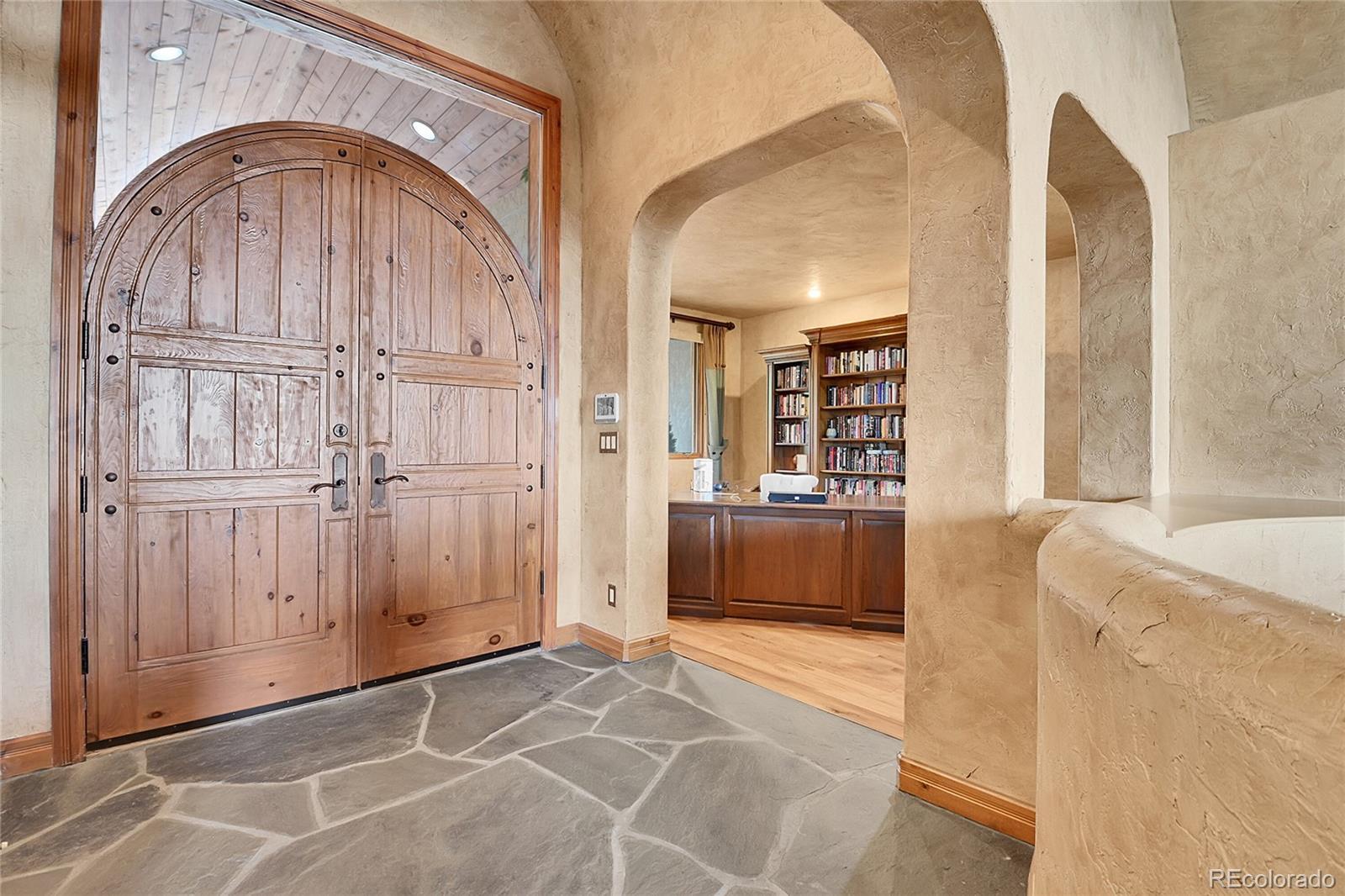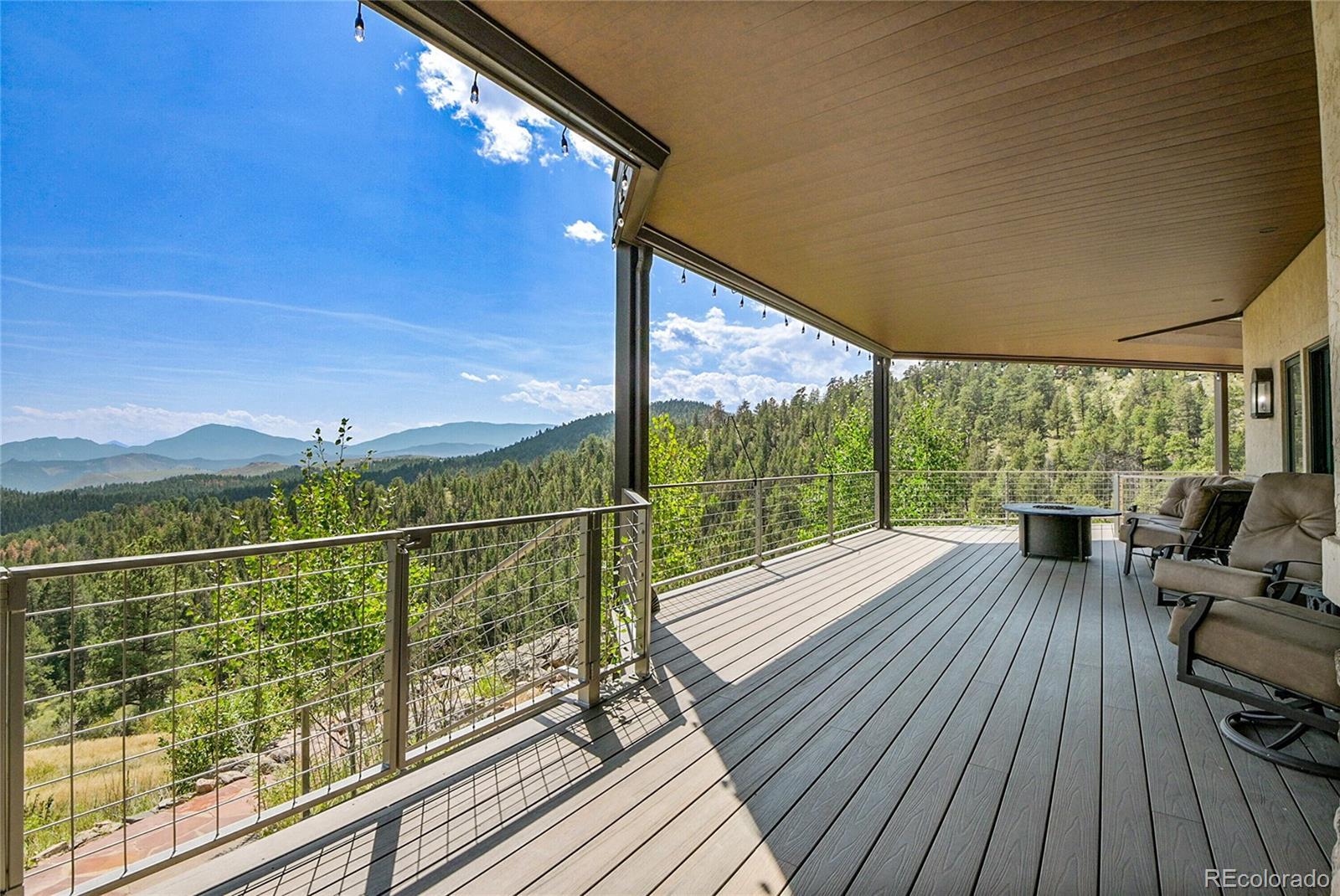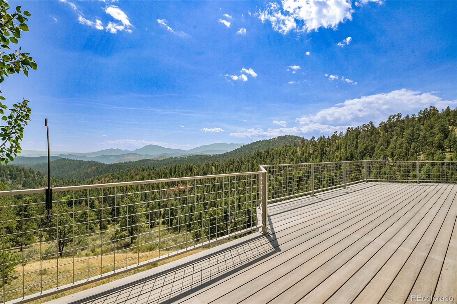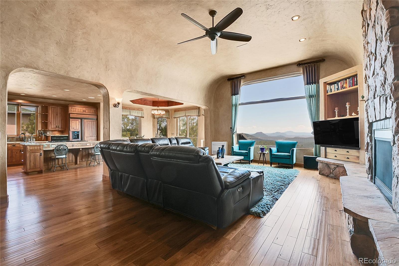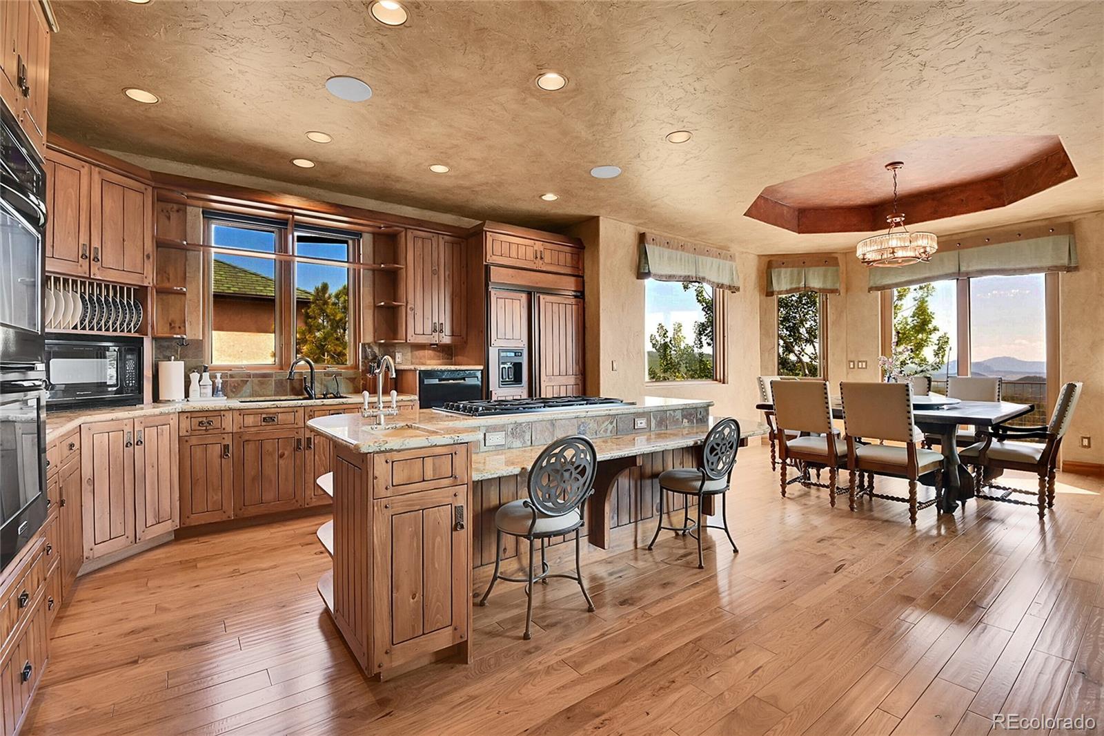 Mountain luxury and elegance with million-dollar views, main-floor living, and an attached In-Law apartment with a separate entrance—all within an hour of DIA and just 90 minutes to world-class skiing in Breckenridge, without the hassle of I-70 traffic. Situated on five beautifully mitigated acres backing to open space, this custom home in Douglass Ranch offers both tranquility and an easy commute to Denver or DTC. Enter through the stunning custom double doors and be captivated by the dramatic Pikes Peak views framed by the great room’s expansive windows. Designed by an artist, this home features warm hickory floors, a barrel-vaulted ceiling, and a striking ski-lift cable stair rail, with thoughtful details ensuring breathtaking views from nearly every room. The chef’s kitchen boasts a 6-burner Dacor gas cooktop, KitchenAid appliances, a new double convection oven and dishwasher, and a butler’s pantry with a built-in wine rack. The dining area opens onto 2,500 sq ft of Trex decking, perfect for entertaining or watching the elk migration. The main-floor primary suite is a luxurious retreat with a sitting room, spa-like five-piece bath, and a new custom walk-in closet. At the opposite end, the 800-sq-ft ADA-compliant apartment/guest quarters offers a full kitchen, living room, private deck, large bedroom, and ¾ bath, with a separate entrance providing privacy for multi-generational living. The lower level features a media room with a wet bar, blackout window coverings, a soundproof gym, and $24K in Smart Tech and AV, all controlled from your phone. Hardwired internet runs throughout, with redundancy for reliability. This level also includes a second guest apartment, and three en-suite bedrooms. Enjoy the indoor sauna, then step outside to the six-seat spa. The lower deck is DriDeck-covered for year-round use. Recent upgrades include a new Class 4 roof and gutters, ensuring durability and peace of mind.