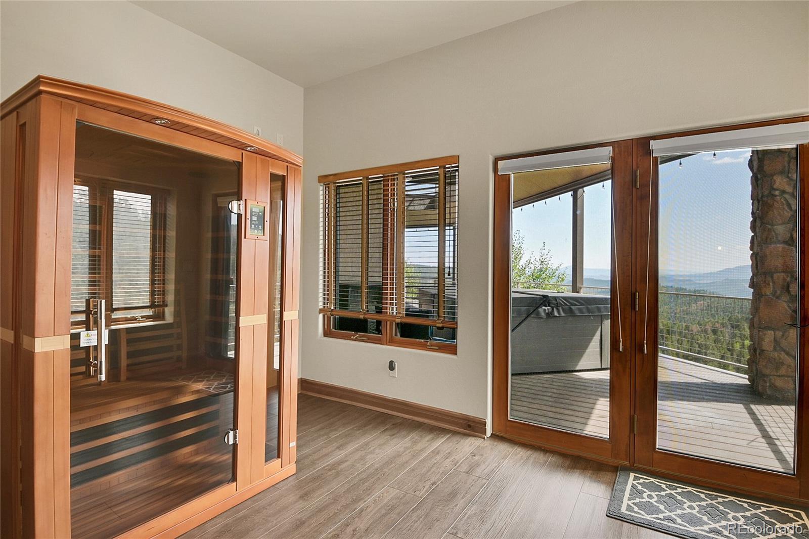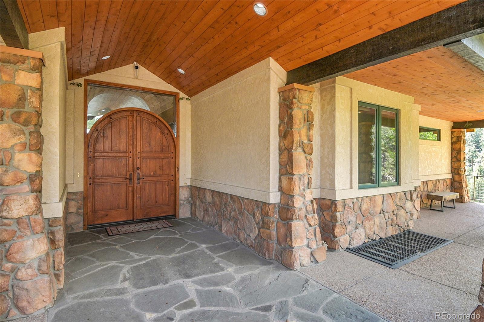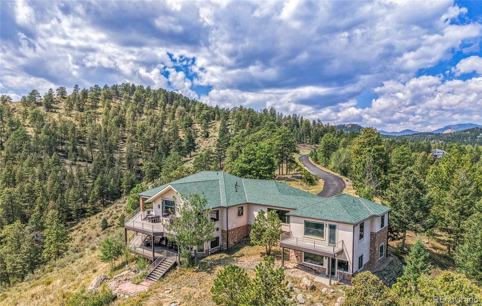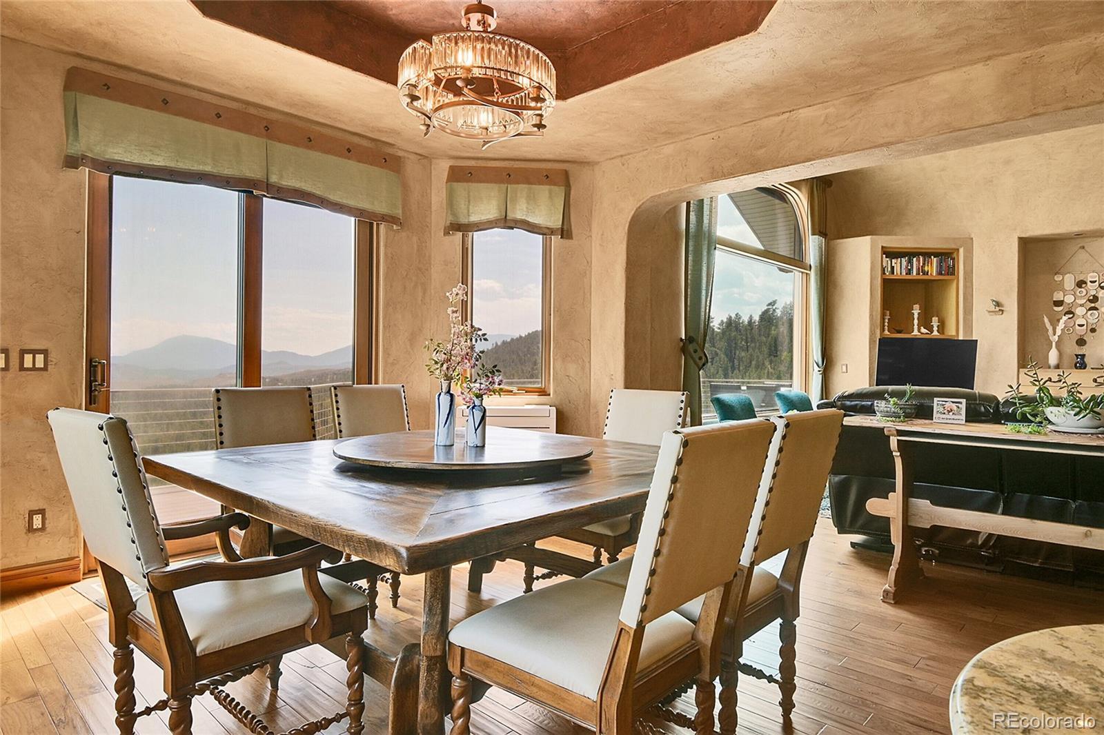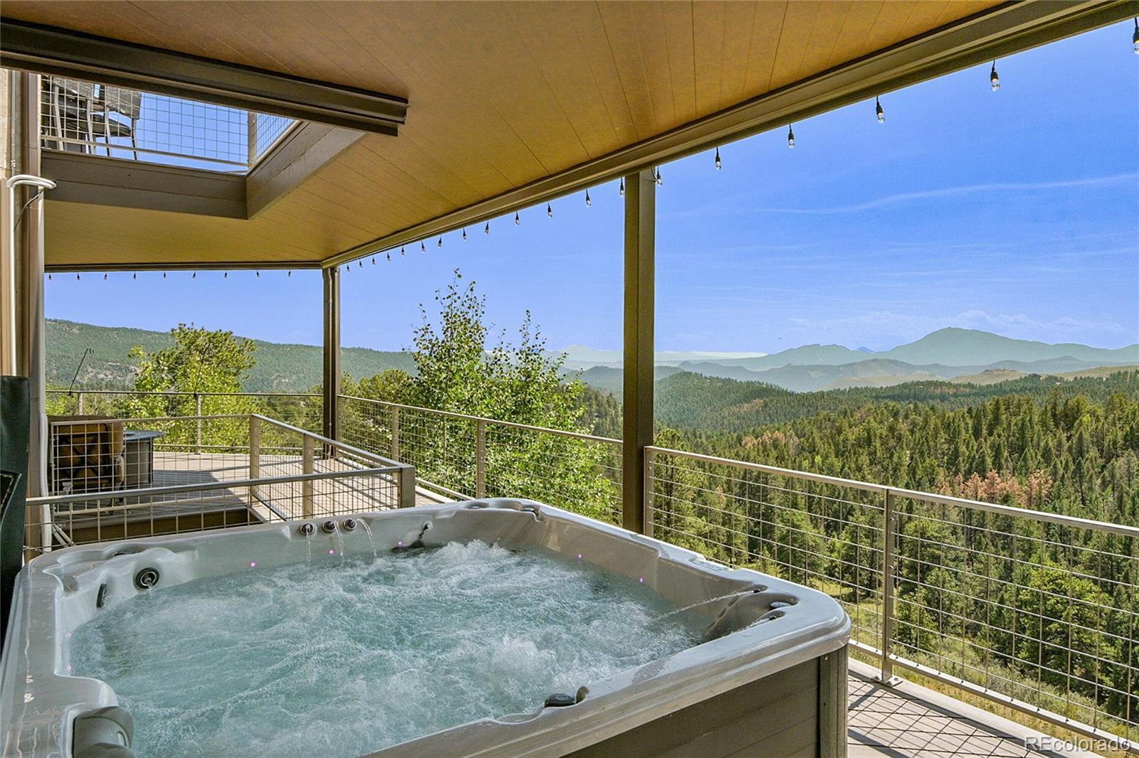 Mountain luxury and elegance with million-dollar views, main-floor living, and an attached In-Law apartment with a separate entrance—all within an hour of DIA and just 90 minutes to world-class skiing in Breckenridge, without the hassle of I-70 traffic. Situated on five beautifully mitigated acres backing to open space, this custom home in Douglass Ranch offers both tranquility and an easy commute to Denver or DTC. Enter through the stunning custom double doors and be captivated by the dramatic Pikes Peak views framed by the great room’s expansive windows. Designed by an artist, this home features warm hickory floors, a barrel-vaulted ceiling, and a striking ski-lift cable stair rail, with thoughtful details ensuring breathtaking views from nearly every room. The chef’s kitchen boasts a 6-burner Dacor gas cooktop, KitchenAid appliances, a new double convection oven and dishwasher, and a butler’s pantry with a built-in wine rack. The dining area opens onto 2,500 sq ft of Trex decking, perfect for entertaining or watching the elk migration. The main-floor primary suite is a luxurious retreat with a sitting room, spa-like five-piece bath, and a new custom walk-in closet. At the opposite end, the 800-sq-ft ADA-compliant apartment/guest quarters offers a full kitchen, living room, private deck, large bedroom, and ¾ bath, with a separate entrance providing privacy for multi-generational living. The lower level features a media room with a wet bar, blackout window coverings, a soundproof gym, and $24K in Smart Tech and AV, all controlled from your phone. Hardwired internet runs throughout, with redundancy for reliability. This level also includes a second guest apartment, and three en-suite bedrooms. Enjoy the indoor sauna, then step outside to the six-seat spa. The lower deck is DriDeck-covered for year-round use. Recent upgrades include a new Class 4 roof and gutters, ensuring durability and peace of mind.