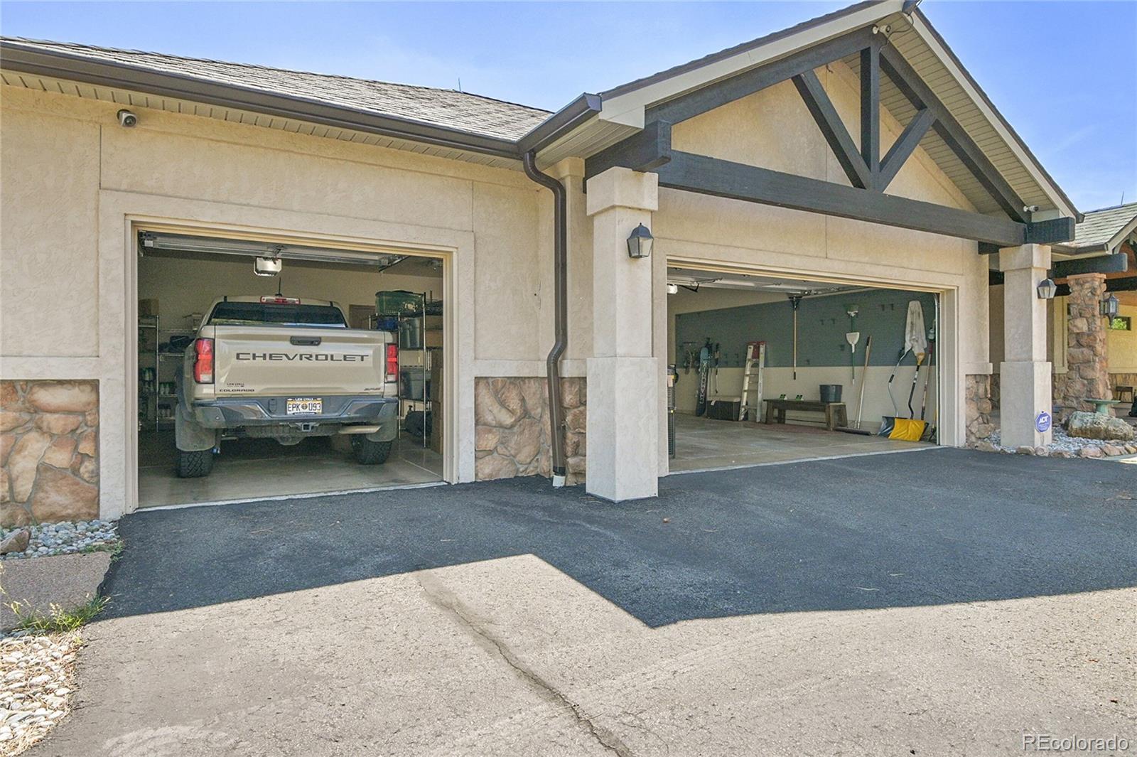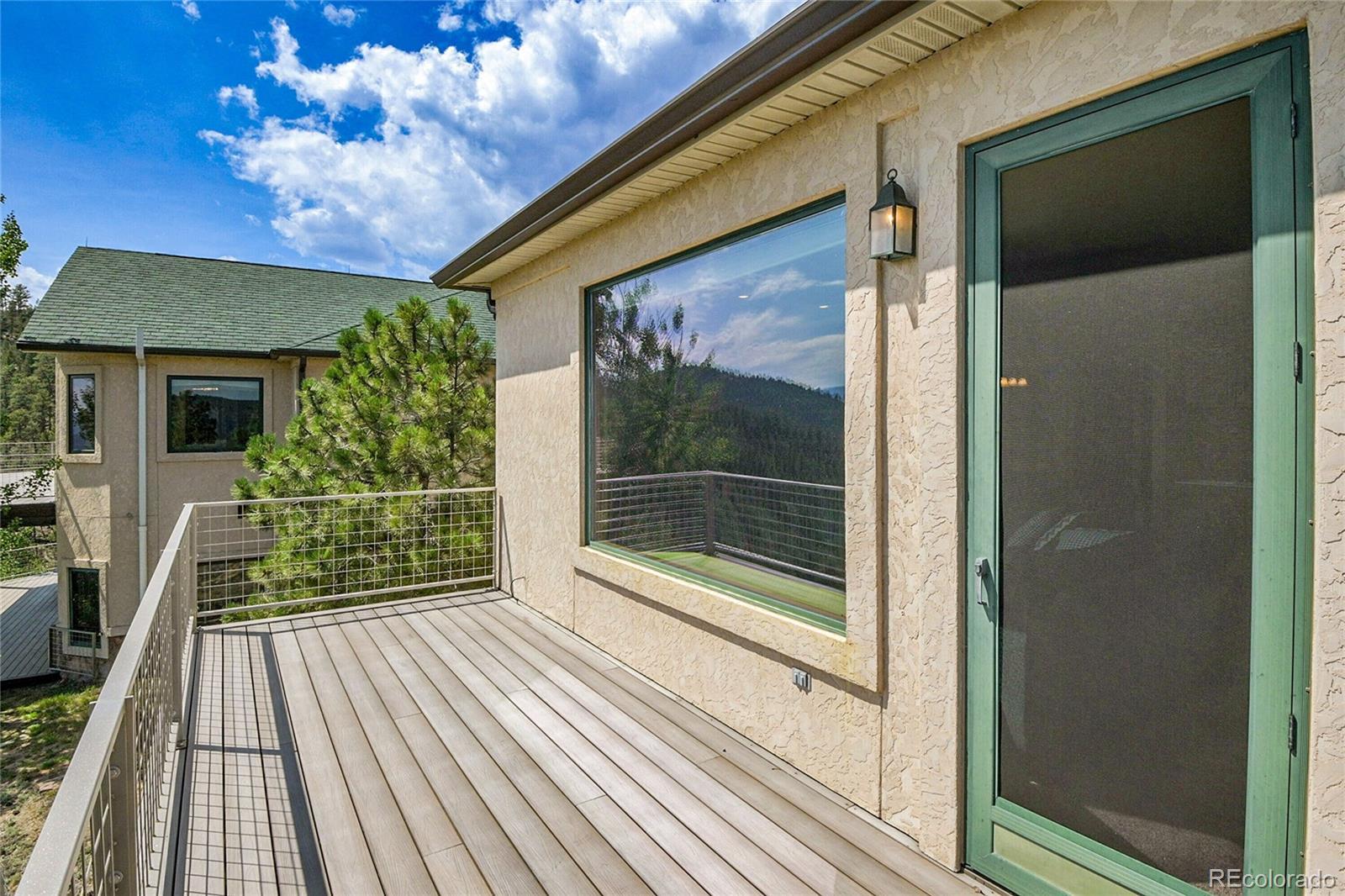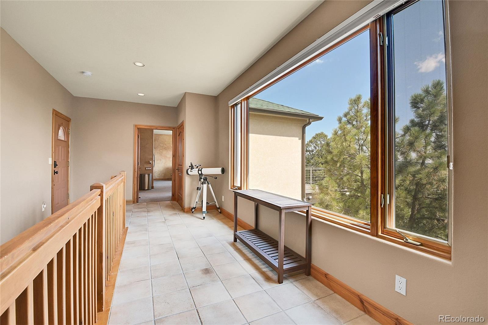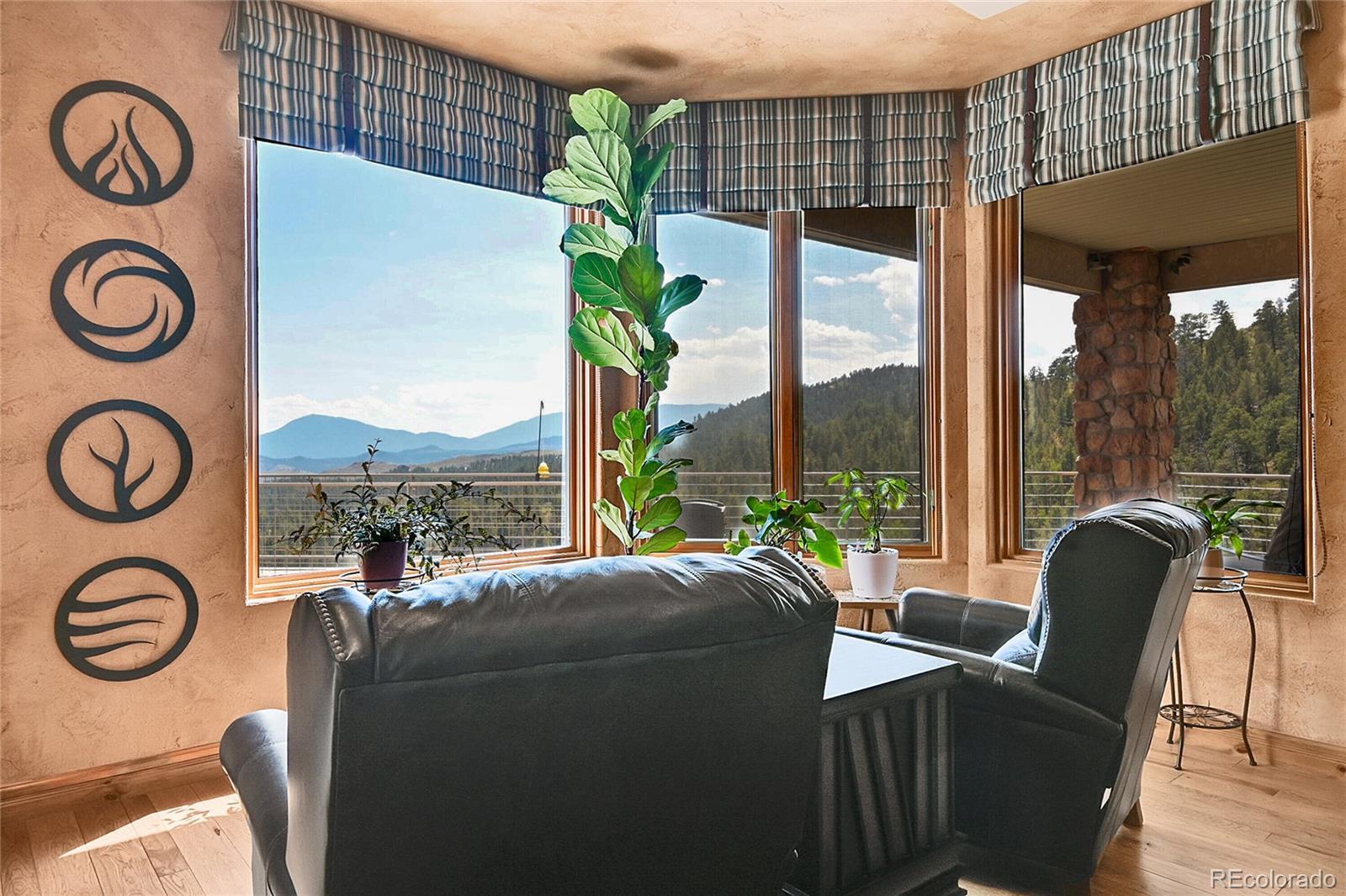 Mountain luxury and elegance with million-dollar views, main-floor living, and an attached In-Law apartment with a separate entrance—all within an hour of DIA and just 90 minutes to world-class skiing in Breckenridge, without the hassle of I-70 traffic. Situated on five beautifully mitigated acres backing to open space, this custom home in Douglass Ranch offers both tranquility and an easy commute to Denver or DTC. Enter through the stunning custom double doors and be captivated by the dramatic Pikes Peak views framed by the great room’s expansive windows. Designed by an artist, this home features warm hickory floors, a barrel-vaulted ceiling, and a striking ski-lift cable stair rail, with thoughtful details ensuring breathtaking views from nearly every room. The chef’s kitchen boasts a 6-burner Dacor gas cooktop, KitchenAid appliances, a new double convection oven and dishwasher, and a butler’s pantry with a built-in wine rack. The dining area opens onto 2,500 sq ft of Trex decking, perfect for entertaining or watching the elk migration. The main-floor primary suite is a luxurious retreat with a sitting room, spa-like five-piece bath, and a new custom walk-in closet. At the opposite end, the 800-sq-ft ADA-compliant apartment/guest quarters offers a full kitchen, living room, private deck, large bedroom, and ¾ bath, with a separate entrance providing privacy for multi-generational living. The lower level features a media room with a wet bar, blackout window coverings, a soundproof gym, and $24K in Smart Tech and AV, all controlled from your phone. Hardwired internet runs throughout, with redundancy for reliability. This level also includes a second guest apartment, and three en-suite bedrooms. Enjoy the indoor sauna, then step outside to the six-seat spa. The lower deck is DriDeck-covered for year-round use. Recent upgrades include a new Class 4 roof and gutters, ensuring durability and peace of mind.