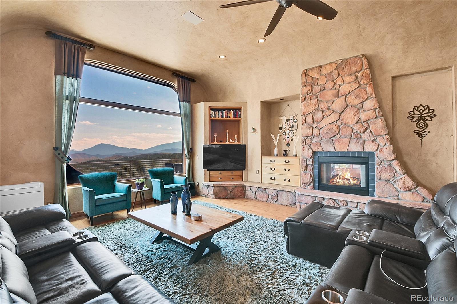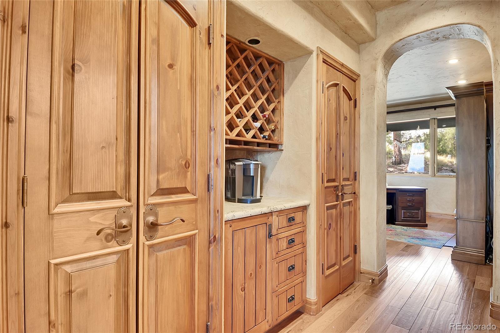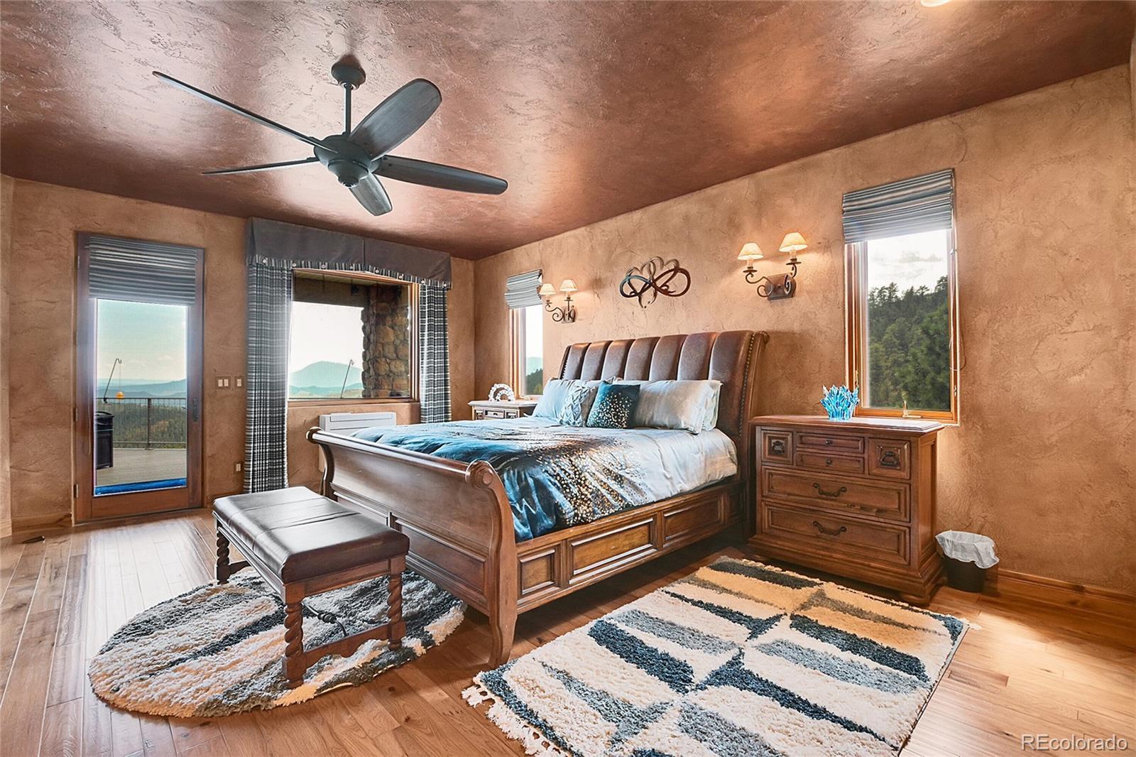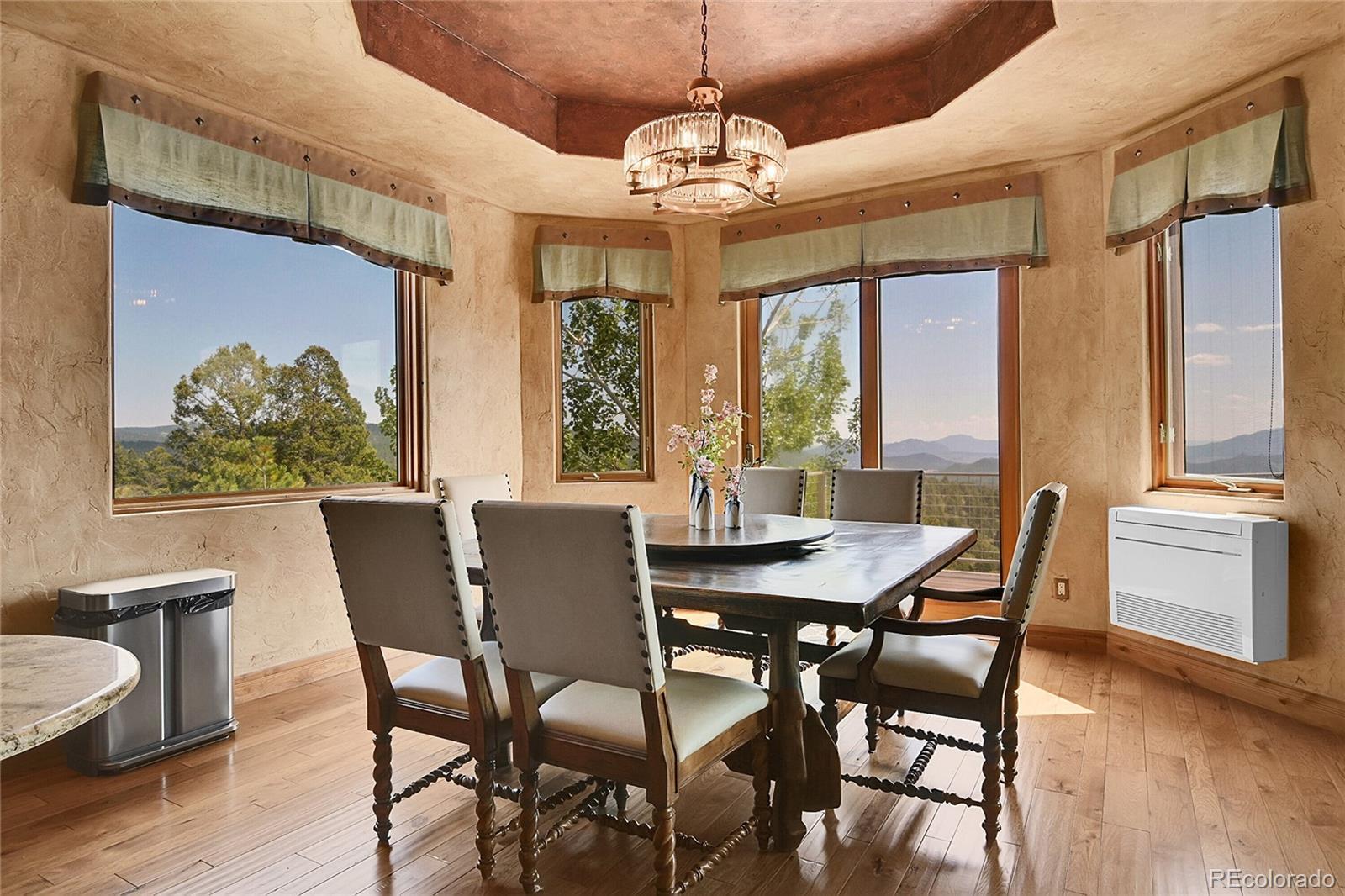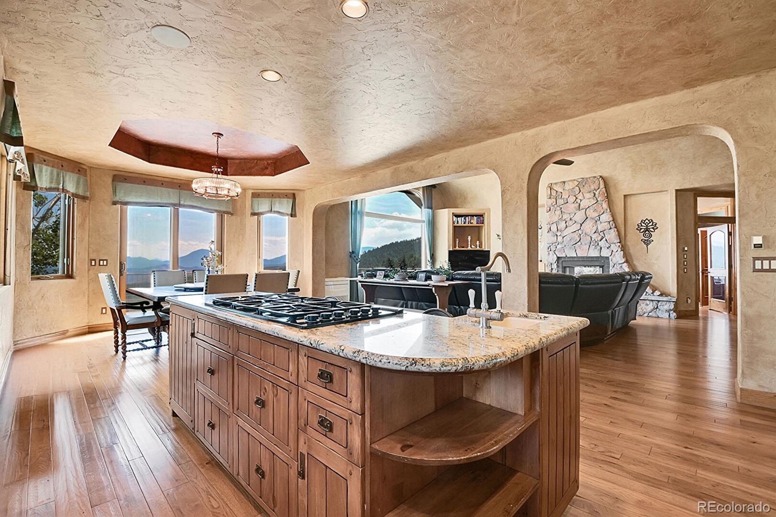 Mountain luxury and elegance with million-dollar views, main-floor living, and an attached In-Law apartment with a separate entrance—all within an hour of DIA and just 90 minutes to world-class skiing in Breckenridge, without the hassle of I-70 traffic. Situated on five beautifully mitigated acres backing to open space, this custom home in Douglass Ranch offers both tranquility and an easy commute to Denver or DTC. Enter through the stunning custom double doors and be captivated by the dramatic Pikes Peak views framed by the great room’s expansive windows. Designed by an artist, this home features warm hickory floors, a barrel-vaulted ceiling, and a striking ski-lift cable stair rail, with thoughtful details ensuring breathtaking views from nearly every room. The chef’s kitchen boasts a 6-burner Dacor gas cooktop, KitchenAid appliances, a new double convection oven and dishwasher, and a butler’s pantry with a built-in wine rack. The dining area opens onto 2,500 sq ft of Trex decking, perfect for entertaining or watching the elk migration. The main-floor primary suite is a luxurious retreat with a sitting room, spa-like five-piece bath, and a new custom walk-in closet. At the opposite end, the 800-sq-ft ADA-compliant apartment/guest quarters offers a full kitchen, living room, private deck, large bedroom, and ¾ bath, with a separate entrance providing privacy for multi-generational living. The lower level features a media room with a wet bar, blackout window coverings, a soundproof gym, and $24K in Smart Tech and AV, all controlled from your phone. Hardwired internet runs throughout, with redundancy for reliability. This level also includes a second guest apartment, and three en-suite bedrooms. Enjoy the indoor sauna, then step outside to the six-seat spa. The lower deck is DriDeck-covered for year-round use. Recent upgrades include a new Class 4 roof and gutters, ensuring durability and peace of mind.