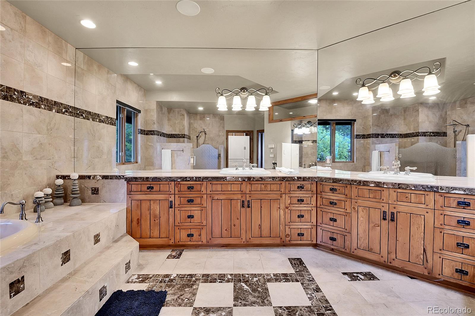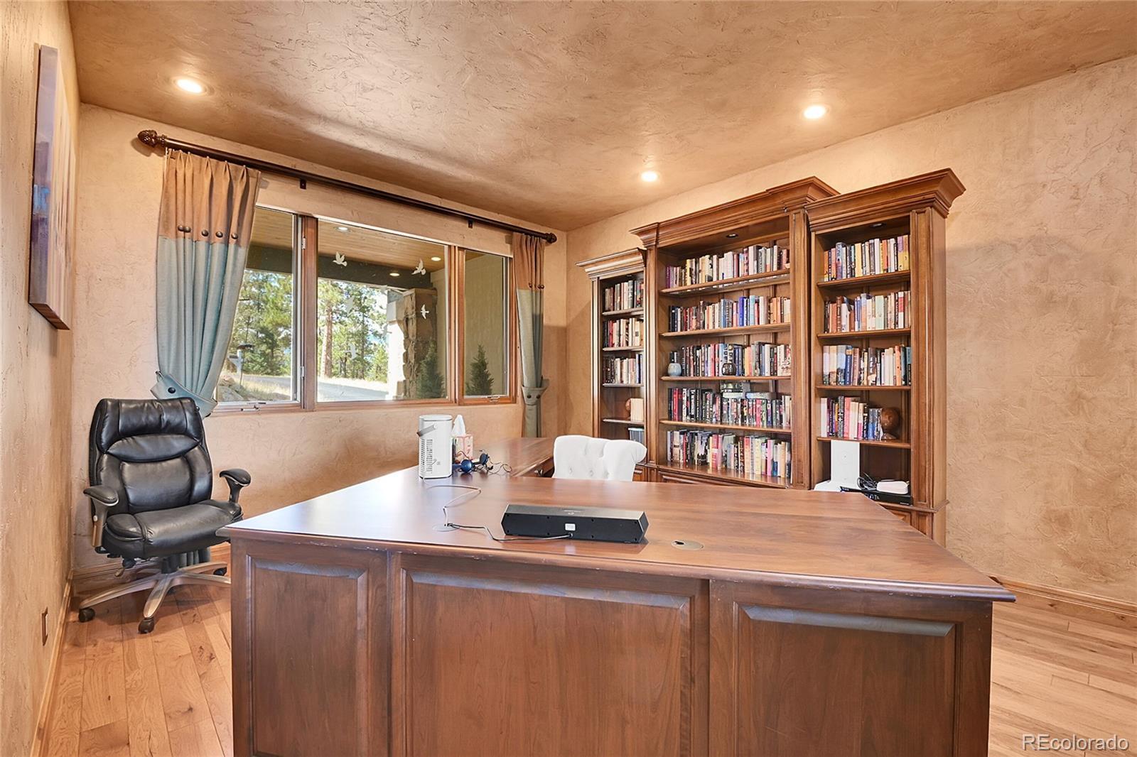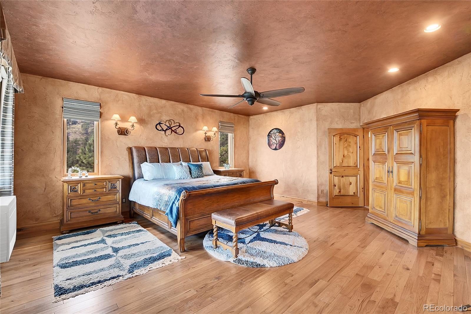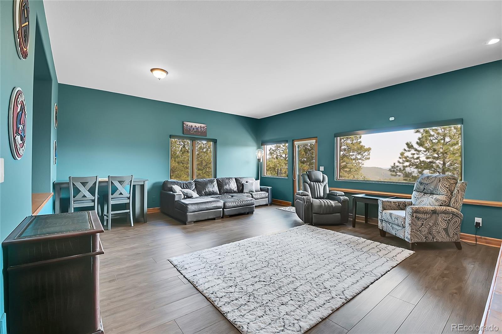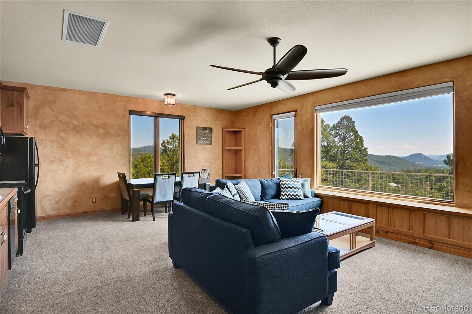 Mountain luxury and elegance with million-dollar views, main-floor living, and an attached In-Law apartment with a separate entrance—all within an hour of DIA and just 90 minutes to world-class skiing in Breckenridge, without the hassle of I-70 traffic. Situated on five beautifully mitigated acres backing to open space, this custom home in Douglass Ranch offers both tranquility and an easy commute to Denver or DTC. Enter through the stunning custom double doors and be captivated by the dramatic Pikes Peak views framed by the great room’s expansive windows. Designed by an artist, this home features warm hickory floors, a barrel-vaulted ceiling, and a striking ski-lift cable stair rail, with thoughtful details ensuring breathtaking views from nearly every room. The chef’s kitchen boasts a 6-burner Dacor gas cooktop, KitchenAid appliances, a new double convection oven and dishwasher, and a butler’s pantry with a built-in wine rack. The dining area opens onto 2,500 sq ft of Trex decking, perfect for entertaining or watching the elk migration. The main-floor primary suite is a luxurious retreat with a sitting room, spa-like five-piece bath, and a new custom walk-in closet. At the opposite end, the 800-sq-ft ADA-compliant apartment/guest quarters offers a full kitchen, living room, private deck, large bedroom, and ¾ bath, with a separate entrance providing privacy for multi-generational living. The lower level features a media room with a wet bar, blackout window coverings, a soundproof gym, and $24K in Smart Tech and AV, all controlled from your phone. Hardwired internet runs throughout, with redundancy for reliability. This level also includes a second guest apartment, and three en-suite bedrooms. Enjoy the indoor sauna, then step outside to the six-seat spa. The lower deck is DriDeck-covered for year-round use. Recent upgrades include a new Class 4 roof and gutters, ensuring durability and peace of mind.
