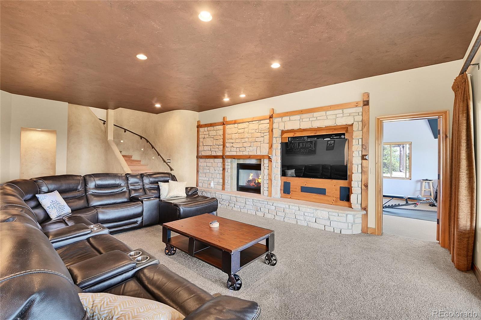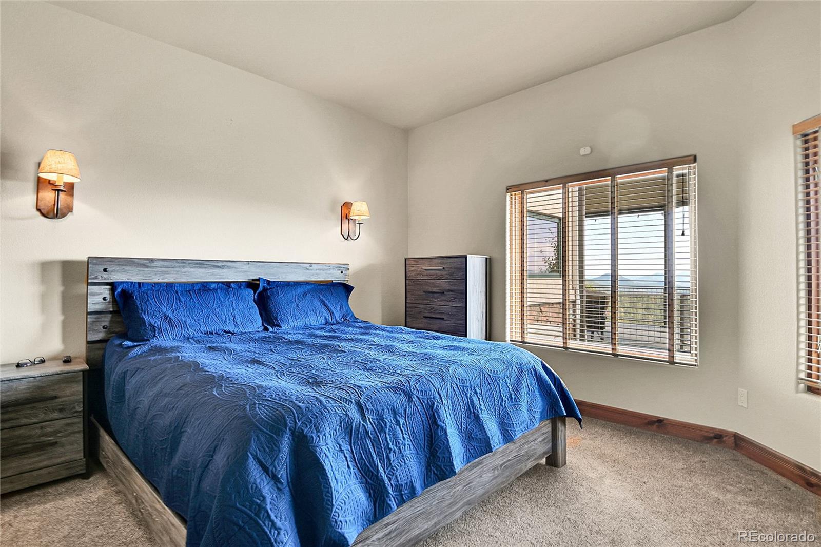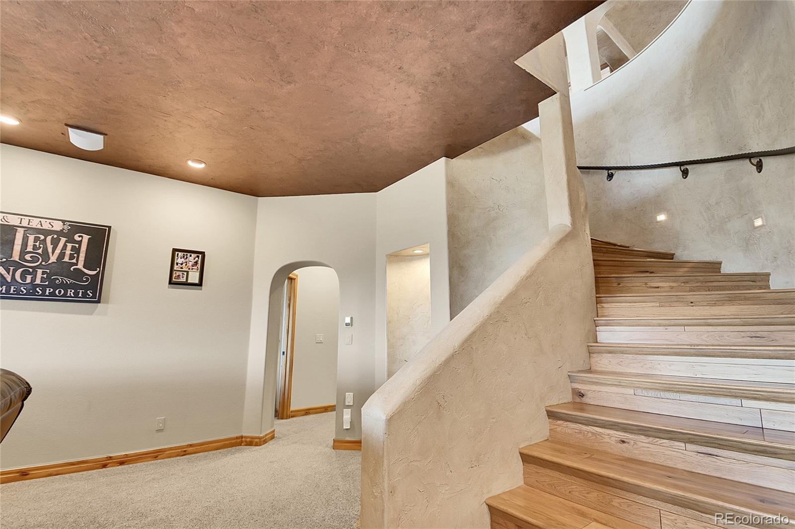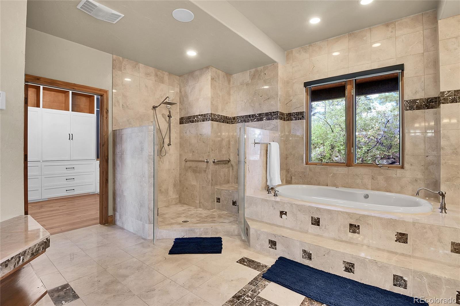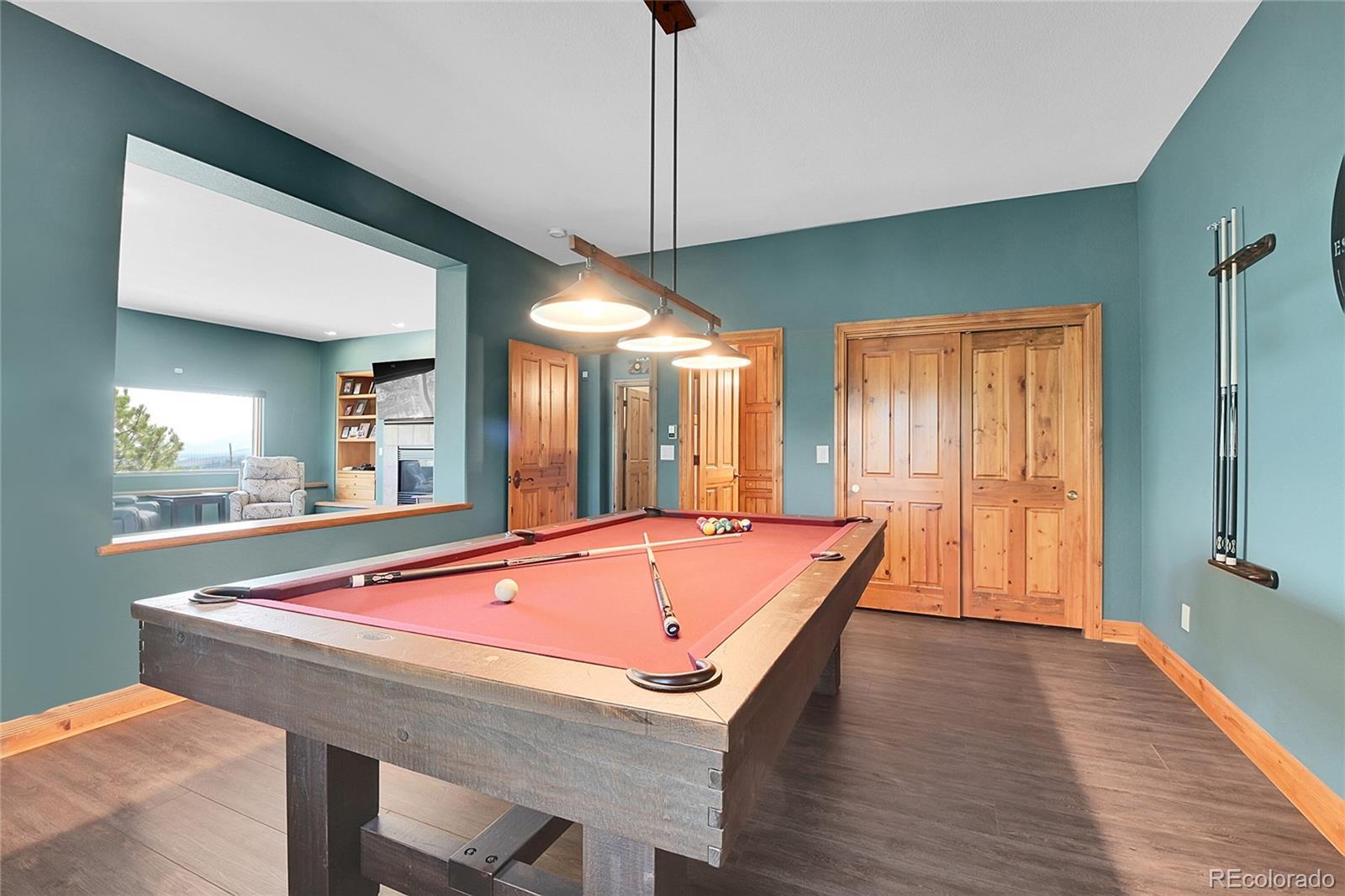 Mountain luxury and elegance with million-dollar views, main-floor living, and an attached In-Law apartment with a separate entrance—all within an hour of DIA and just 90 minutes to world-class skiing in Breckenridge, without the hassle of I-70 traffic. Situated on five beautifully mitigated acres backing to open space, this custom home in Douglass Ranch offers both tranquility and an easy commute to Denver or DTC. Enter through the stunning custom double doors and be captivated by the dramatic Pikes Peak views framed by the great room’s expansive windows. Designed by an artist, this home features warm hickory floors, a barrel-vaulted ceiling, and a striking ski-lift cable stair rail, with thoughtful details ensuring breathtaking views from nearly every room. The chef’s kitchen boasts a 6-burner Dacor gas cooktop, KitchenAid appliances, a new double convection oven and dishwasher, and a butler’s pantry with a built-in wine rack. The dining area opens onto 2,500 sq ft of Trex decking, perfect for entertaining or watching the elk migration. The main-floor primary suite is a luxurious retreat with a sitting room, spa-like five-piece bath, and a new custom walk-in closet. At the opposite end, the 800-sq-ft ADA-compliant apartment/guest quarters offers a full kitchen, living room, private deck, large bedroom, and ¾ bath, with a separate entrance providing privacy for multi-generational living. The lower level features a media room with a wet bar, blackout window coverings, a soundproof gym, and $24K in Smart Tech and AV, all controlled from your phone. Hardwired internet runs throughout, with redundancy for reliability. This level also includes a second guest apartment, and three en-suite bedrooms. Enjoy the indoor sauna, then step outside to the six-seat spa. The lower deck is DriDeck-covered for year-round use. Recent upgrades include a new Class 4 roof and gutters, ensuring durability and peace of mind.