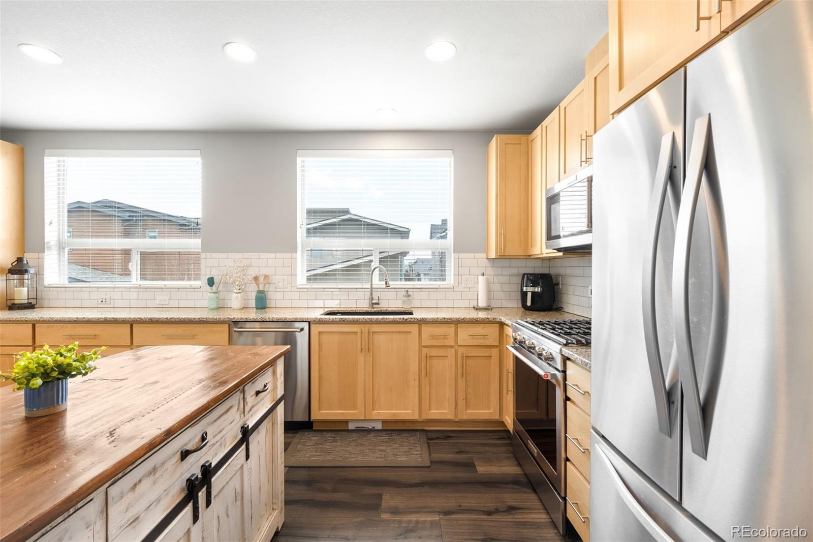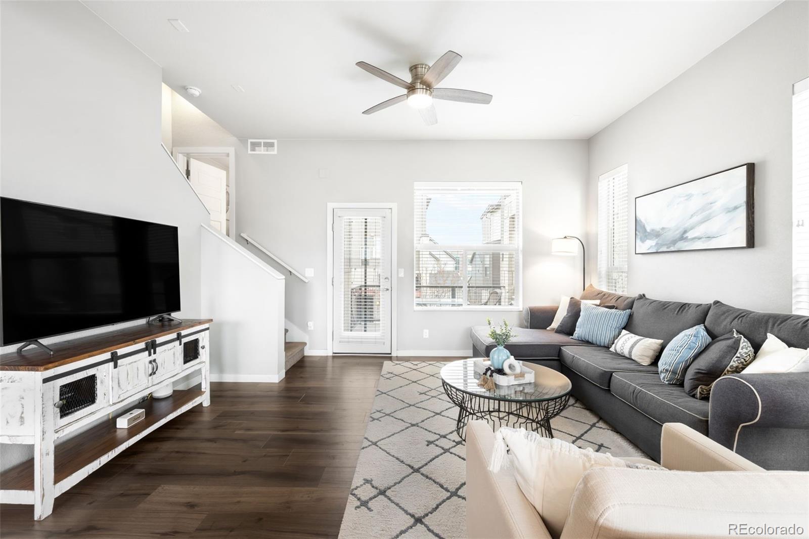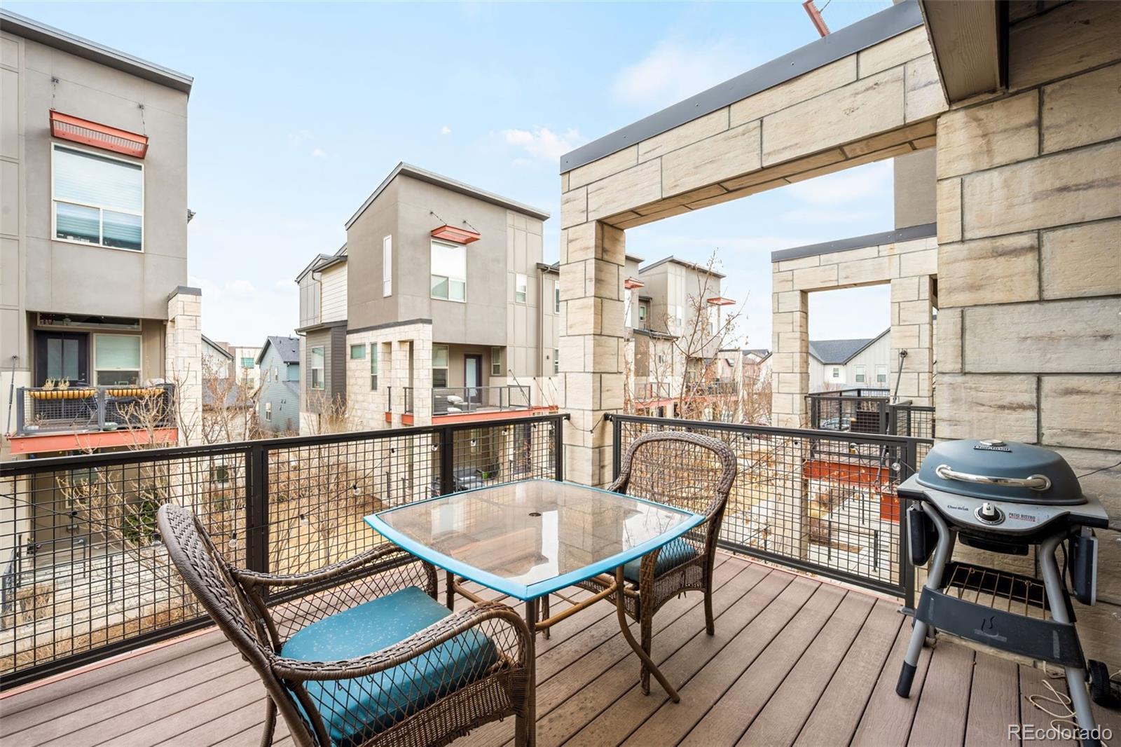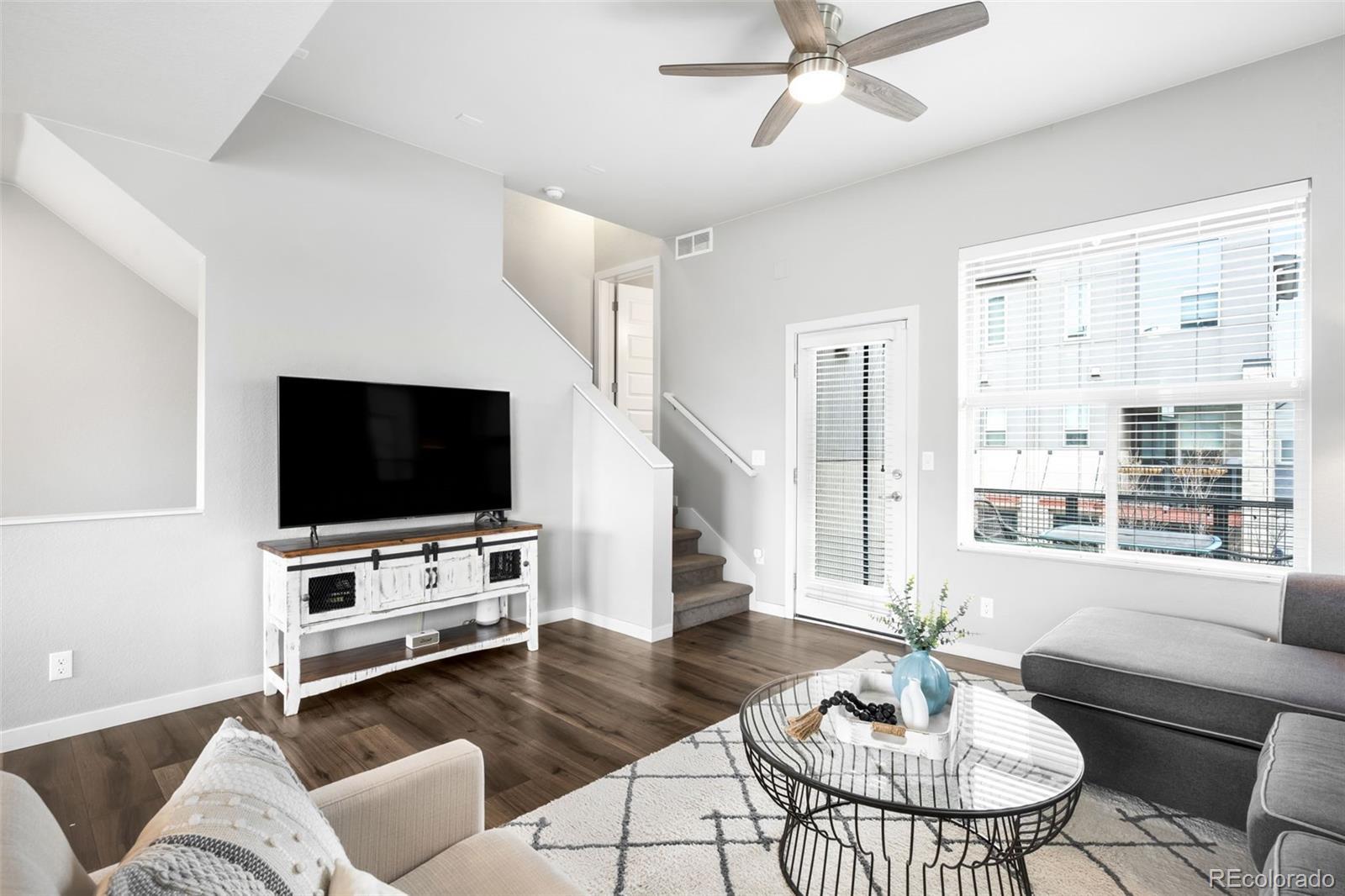 Amazing opportunity to own a beautifully appointed townhome in Central Park. Tucked into a desirable neighborhood, this home offers an exceptional location near shopping, restaurants, DIA, and Parks. From the moment you enter, rich floors and high ceilings create a warm and inviting space. The open-concept layout is light, bright, and airy—perfect for both everyday living and entertaining. The large kitchen features large windows, light wood cabinetry, sleek stainless steel appliances, and a crisp white subway tile backsplash, all opening to an expansive dining area. The two outdoor patios provides multiple generous options for gatherings and relaxation. Upstairs, the primary suite impresses with high ceilings, a spacious walk-in closet, and a luxurious en-suite bath with a glass-enclosed shower and bench seating. A second well-sized bedroom, adjacent full bath, and a conveniently located laundry closet add comfort and flexibility. Additional highlights include direct access to the attached two-car garage and a central vacuum system for added convenience. The Willow Park community offers a playground and tennis courts, with nearby parks, shopping, and dining, plus easy access to DIA and the Anschutz Medical Campus.