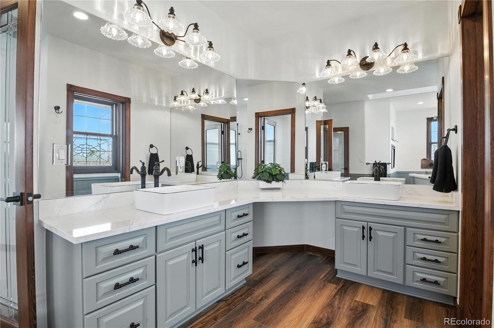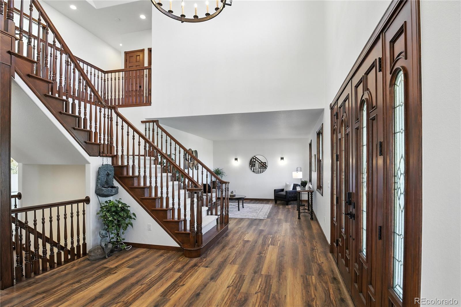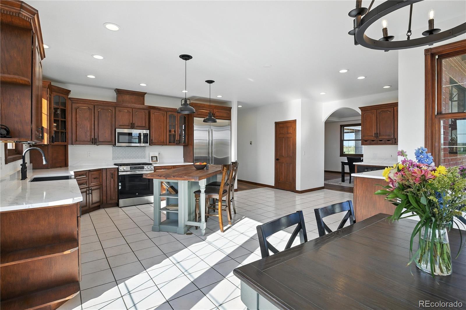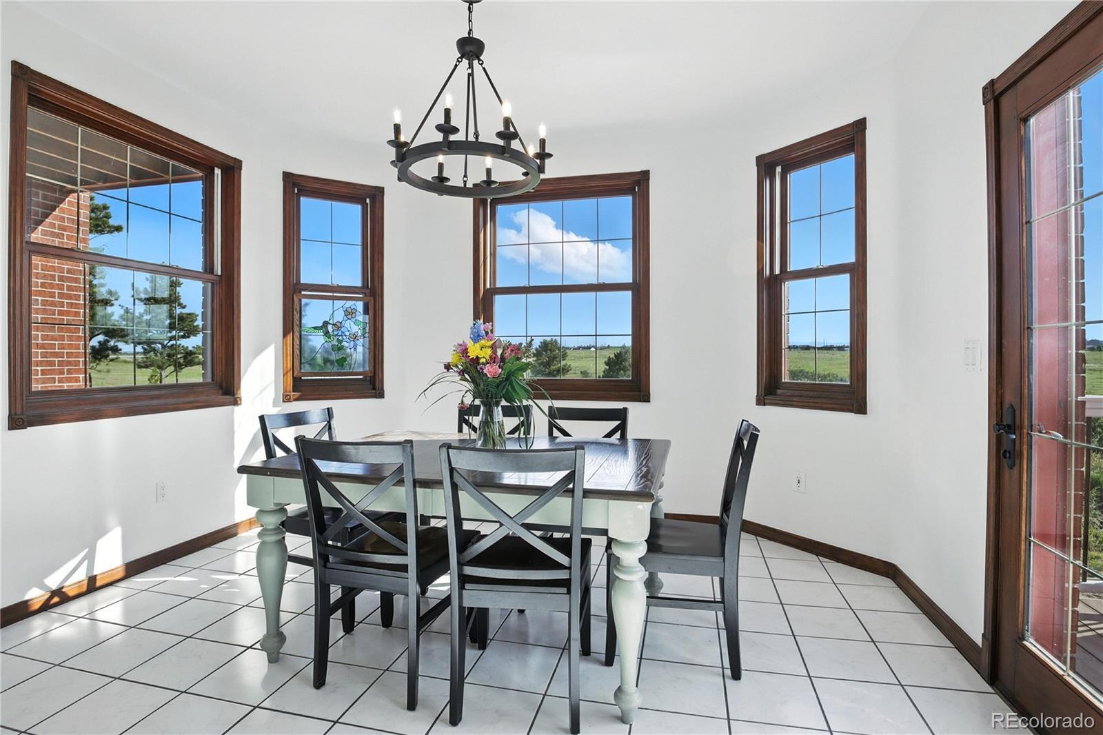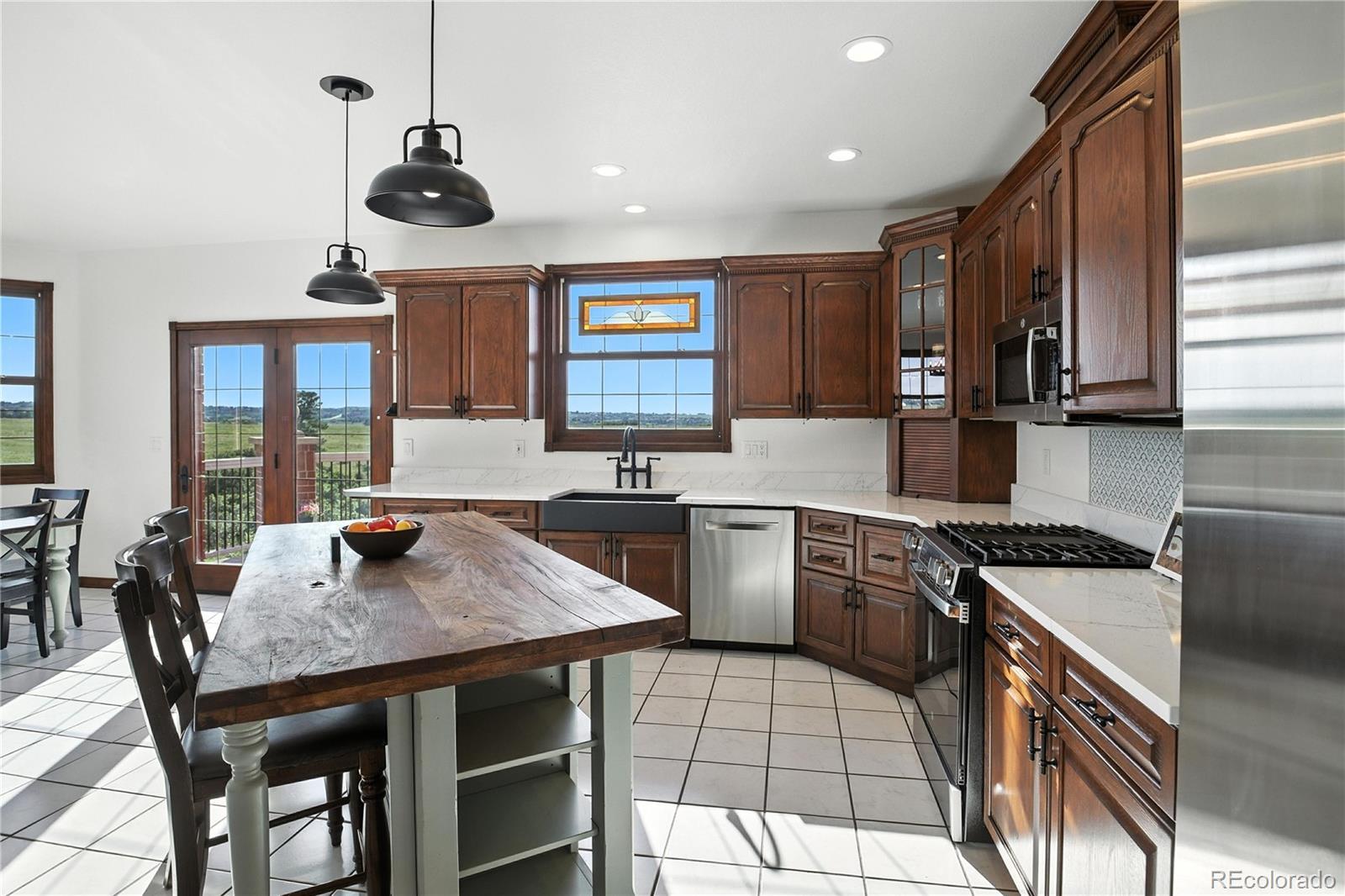 Experience unparalleled craftsmanship and breathtaking views in this meticulously remodeled 6,900 sq ft brick estate nestled on 33.5 acres of serene Colorado landscape. This 5-bedroom, 6-bathroom home features radiant in-floor heat, central vacuum, new light and plumbing fixtures, and custom-finished woodwork throughout. A grand foyer welcomes you beneath a designer Kevin Clarke chandelier equipped with a motorized winch for easy maintenance. The spacious layout includes a formal dining room for 12, a dedicated office with mountain views, and a basement retreat with a home theater, wine cellar/safe room, and walkout patio. Every bathroom has been luxuriously renovated with quartz or quartzite, custom tile showers, and new fixtures. The gourmet kitchen is a chef’s dream, boasting quartz countertops, top-tier appliances—including a JennAir Sub-Zero refrigerator, GE Prestige propane stove with built-in air fryer, Bosch dishwasher—plus a farmhouse sink with a mountain view, prep sink, and rainforest wood island. Seamless indoor-outdoor living is made easy with a large Trex deck, walkable trails, and patios that connect to lush surroundings. Storage is abundant with a huge laundry/craft room, 1500 sq ft heated 3-car garage with attic access, and a 2400 sq ft brick shop with an additional 800 sq ft woodworking space—complete with its own utilities, RV hookups, and 220-amp service. Outdoors, the property is a recreational paradise with two fully lined, fish-stocked ponds (one with a dock), archery and shooting ranges, multiple drainages for ATV or bike trails, and wildlife-viewing stands amid mature ponderosa pines. Enjoy a gated entrance with full security, terraced landscaping, heated livestock drinkers, and fenced pastures seeded with prairie grass. With flat ground perfect for future amenities like a pickleball court or riding arena, this estate seamlessly blends luxury living with nature, privacy, and potential. *Showings still during U\C*