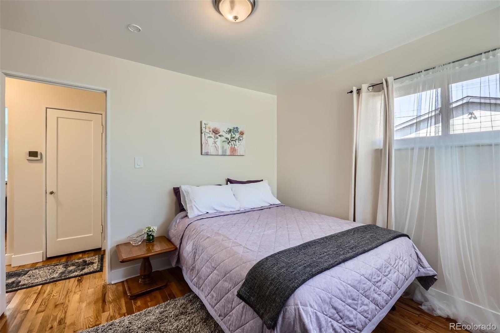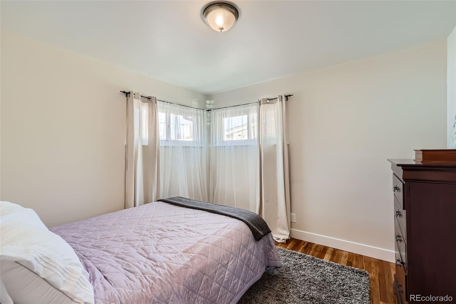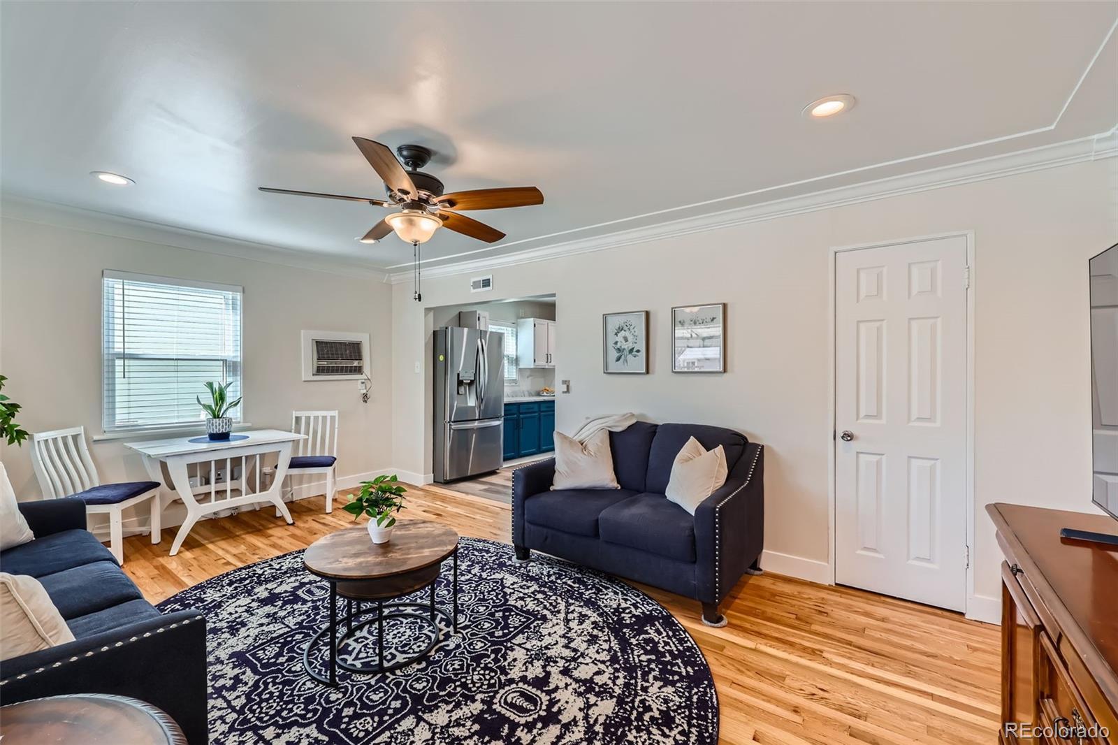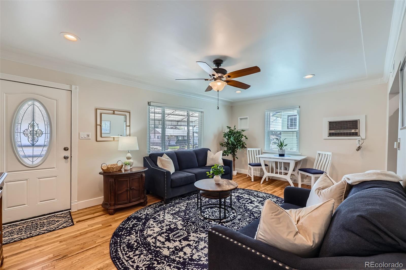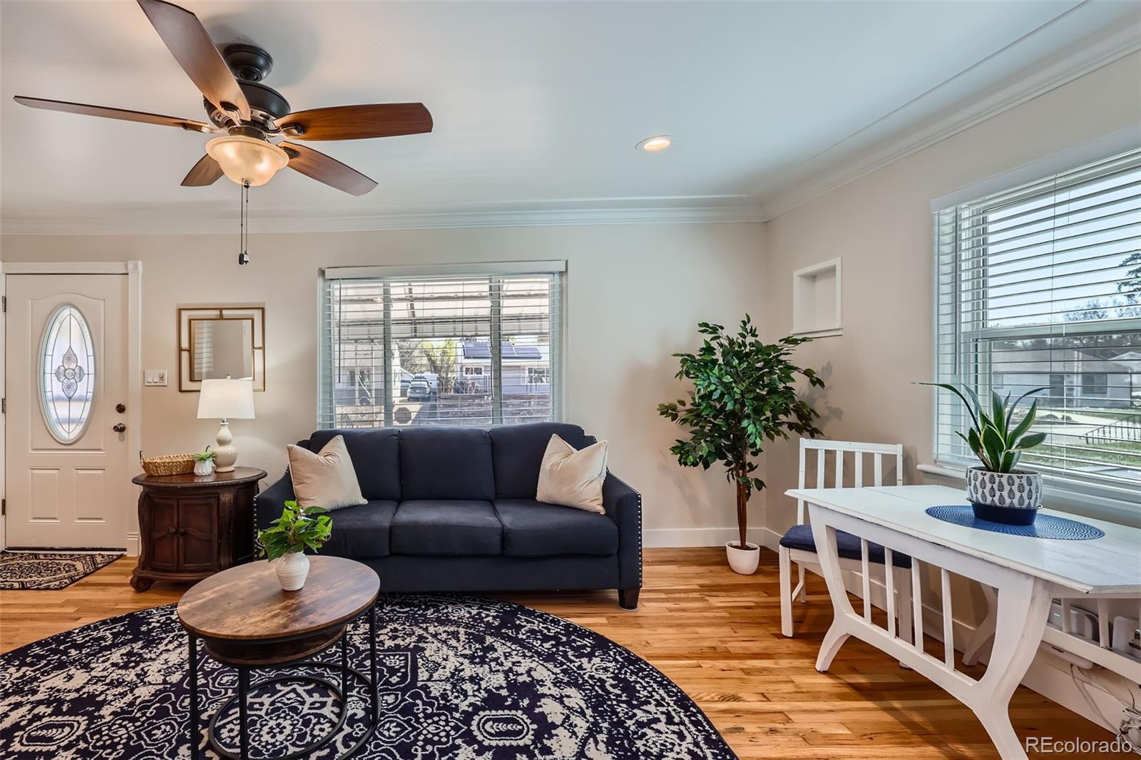 This 1954, beautifully updated 2/3-bedroom 1-bath bungalow offers an open floor plan and shows pride in ownership. Abundant natural light beams throughout the inviting interior with fresh paint throughout. Radiant refinished original hardwood floors. The living room and dining area offer recessed lighting and crown molding. The kitchen features laminate countertops, new backsplash, stainless-steel finished appliances with gas range. The back permitted back room can be used as a 3rd bedroom, office, workout, or bonus room has access to the laundry utility room and backyard. The exterior offers new wood siding, fresh paint, a newer roof (2019), newer furnace and new light fixtures. Enjoy the Colorado weather all year long under the front covered patio. Nestled in a prime location, this property offers modern living with convenience of being close to grocery stores, restaurants and entertainment. Whether you're looking to relax in the updated living spaces or explore the vibrant local area, this home provides the perfect balance of comfort and accessibility. Don't miss out on this incredible opportunity to own a stylish and conveniently located home!