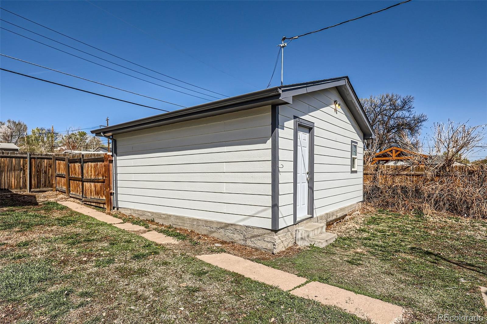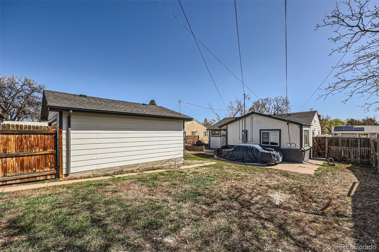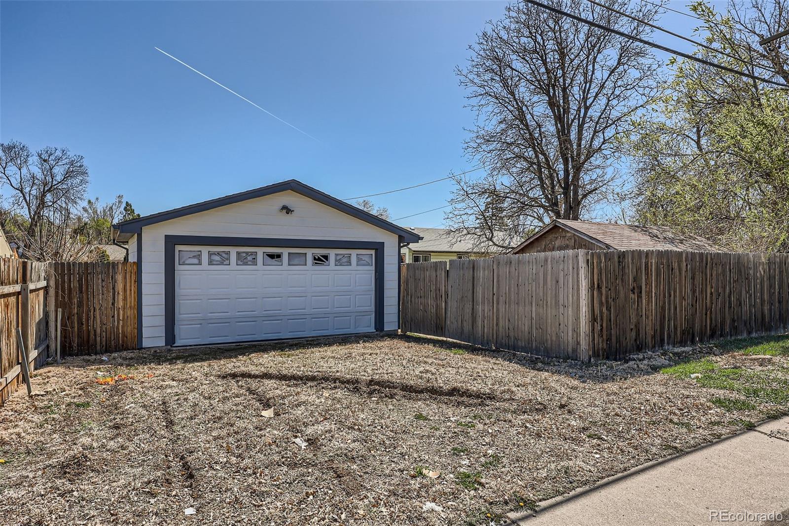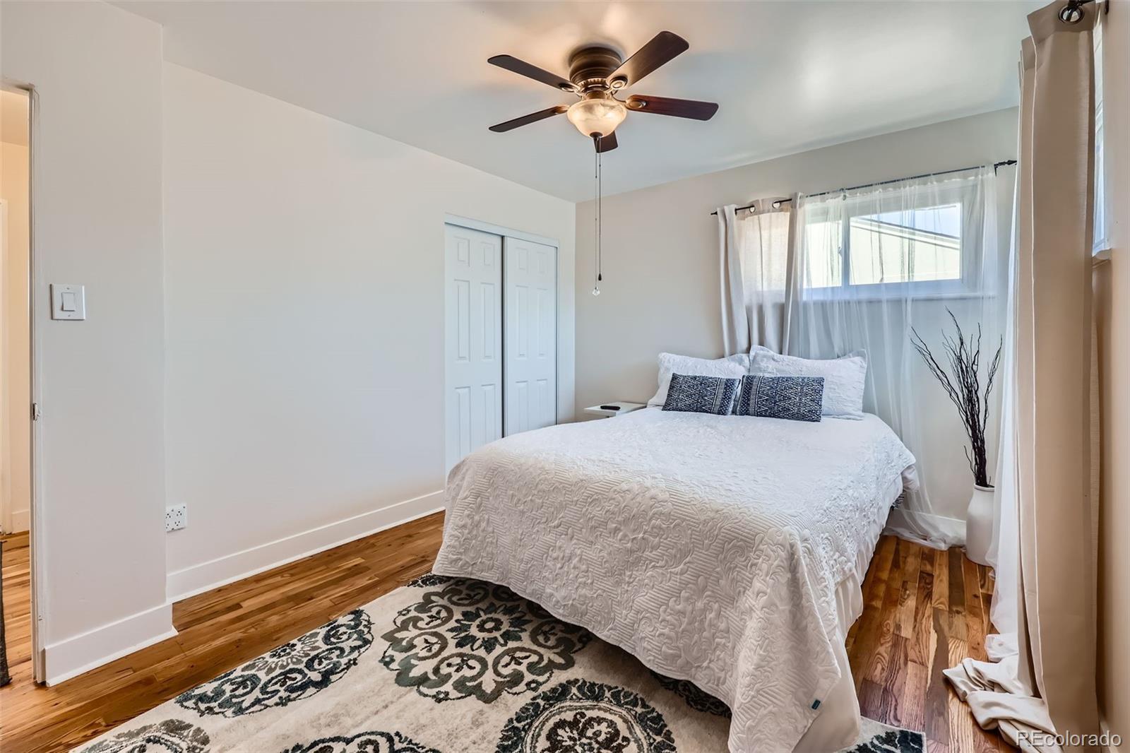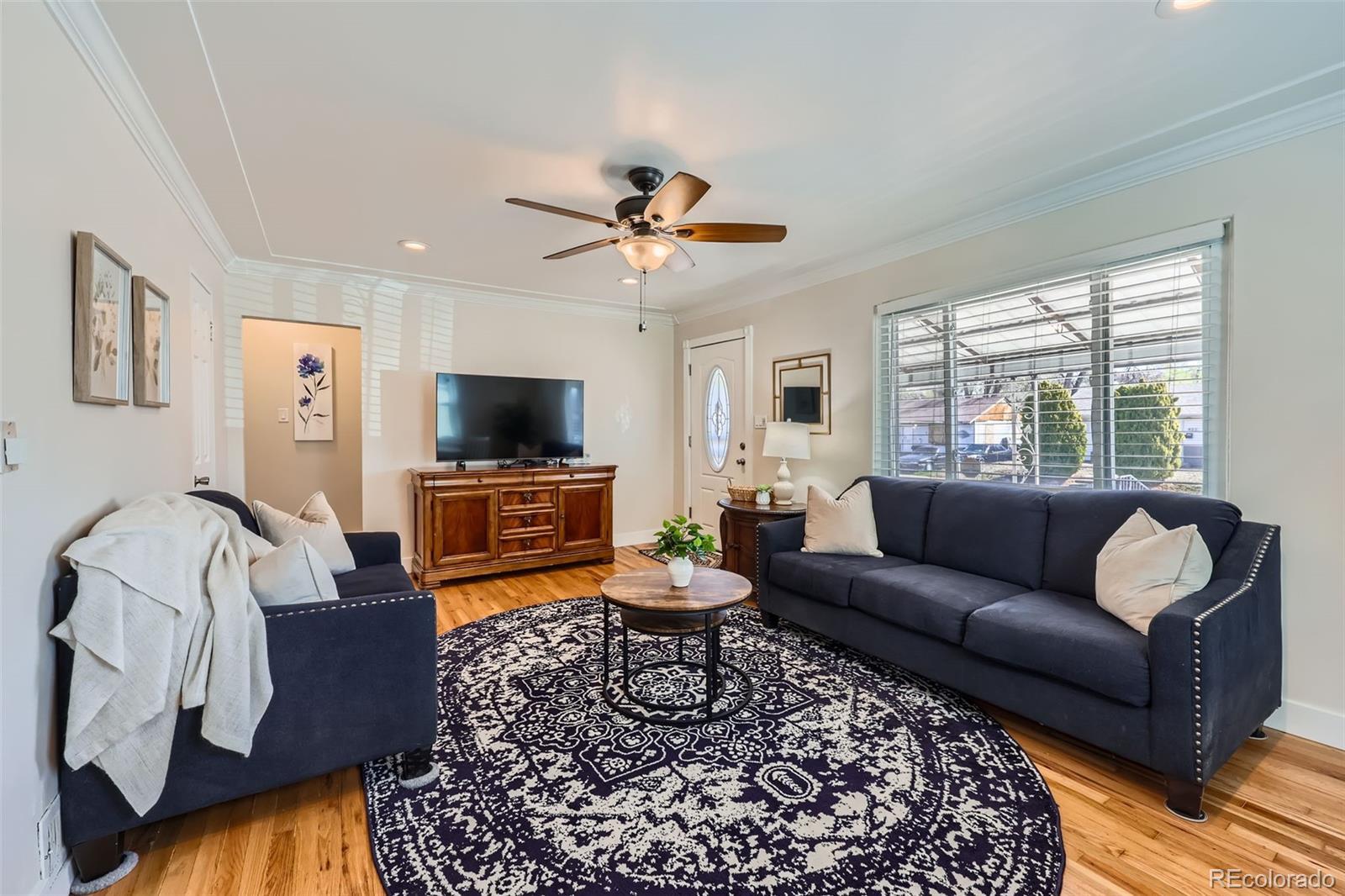 This 1954, beautifully updated 2/3-bedroom 1-bath bungalow offers an open floor plan and shows pride in ownership. Abundant natural light beams throughout the inviting interior with fresh paint throughout. Radiant refinished original hardwood floors. The living room and dining area offer recessed lighting and crown molding. The kitchen features laminate countertops, new backsplash, stainless-steel finished appliances with gas range. The back permitted back room can be used as a 3rd bedroom, office, workout, or bonus room has access to the laundry utility room and backyard. The exterior offers new wood siding, fresh paint, a newer roof (2019), newer furnace and new light fixtures. Enjoy the Colorado weather all year long under the front covered patio. Nestled in a prime location, this property offers modern living with convenience of being close to grocery stores, restaurants and entertainment. Whether you're looking to relax in the updated living spaces or explore the vibrant local area, this home provides the perfect balance of comfort and accessibility. Don't miss out on this incredible opportunity to own a stylish and conveniently located home!