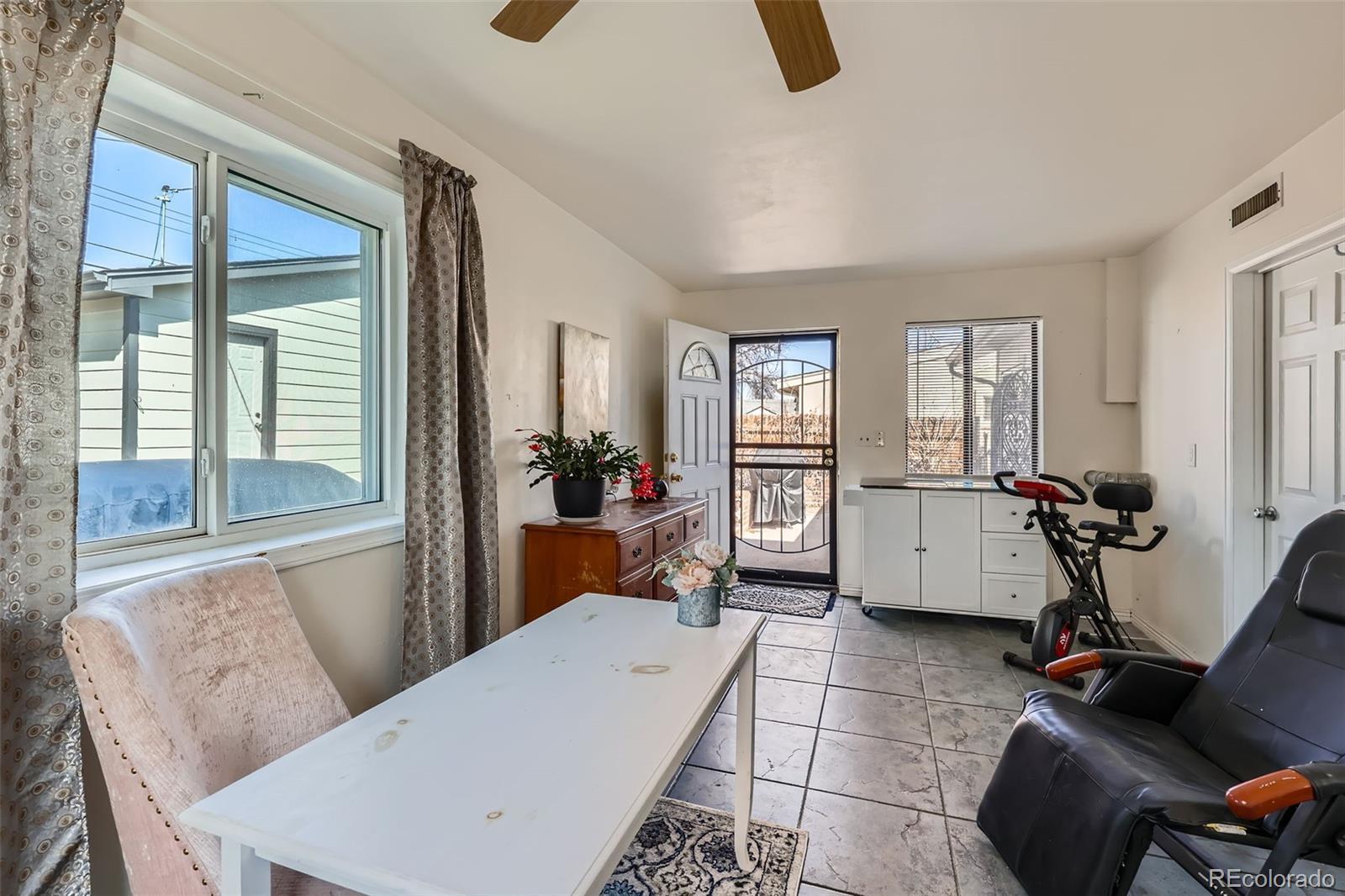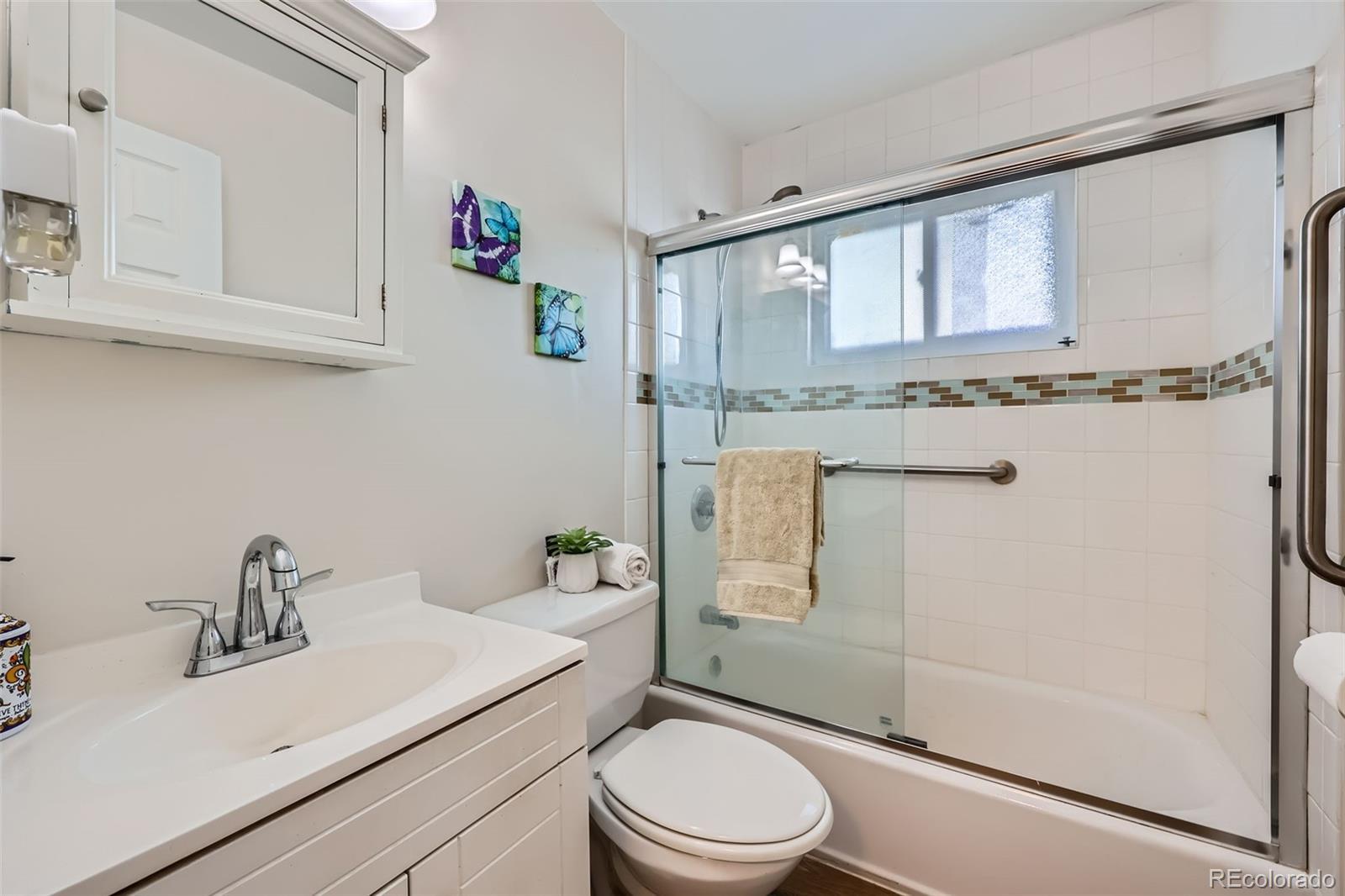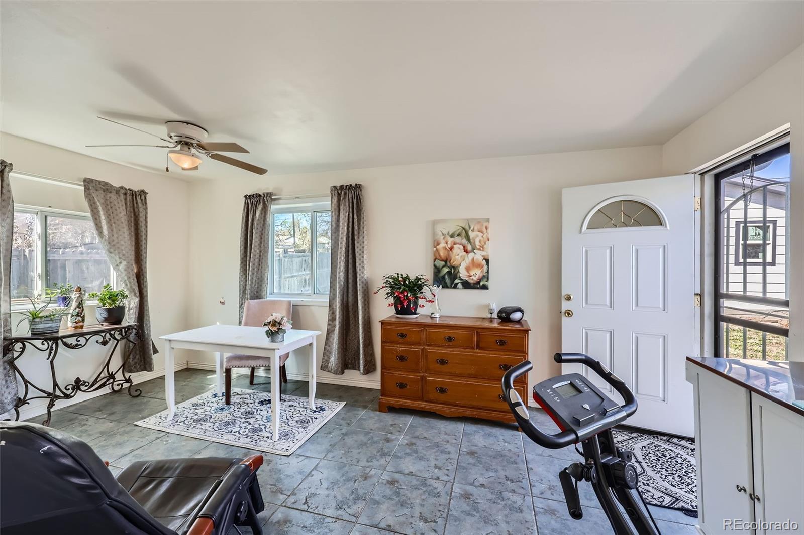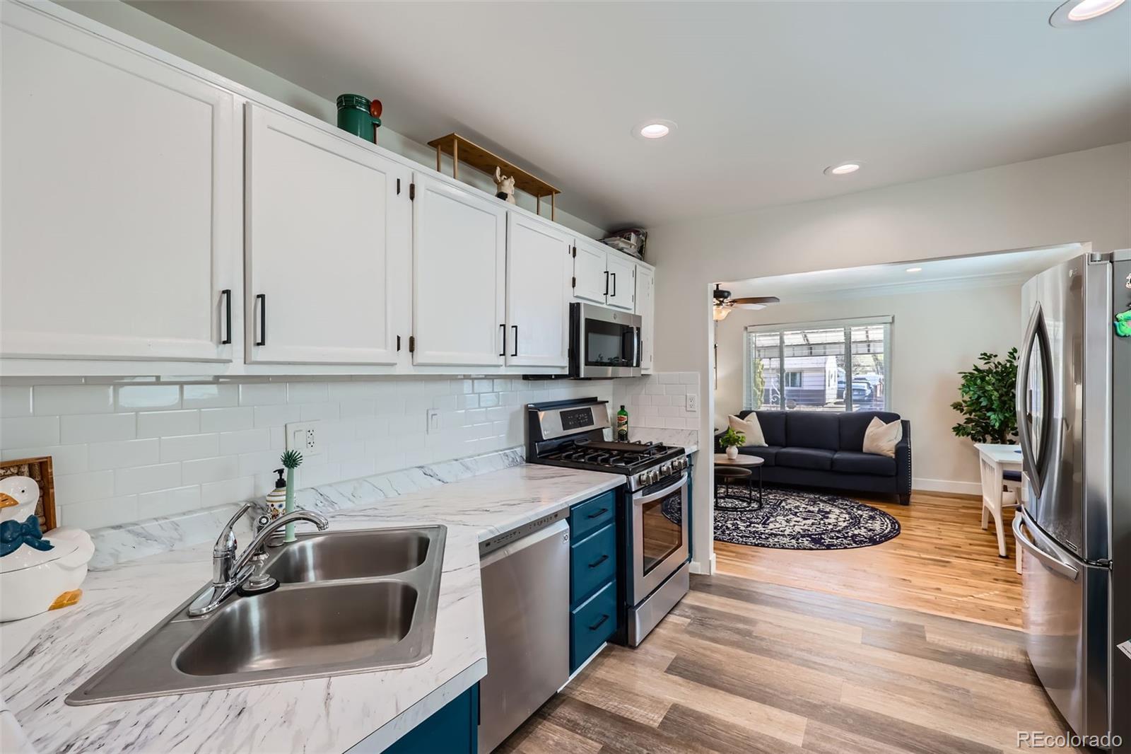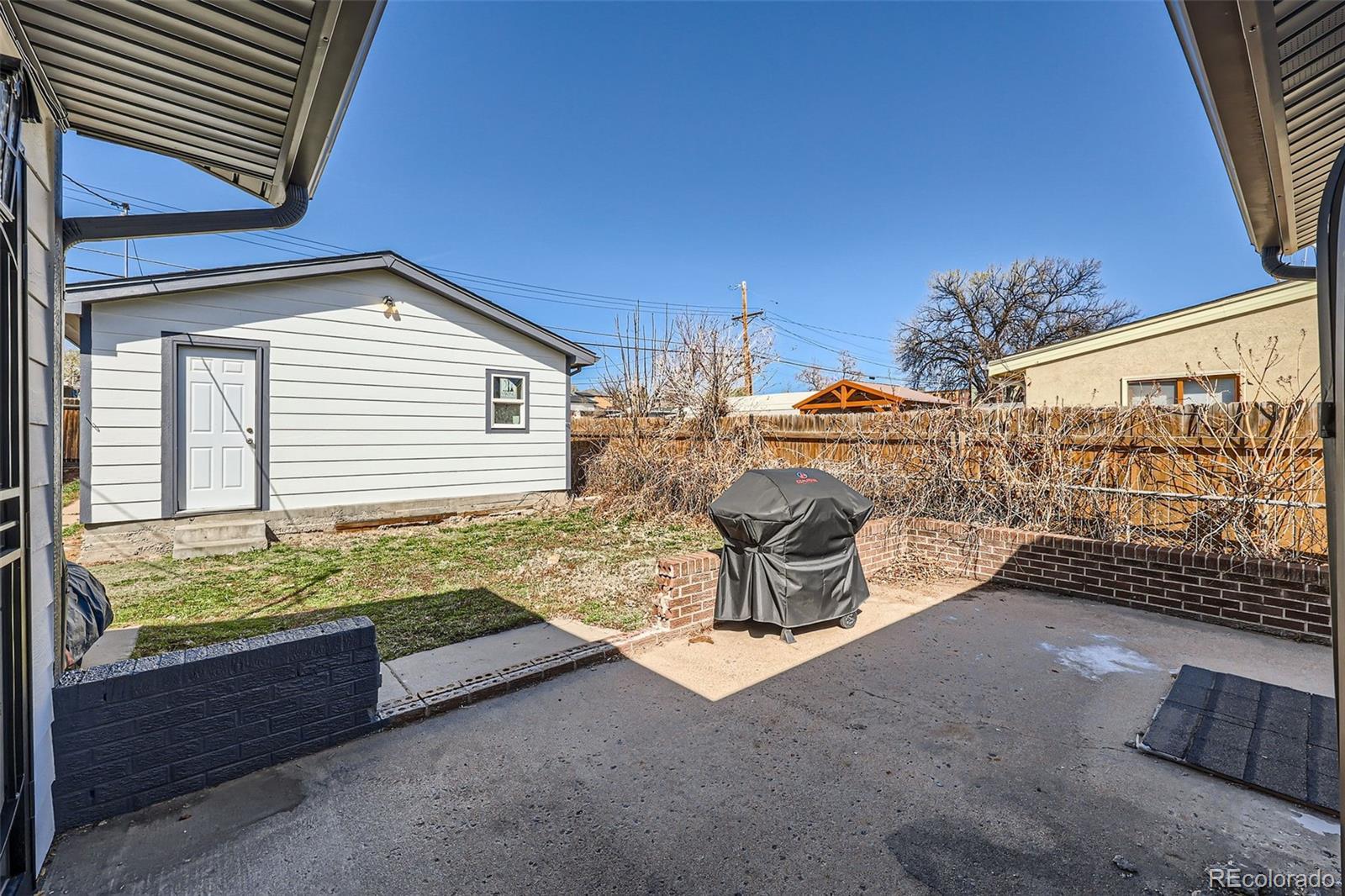 This 1954, beautifully updated 2/3-bedroom 1-bath bungalow offers an open floor plan and shows pride in ownership. Abundant natural light beams throughout the inviting interior with fresh paint throughout. Radiant refinished original hardwood floors. The living room and dining area offer recessed lighting and crown molding. The kitchen features laminate countertops, new backsplash, stainless-steel finished appliances with gas range. The back permitted back room can be used as a 3rd bedroom, office, workout, or bonus room has access to the laundry utility room and backyard. The exterior offers new wood siding, fresh paint, a newer roof (2019), newer furnace and new light fixtures. Enjoy the Colorado weather all year long under the front covered patio. Nestled in a prime location, this property offers modern living with convenience of being close to grocery stores, restaurants and entertainment. Whether you're looking to relax in the updated living spaces or explore the vibrant local area, this home provides the perfect balance of comfort and accessibility. Don't miss out on this incredible opportunity to own a stylish and conveniently located home!