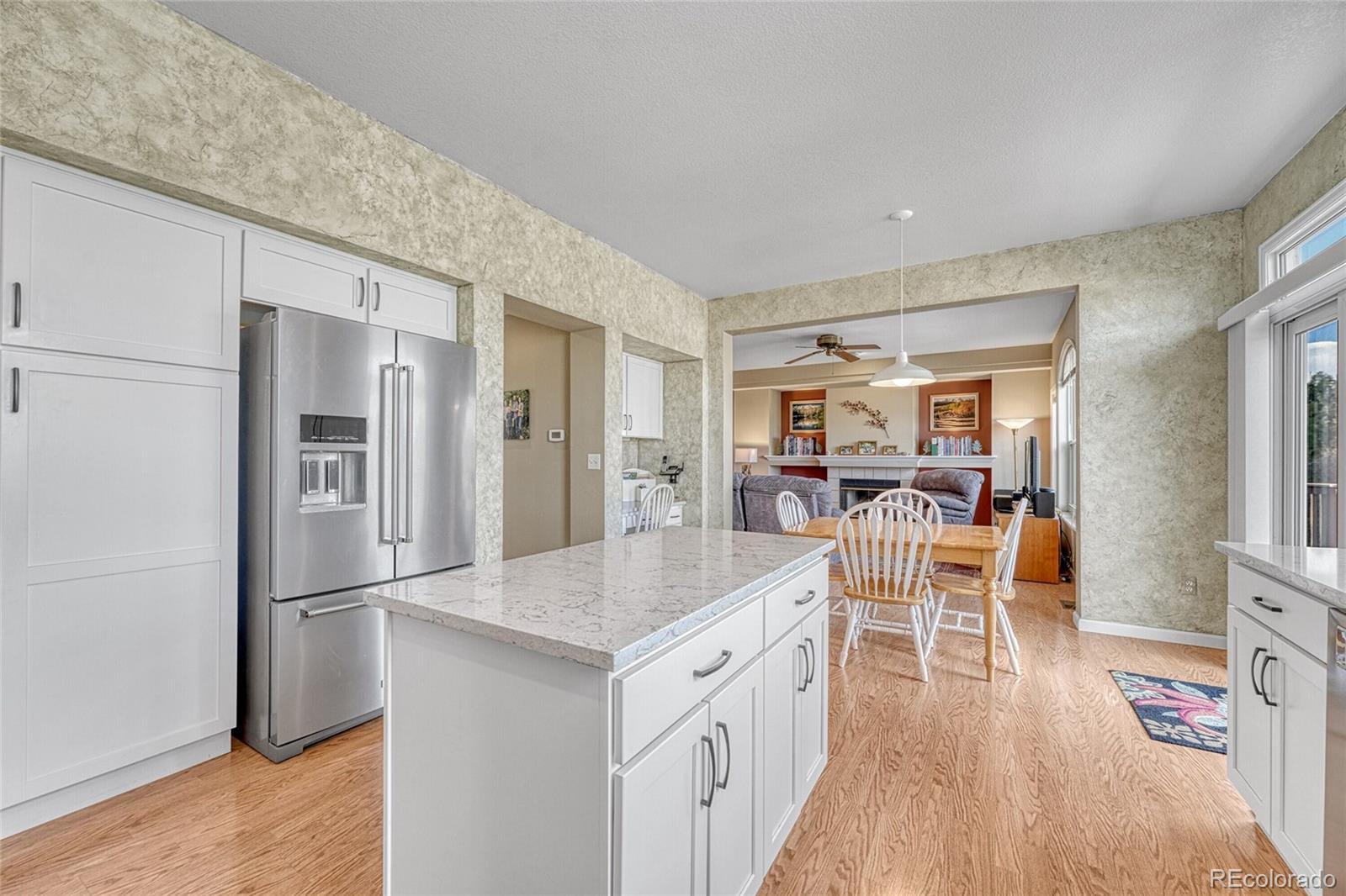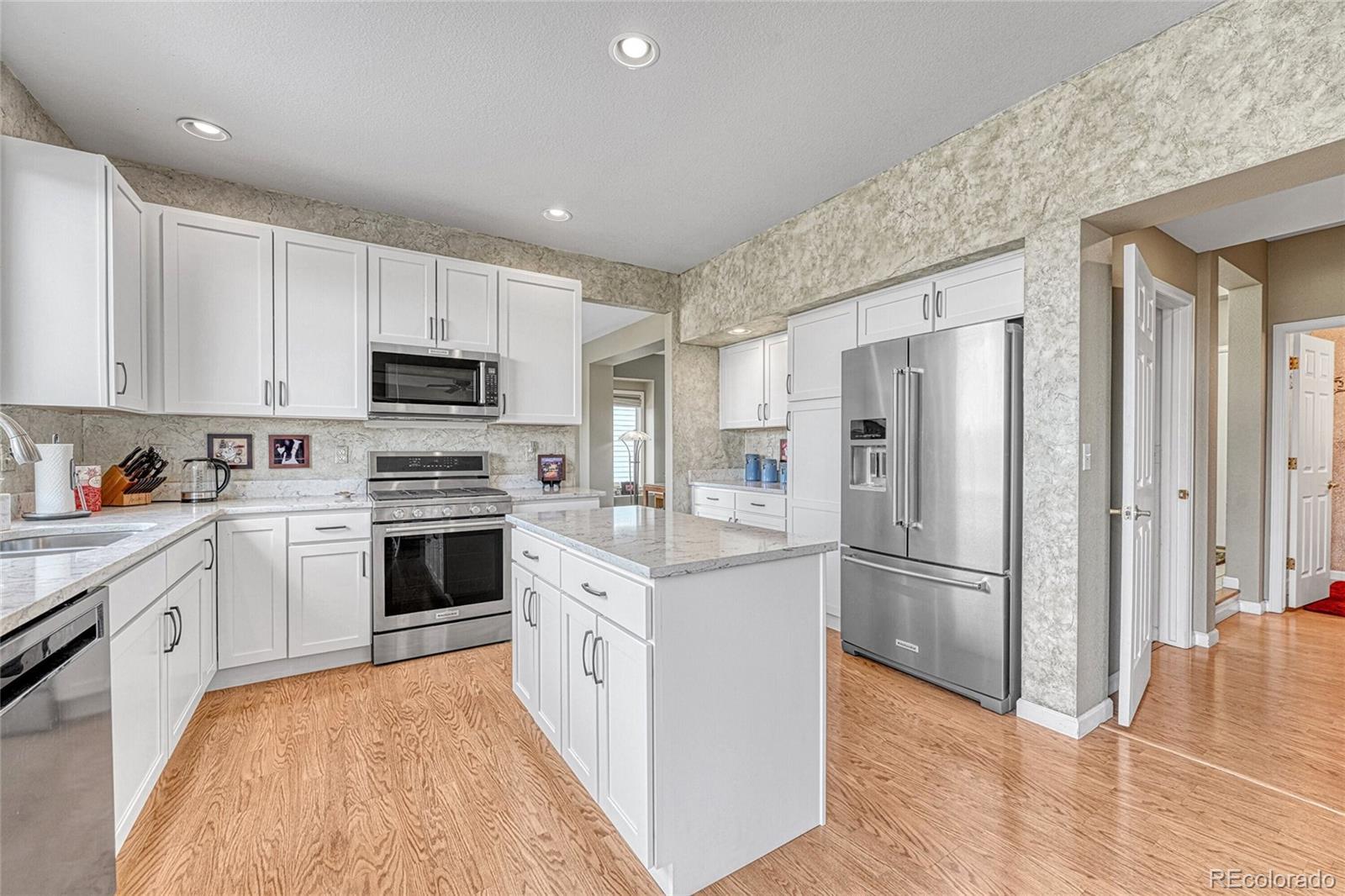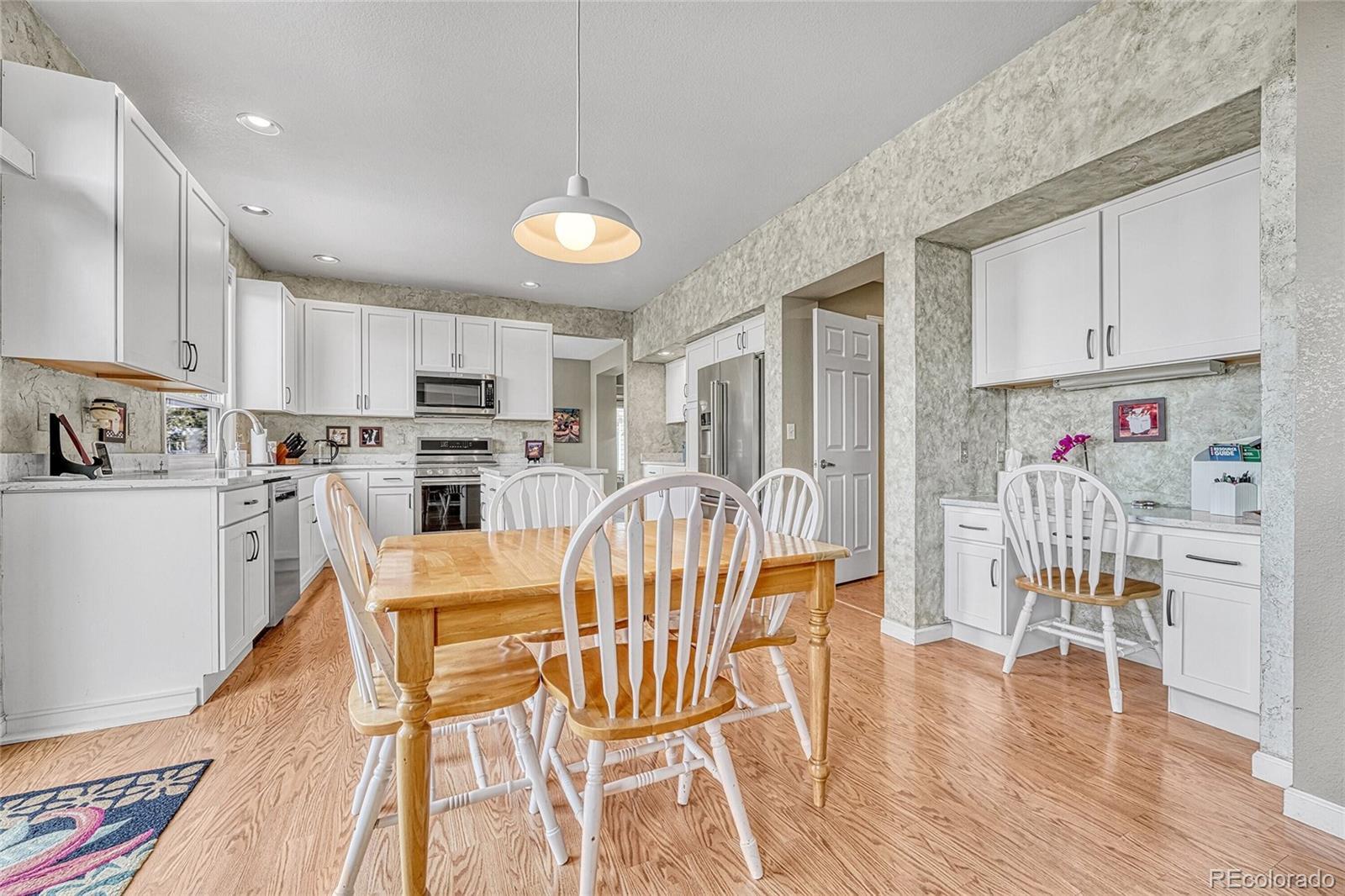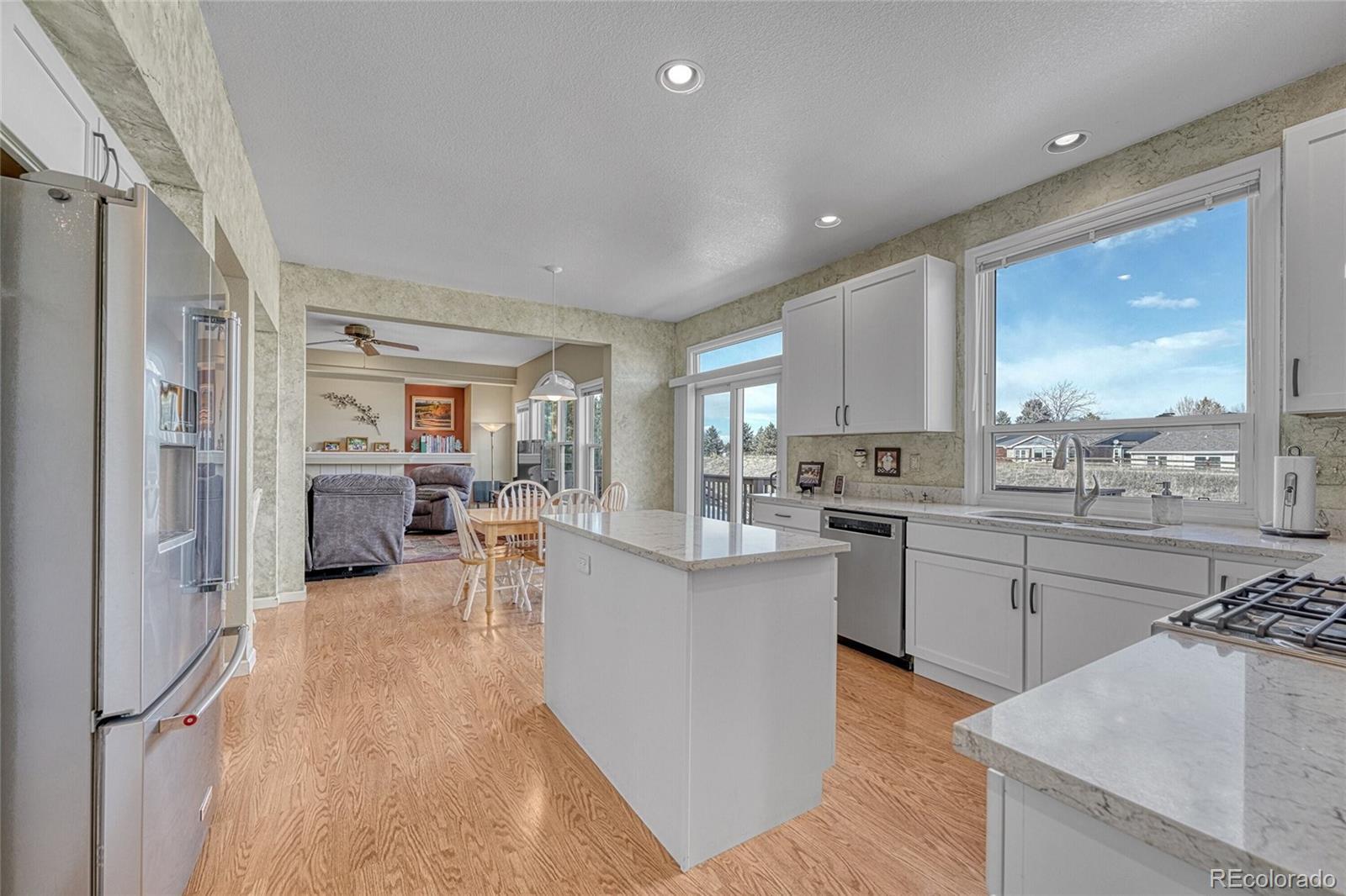 Welcome to this stunning impeccably maintained single-family home located in the desirable Highlands Ranch community backing up to miles of Highlands Ranch paved trails. This expansive property features 4 bedrooms, 4 bathrooms all within an impressive 3,804 square feet of space. A 3 car attached garage as well as backyard storage shed allows an abundance of storage. With a spacious layout that accommodates all types of Buyers as this home is designed for both comfort and functionality. Upon entering, you are greeted by a tiled grand foyer with high ceilings and natural light that flows throughout. The open floor plan seamlessly connects the living room, dining room, and kitchen, making it perfect for gatherings. The recently updated kitchen is a chef's dream, boasting stainless steel appliances, a large center island, and elegant white cabinetry complemented by light quartz counter tops surrounded by hardwood style flooring. The family room is a cozy retreat with a fireplace and ample natural light afforded through abundant windows with views of the large Trex deck complete with retractable awning and open trails beyond. The upper floors' large primary bedroom offers a vaulted ceiling and an ensuite 5 piece bathroom with a double vanity and garden tub. Three more bedrooms are also on the upper floor, some with mountain views, as well as a full bath with double sinks. The walk-out basement is finished with a 3/4 bath and large recreational area including a bar designed for entertaining. The property also has a "paid" for Solar electricity generation system, newer windows, newer roof and newer HVAC system plus a Home Warranty to insure reduced future maintenance expenses. Outside, the property features a beautifully landscaped and irrigated yard with a patio and deck, ideal for outdoor entertaining or enjoying Colorado's stunning sunsets. The Highlands Ranch community offers a wealth of amenities including parks, trails, schools, sports fields,recreational facilities.