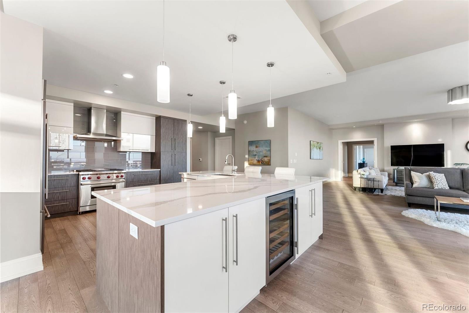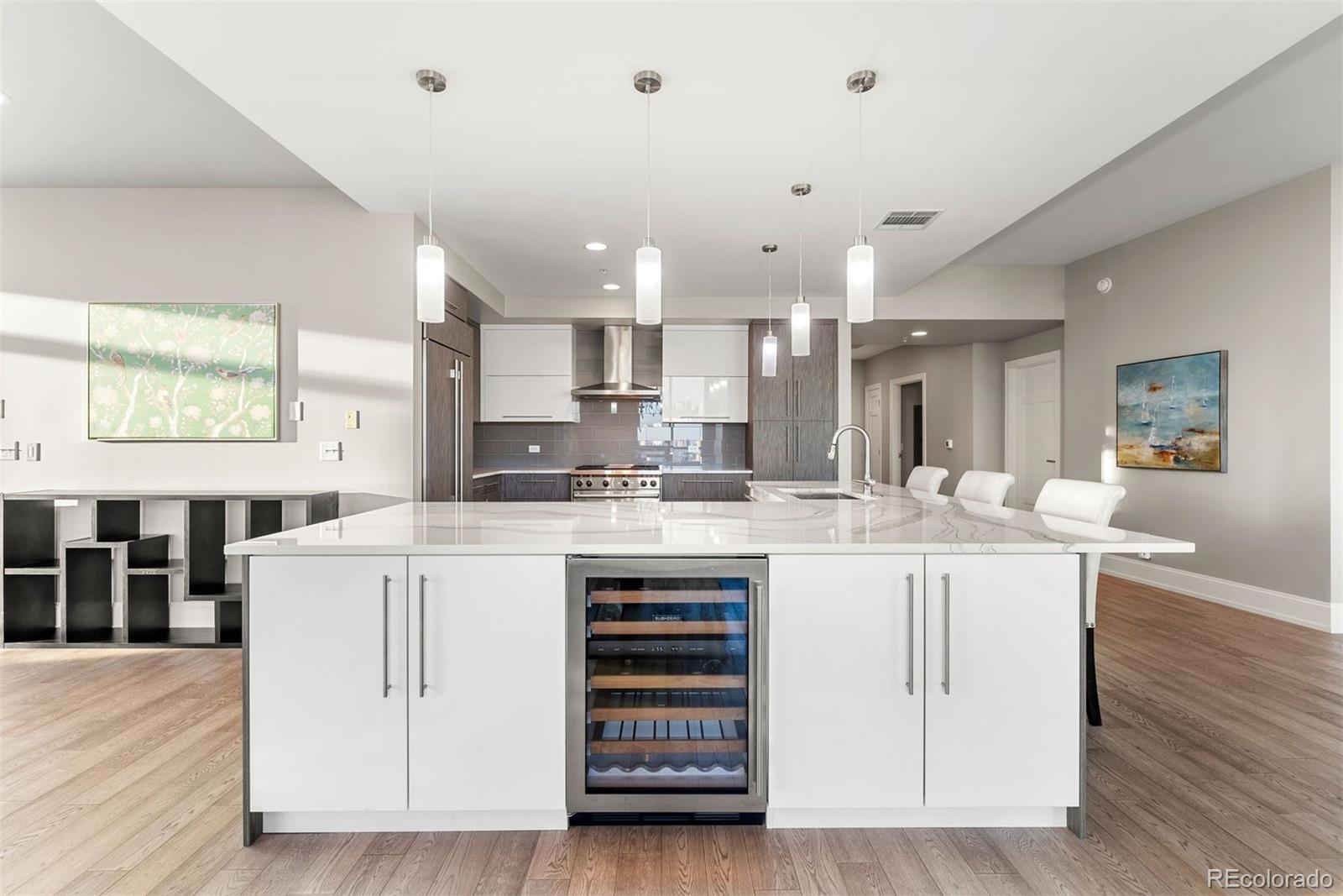 ALFRESCO LIVING on THREE terraces. 1,100 SF TERRACE, a PRIVATE terrace off primary and 3rd terrace off dining. This designer sanctuary offers unparalleled views, blending the vibrant cityscapes with the serene peaks of the Rocky Mountains. The open design concept ensures a seamless flow of space and light, enhanced by lofty ceilings and expansive windows that frame the captivating views. The reimagined Kitchen design sets the stage for culinary excellence with Professional Wolf and Sub-Zero appliances, custom cabinetry, and temperature-controlled wine storage. All encased in the oversized corner island anchoring the kitchen. The jewel box living room is framed on one end by a fireplace and media zone. Inversely, a formal cocktail lounge, occupies the other side. It has the size to cultivate any dream design while thoughtfully curated to provide an ambiance of sophisticated urban living. The residence wing is conveniently enclosed behind double doors. Perfect for a professional host, ensuring guests can roam freely while keeping personal space private. The Primary Suite, offering breathtaking city views from a private patio, a lavish five-piece bathroom adorned w/ herringbone Calcutta tile, Display wall and walk-in closet room. Also behind the double doors is a Guest Suite promising equally stunning views, a lavish guest bathroom with/ dual sinks, a soaker tub, and a walk-in shower adorned with artisan tile work. The STUDIO 3rd bedroom has an en-suite bath, walk-in closet, a wall of windows framing the private terrace. The BUILT-IN THEATRE can also be a 4th NC GUEST SUITE/OFFICE/GYM. One Lincoln Park resort lifestyle includes a private penthouse-level elevator, 24/7 concierge, Owner’s Club, Infinity Pool & Spa, and Fitness Center w/ Private Studios. All situated in the heart of Denver. This residence promises a lifestyle of unparalleled convenience & luxury. Walkable to Michelin Rated Restaurants, Coors Field, The Vibrant RINO, Union Station and MORE!