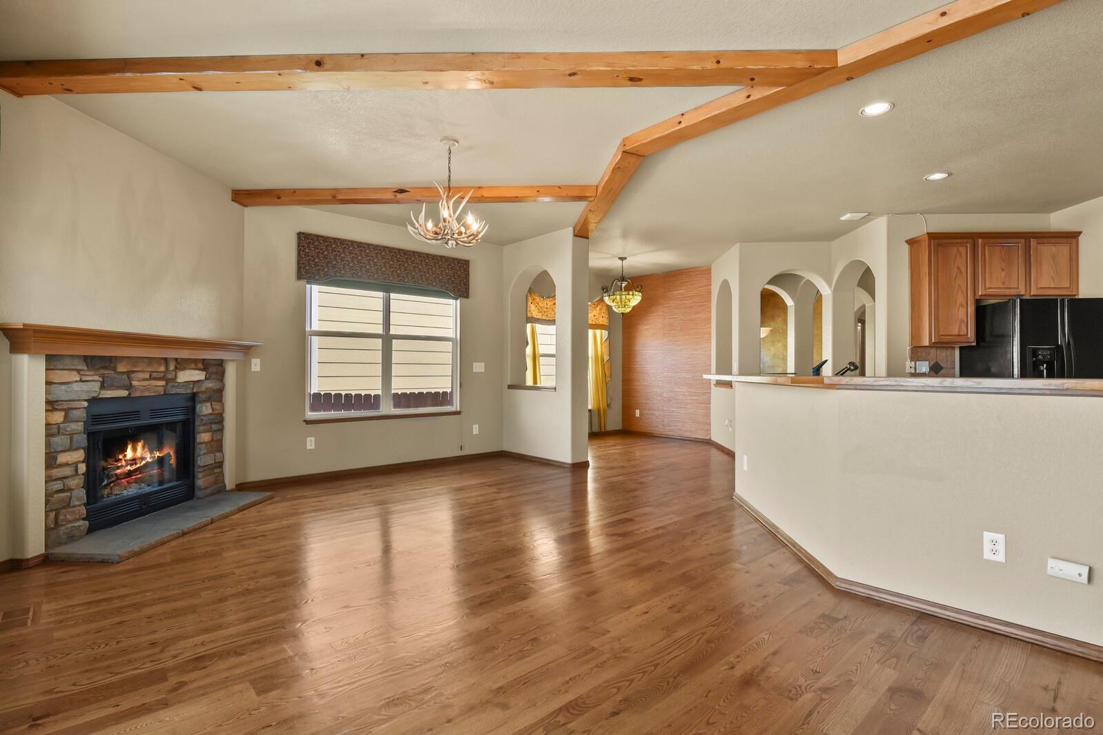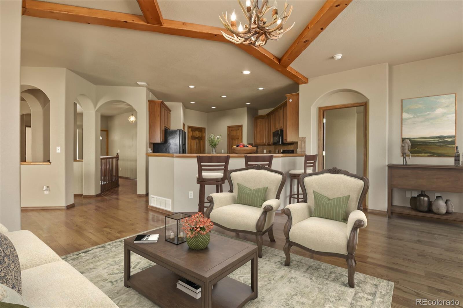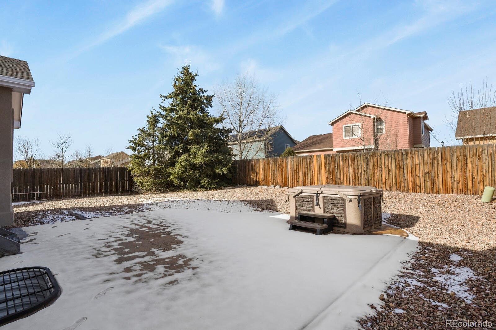 This is a beautifully designed semi-custom 4-bedroom, 3-bath home in the heart of Meridian Ranch. With just over 3,000 square feet, this property delivers the perfect blend of space, style, and functionality. Step inside to a main level highlighted by rich hardwood floors, high wood beamed ceilings and a layout designed for both easy living and effortless entertaining. The kitchen, dining, and living areas flow seamlessly, ideal for hosting, relaxing, or simply enjoying everyday life. Whether you're cooking a family meal or entertaining friends, the large open kitchen with pantry, has ample countertops, a center island and a breakfast bar. You'll find generously sized bedrooms throughout and a primary suite that truly feels like a retreat — the perfect mix of comfort and privacy. Need extra space? This floor plan delivers... offering room for guests, hobbies, or a home office. The finished basement expands your possibilities with a large rec room, guest space, or media zone. Perfect for movie nights, game days, or creating the ultimate hangout. Outside, enjoy Colorado living at its best with an oversized patio with your own private hot tub. The fully fenced low maintenance backyard is ready for summer barbecues, quiet mornings, or letting the kids and pets play freely. And of course, living in Meridian Ranch means you get so much more — miles of walking trails, a recreation center, pools, fitness facilities, parks, golf, and a community atmosphere that’s second to none. One of Peyton’s most desirable master-planned communities. If you’re looking for a home that checks all the boxes in a community that offers it all, this one is a must-see.