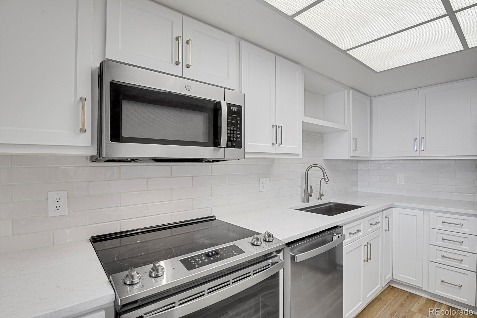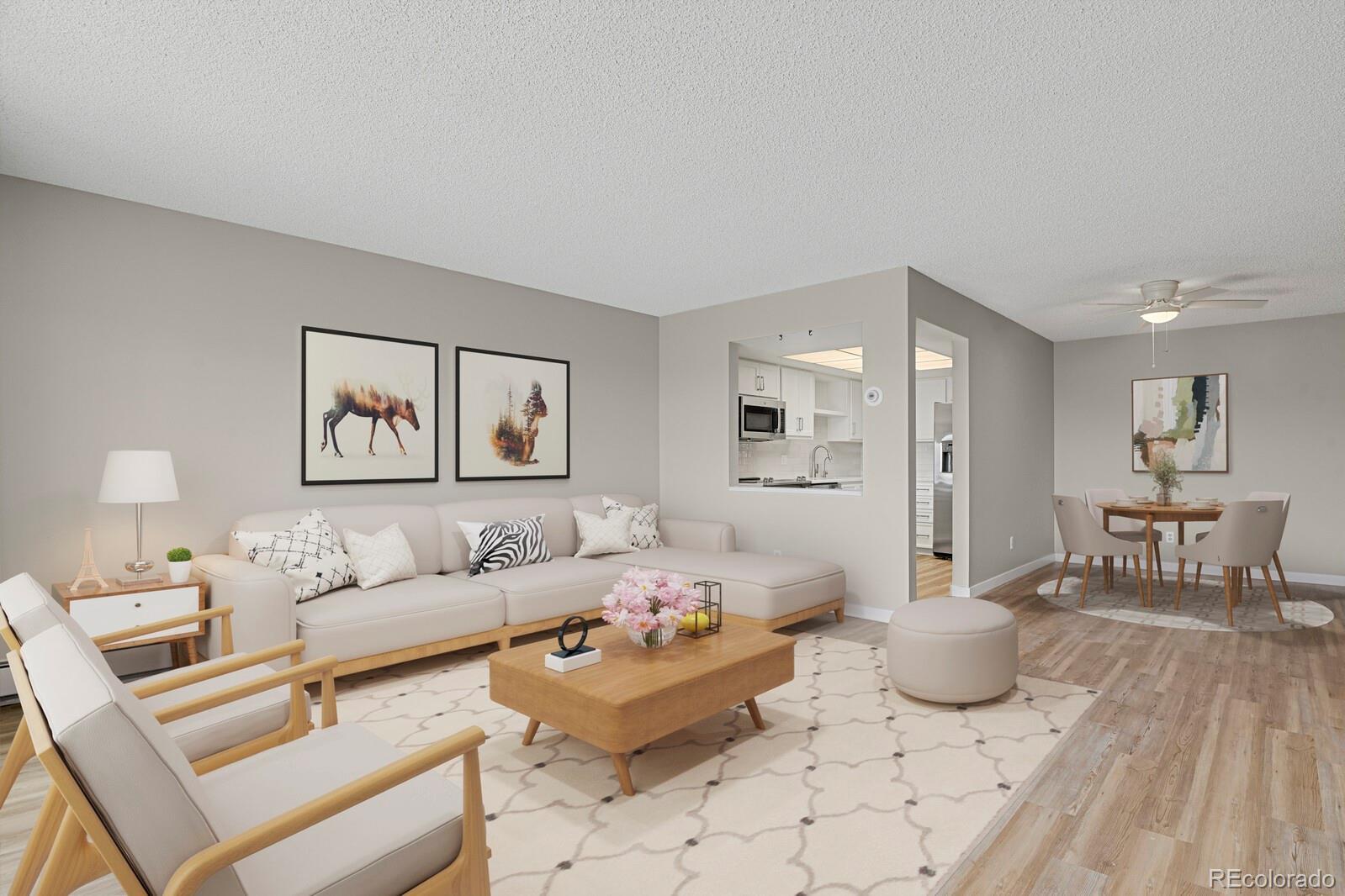 Welcome to Heather Gardens, Aurora’s premier 55+ active adult community! This beautifully updated top-floor penthouse condo offers 2 bedrooms, 2 bathrooms, and 1,200 sq. ft. of comfortable living space with stunning mountain and sunset views. The home features a bright and open layout with fresh interior paint, luxury vinyl plank flooring in the main living areas, and plush carpet in the bedrooms. The kitchen has been refreshed with quartz countertops, subway tile backsplash, modern cabinet hardware, and new GE stainless steel appliances. Both bathrooms include quartz countertops, updated vanities, and lighting. A private in-unit laundry closet adds everyday convenience. Relax in the enclosed lanai while enjoying panoramic views, or take advantage of the quiet privacy that comes with a top-floor location—no upstairs neighbors. Additional perks include reserved garage parking, elevator access, and a private storage unit. Heather Gardens offers true resort-style living with a clubhouse, indoor pool, fitness center, library, game room, golf course, tennis, walking trails, and a wide variety of community events and clubs. The HOA covers water, heat, exterior maintenance, and amenities, making your monthly expenses simple and predictable. This competitively priced penthouse at $299,000 combines modern updates, incredible views, and the best of active 55+ community living. Don’t miss this rare opportunity to own one of Heather Gardens’ most desirable residences!