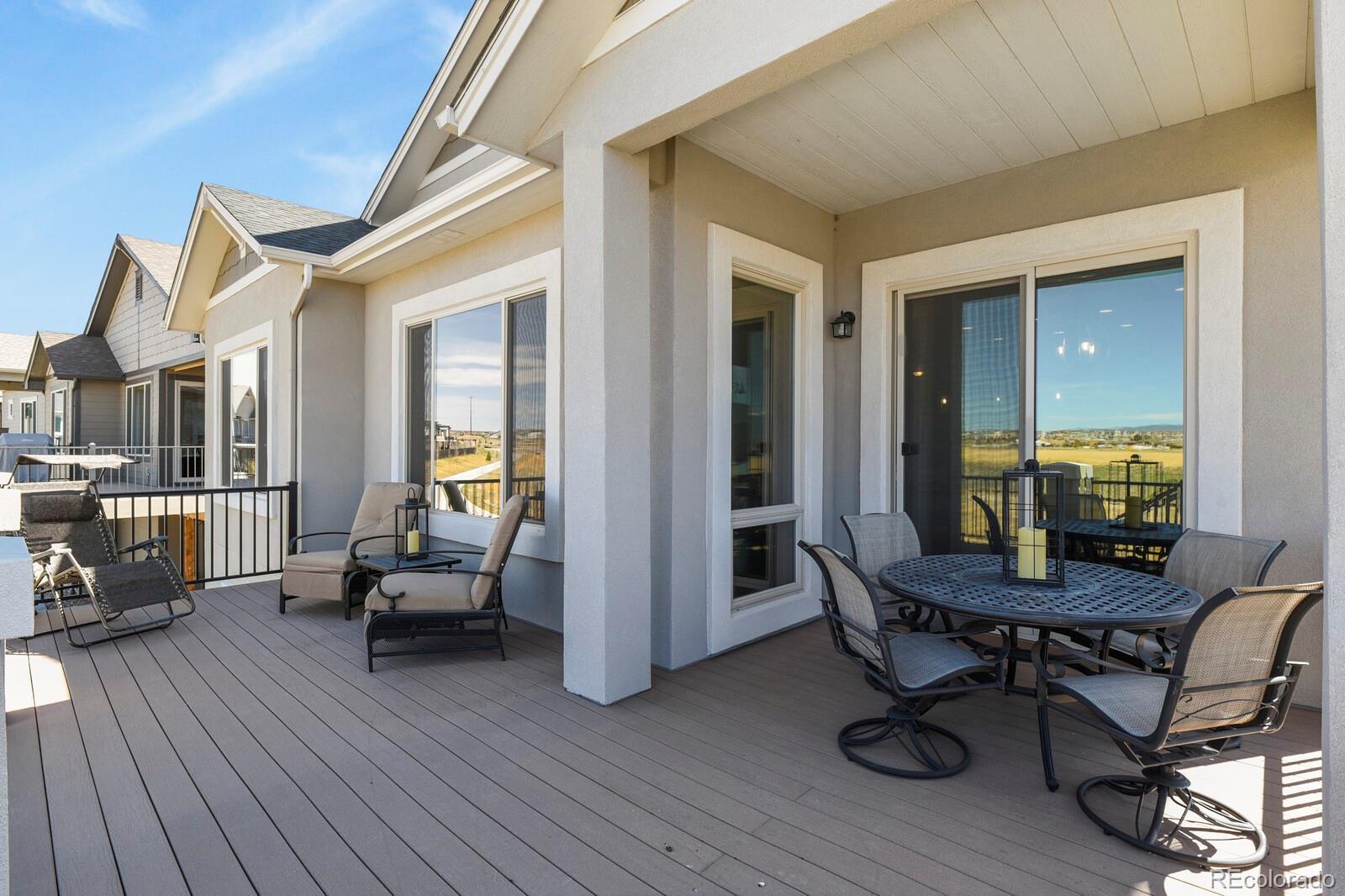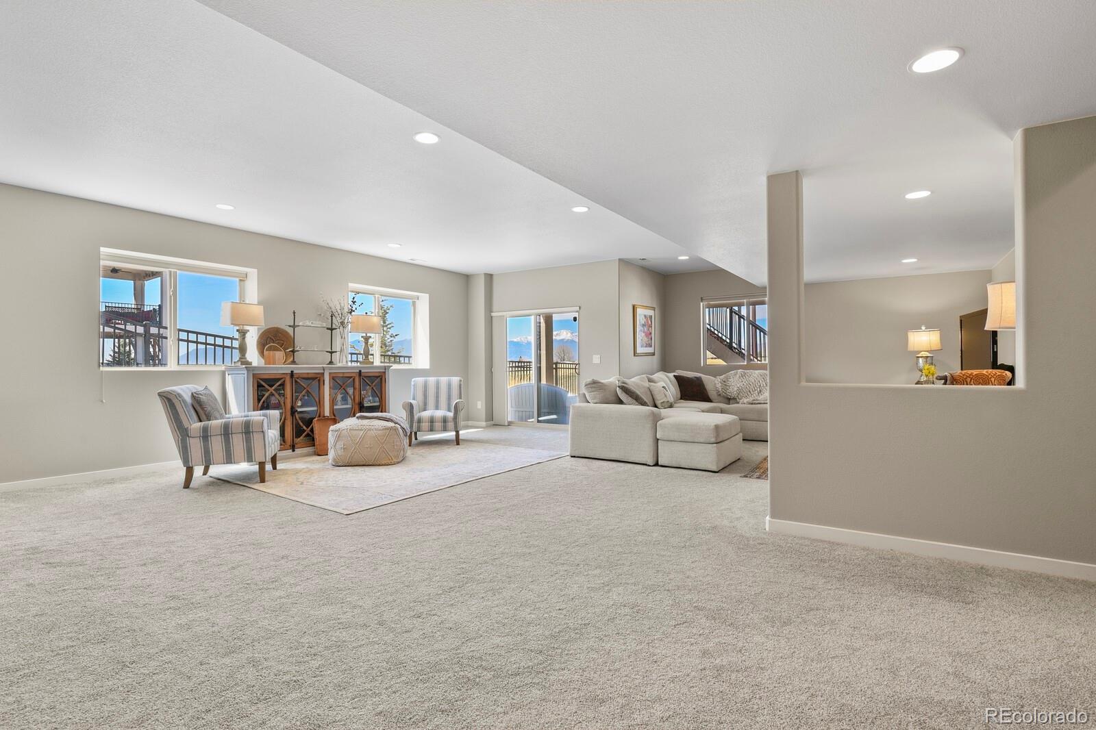 A one in a thousand home! A builder-upgraded Spec home. Stunning ranch with a walkout basement. 180 degree Million Dollar view of the mountain range from Cheyenne Mtn. to the north end mountains featuring Pikes Peak right in the middle. If you are not sitting on the expansive deck enjoying the view and the open space behind and to the side of the home, You will be enjoying Open Concept Main Level with full height windows to let the light and view into the home. Eat breakfast at the Oversized Granite Breakfast Bar / Island or sit at the table in the Dining Space which is large enough to hold an 8 guest dining table! Relax and enjoy the light or retire to the Basement Great Room with Stone Face Gas Fireplace with a Walnut Mantel. Of course you could sit outside on the Walkout Patio and the custom low maintenance Garden Area and the privacy allowed with Open Space Behind and to the side. Retire at night to the Main Bedroom that is Oversized ( no problem with California King size bed and dress set.) Enjoy a shower in the Frame Free Shower or soak in the Large Tub. If you own a lot of clothes you will love the Very Large Walk In Closet. Have guests? No problem! You have 3 more bedrooms to select from including an Oversize Guest Suite downstairs that also has an Oversize Walk In Closet. Plenty of Linen Closets and a Large Storage Room for the Christmas stuff and everything you need to store. On the weekend enjoy a good game of Pickle Ball on one of the 8 courts or take a swim or sit in the Hot Tub. No need to keep weight sets/exercise equipment in the home. There is a private Community Fitness Center just a short walk from the home. All of this in the quiet of a Full Fence and Gated 55plus Community. Just a few minutes to I-25 and yet you miss a lot the noise of the city. Shopping and the Air Bases & Airport are a short drive . A True One of A kind !